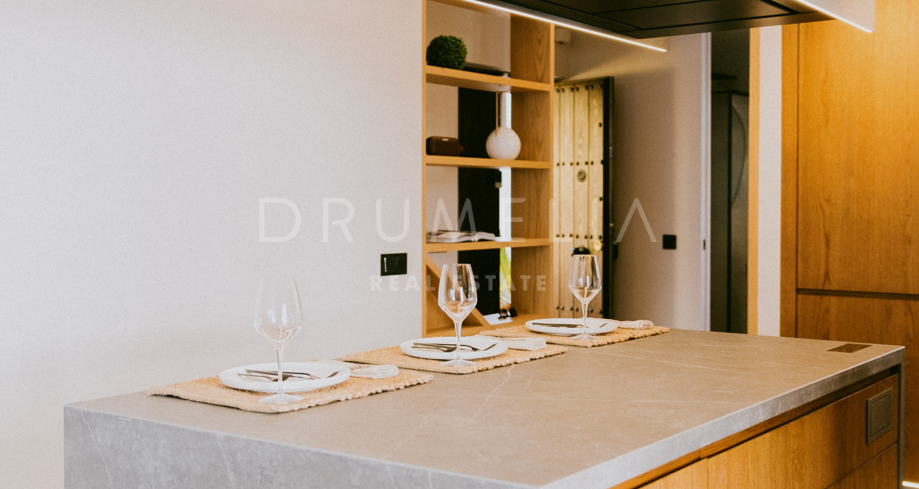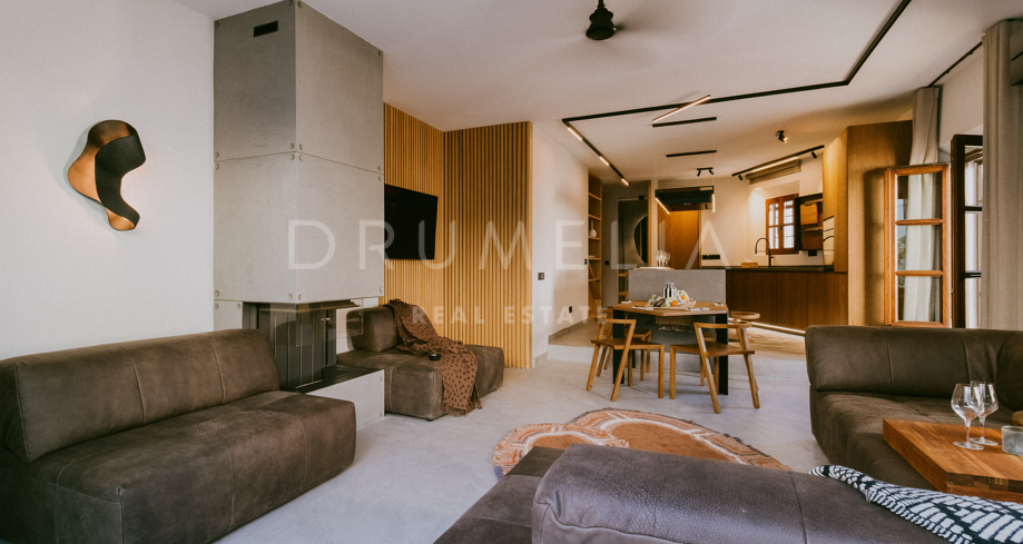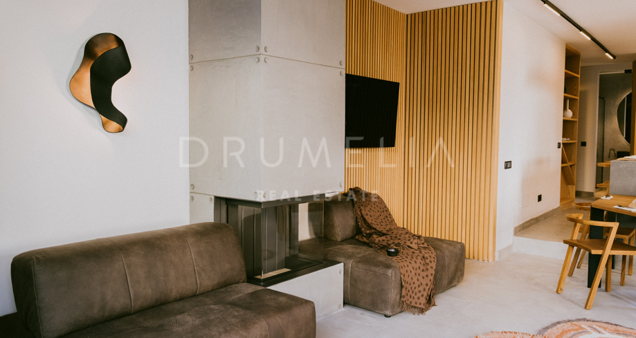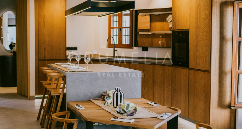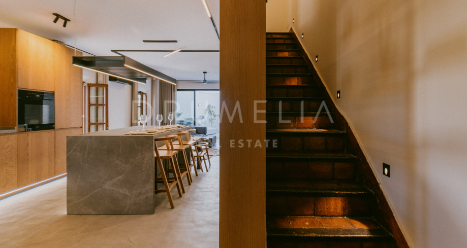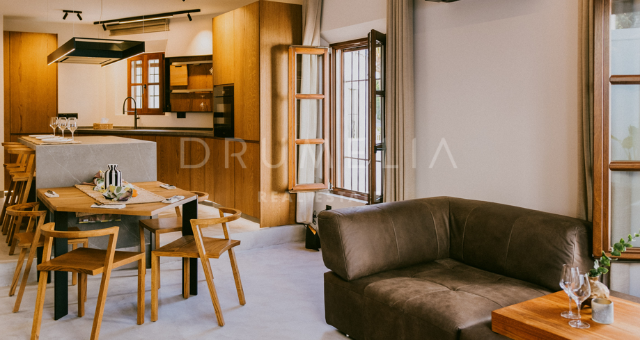 La planta principal alberga un elegante espacio de concepto abierto que integra salón y comedor, inundado de luz natural y presidido por una chimenea de leña que aporta calidez y carácter. Grandes puertas acristaladas conectan este espacio con un patio privado de estilo andaluz, ideal para relajarse al aire libre o disfrutar de momentos tranquilos en un entorno sereno. La cocina, de diseño contemporáneo, está equipada con electrodomésticos de alta gama y superficies elegantes, reflejando la calidad de la reforma y una cuidada atención al detalle.