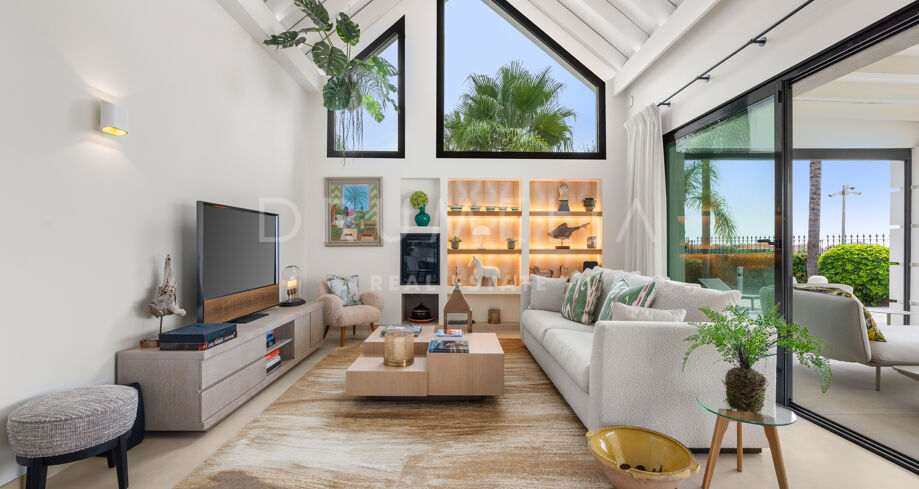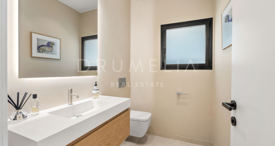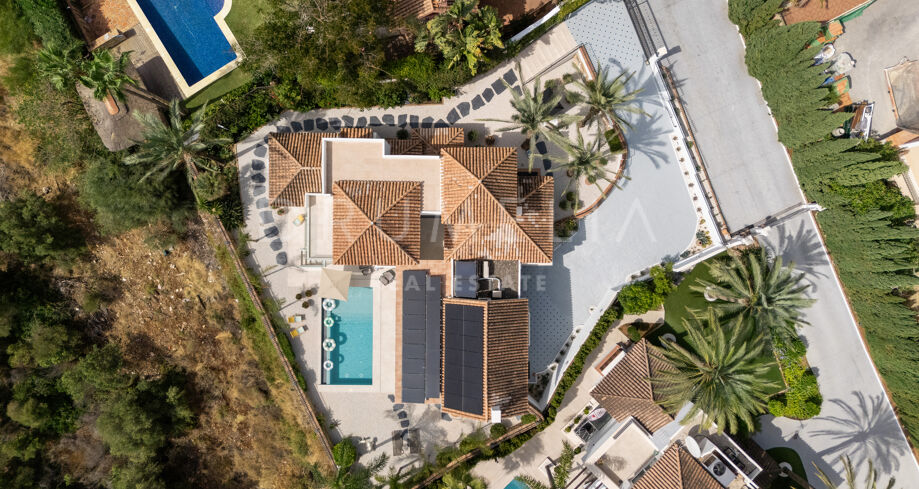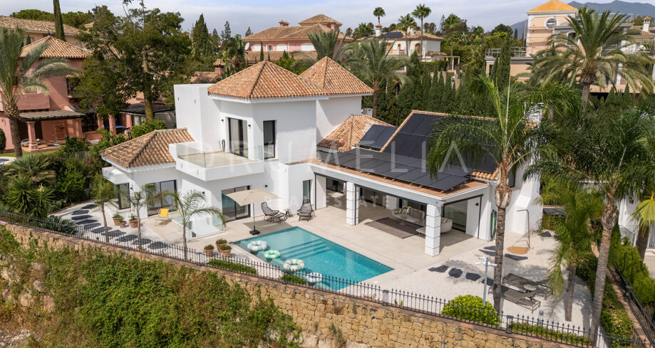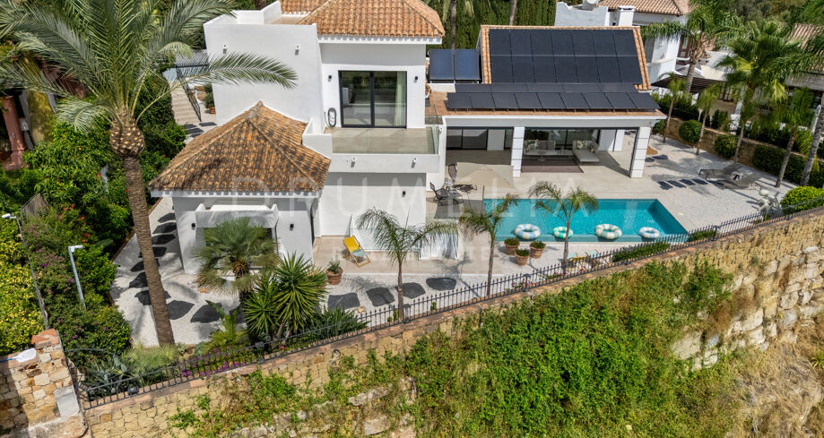 Ubicada en la prestigiosa zona de Las Lomas del Marbella Club, en la Milla de Oro, esta elegante villa combina confort moderno, privacidad y un estilo de vida interior–exterior fluido. En una parcela de 1.154 m² con 622 m² construidos, la vivienda ofrece interiores luminosos y abiertos, techos altos y grandes ventanales que conectan las principales zonas de estar directamente con las terrazas y la piscina. La villa es autosuficiente energéticamente gracias a paneles solares de alta calidad y un sistema de almacenamiento de baterías, y su jardín moderno y resistente a la sequía requiere un consumo mínimo de agua.