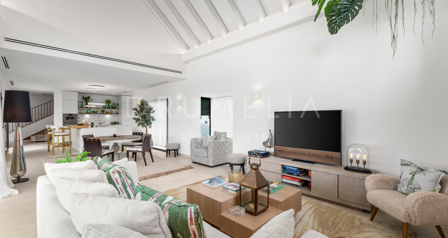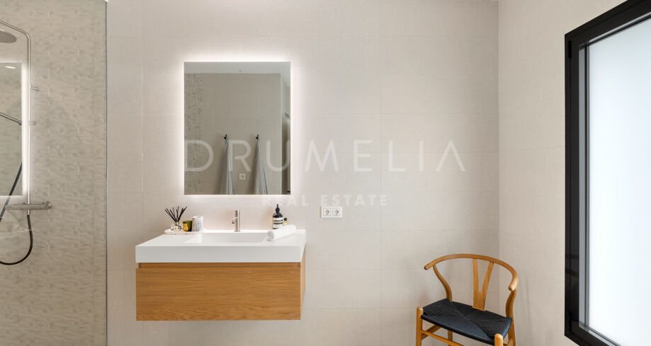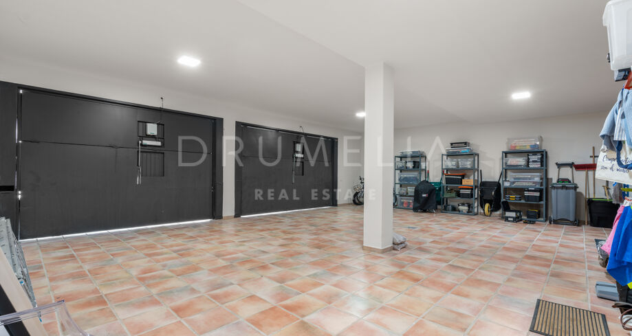 La distribución incluye un amplio salón y comedor junto a una cocina abierta de diseño con zona informal de desayuno, cuatro dormitorios confortables y cuatro baños. La cocina es de la firma Bulthaup y está equipada con electrodomésticos Bora y Gaggenau, reflejando el uso de marcas de alta gama en toda la propiedad. Complementando la vivienda principal, la propiedad dispone de una sala adicional polivalente o de entretenimiento y un gran garaje privado con capacidad para hasta cuatro coches. En el exterior, los jardines ajardinados, amplias terrazas y una piscina privada crean un entorno relajado ideal para el día a día y para recibir invitados.