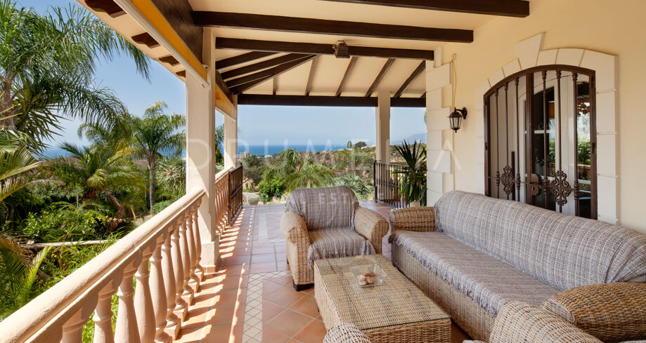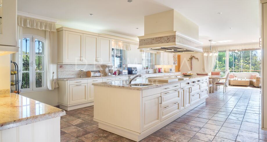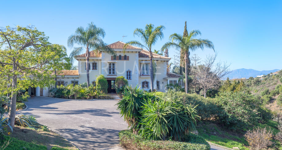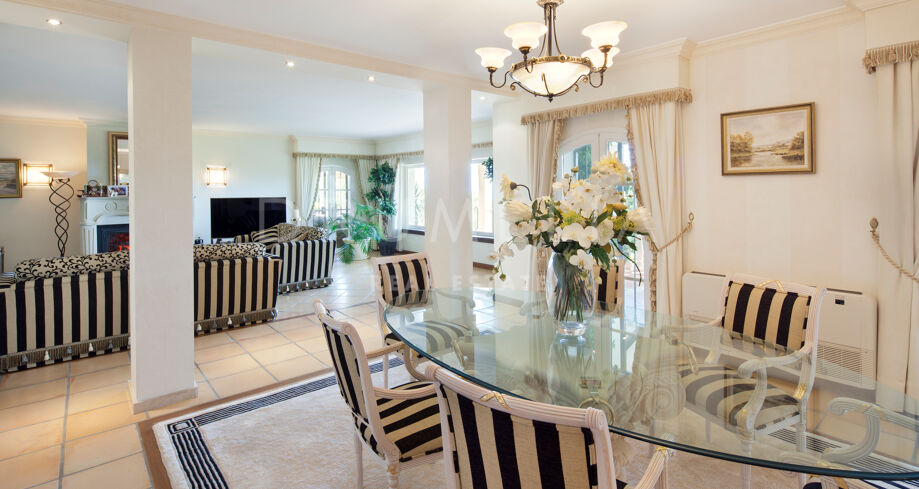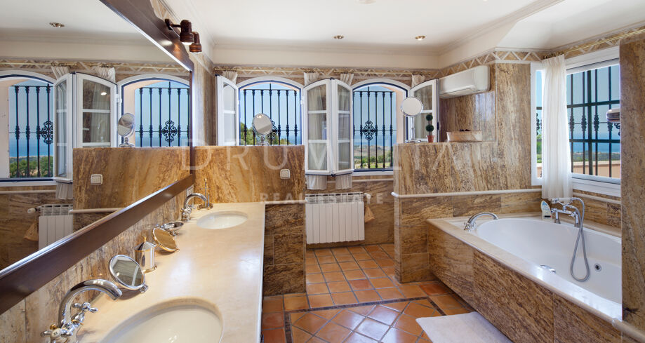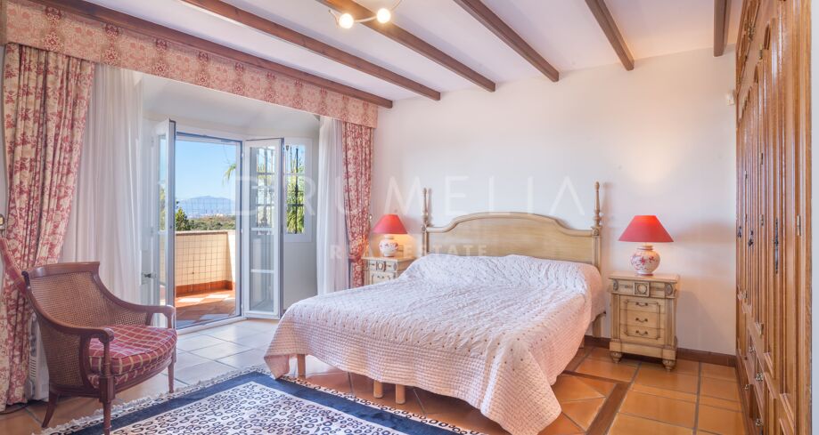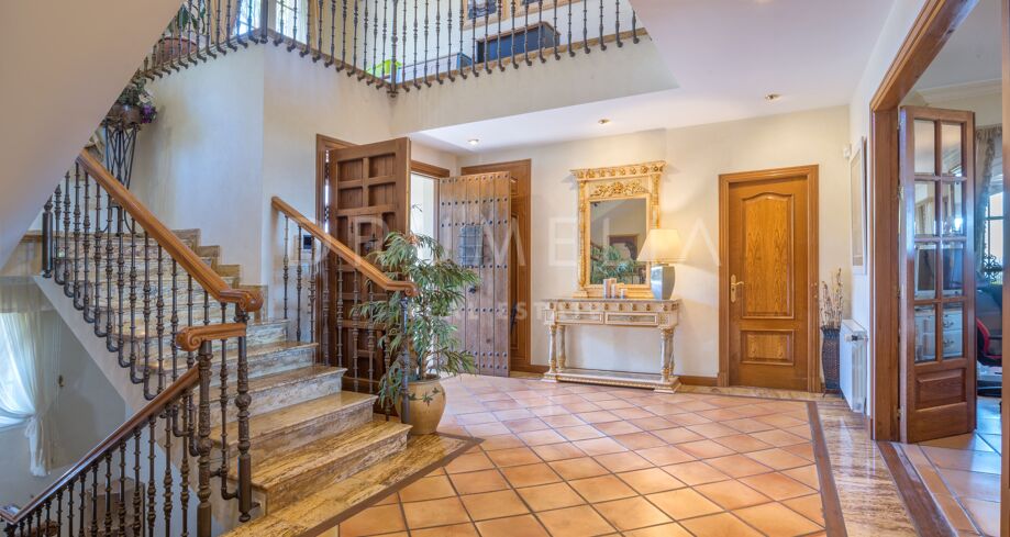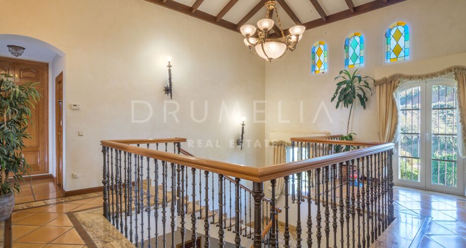 El interior de esta magnífica casa en venta en Los Altos de los Monteros es elegante y de buen gusto, con muebles cuidadosamente seleccionados y accesorios perfectamente combinados. Ofrece comodidad, estilo y un ambiente acogedor de lujo clásico. Hay una casa de invitados independiente y un aparcamiento cubierto. Las lujosas características, el bello paisaje y el ambiente relajante garantizarán los inolvidables placeres de vivir en esta impresionante villa mediterránea.