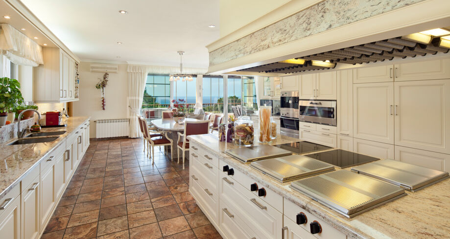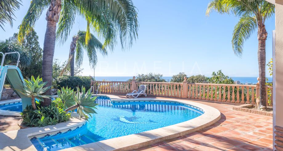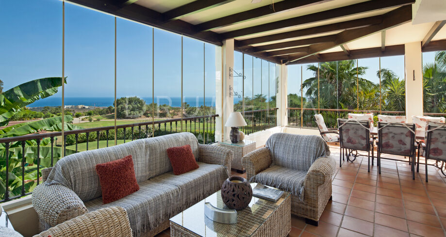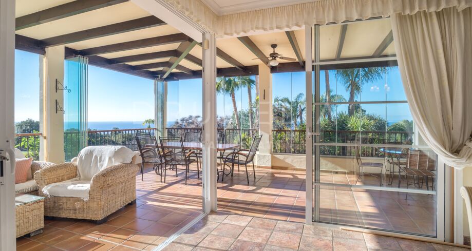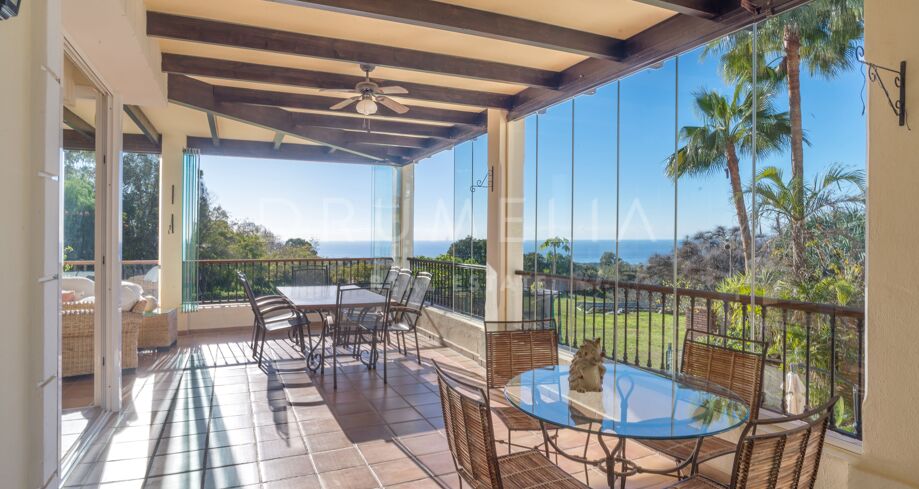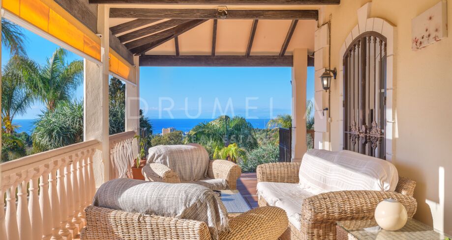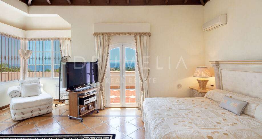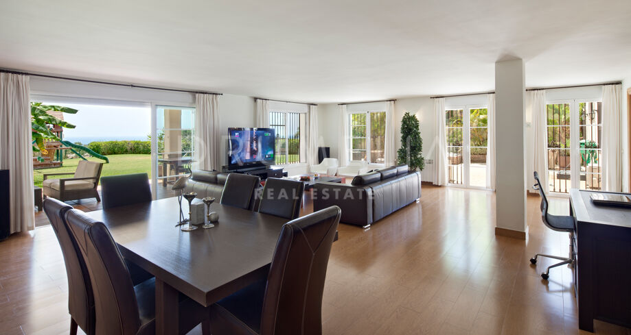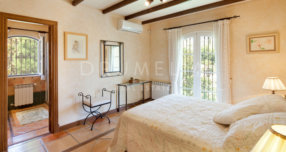 El interior de esta magnífica casa en venta en Los Altos de los Monteros es elegante y de buen gusto, con muebles cuidadosamente seleccionados y accesorios perfectamente combinados. Ofrece comodidad, estilo y un ambiente acogedor de lujo clásico. Hay una casa de invitados independiente y un aparcamiento cubierto. Las lujosas características, el bello paisaje y el ambiente relajante garantizarán los inolvidables placeres de vivir en esta impresionante villa mediterránea.