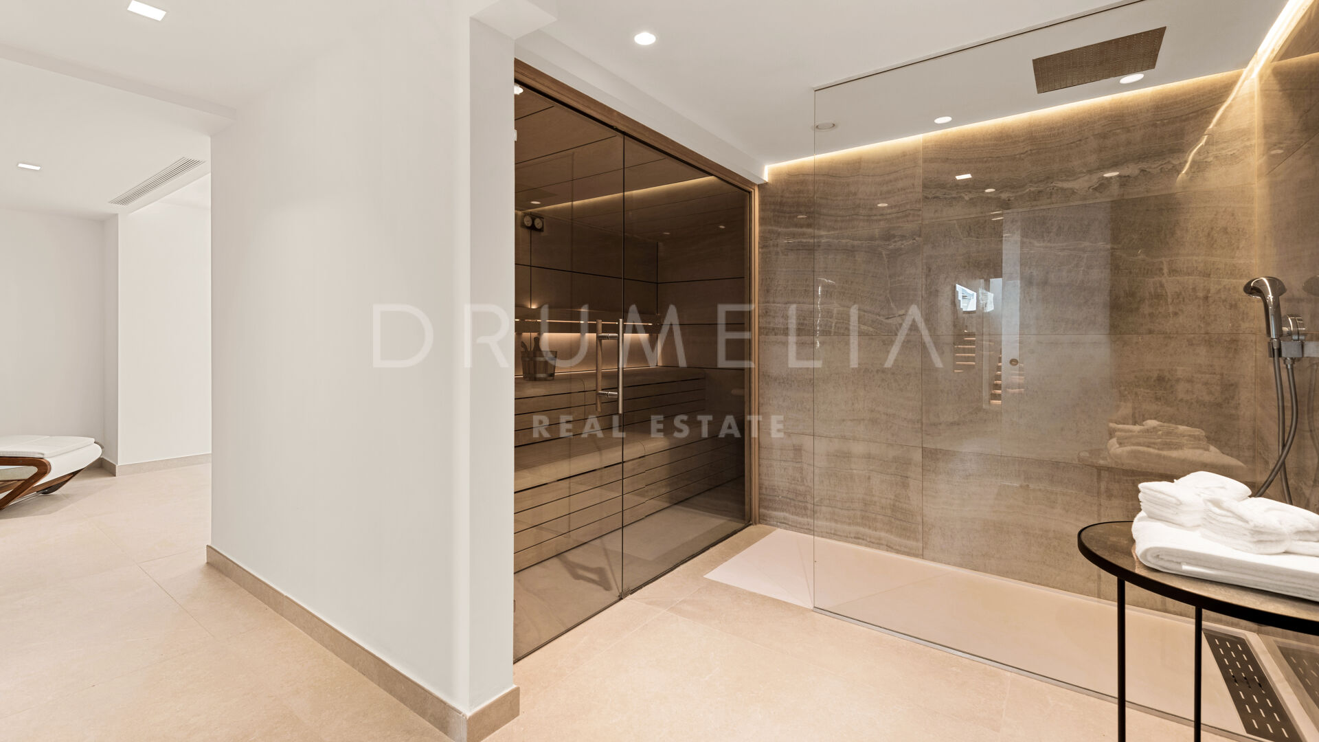 La villa está equipada con una habitación de invitados, un gimnasio y un sistema de alarma, lo que garantiza la máxima comodidad y seguridad. Disfrute del lujo de un solarium, donde podrá relajarse y empaparse de las impresionantes vistas panorámicas del mar, el campo y el golf.