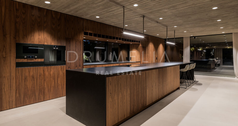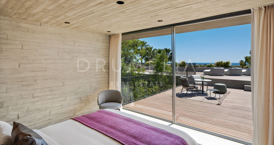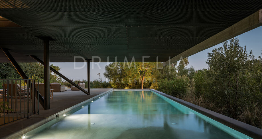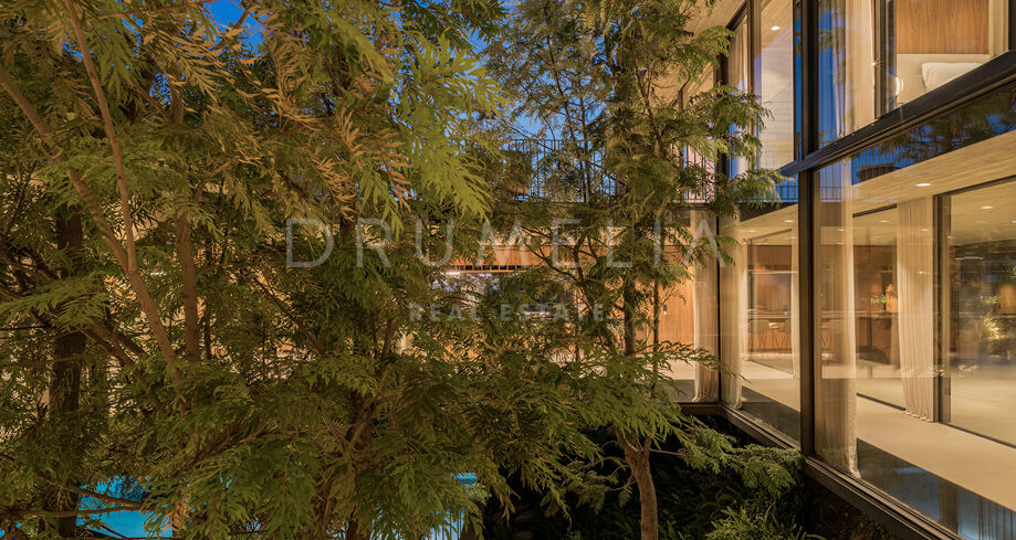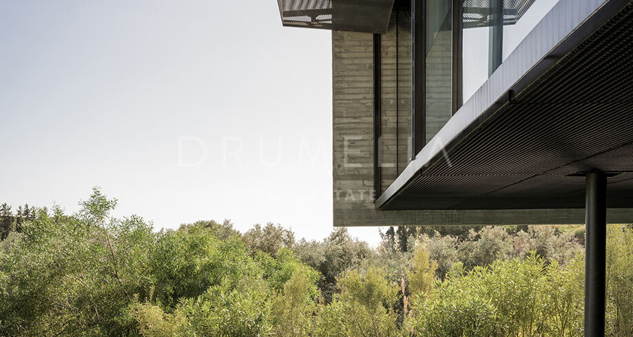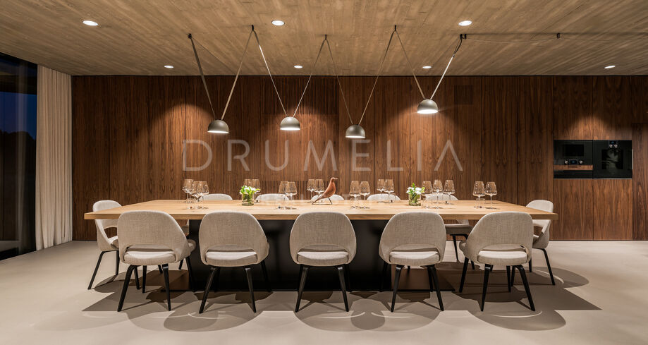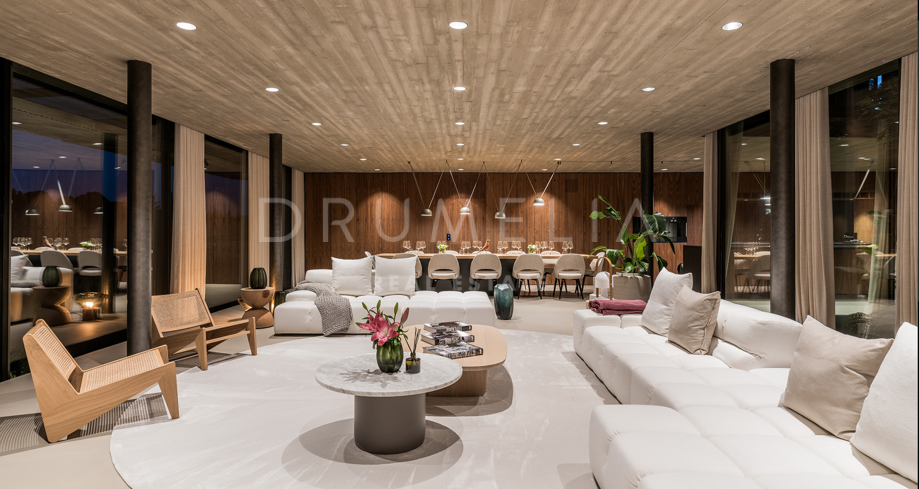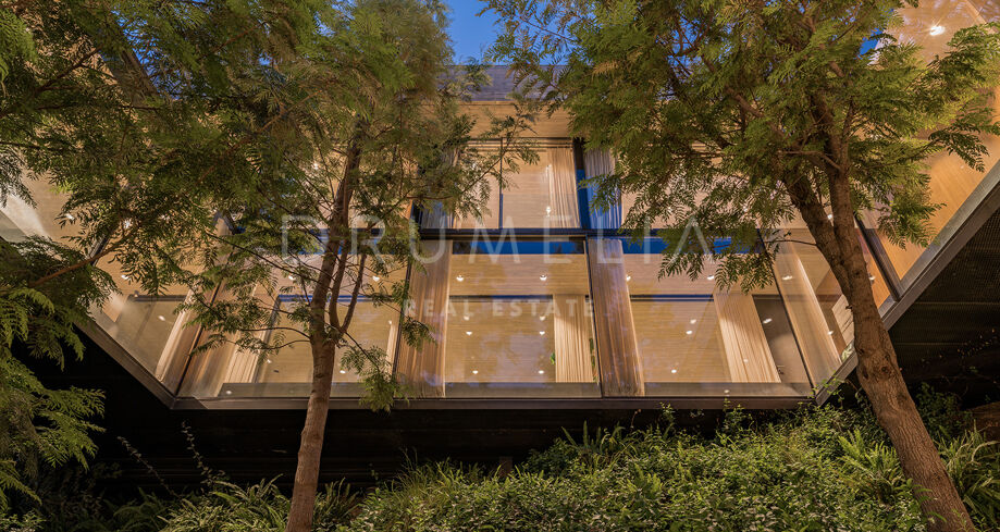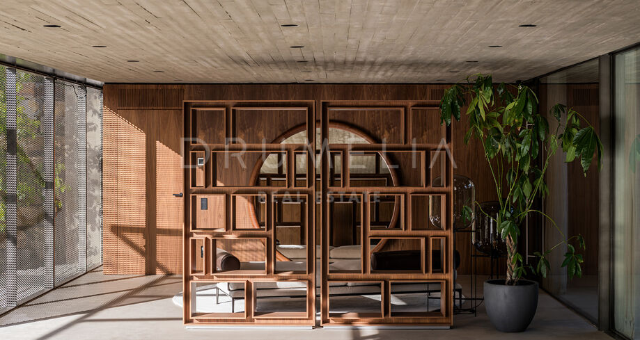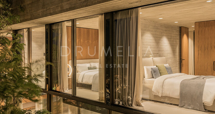 La arquitectura se distingue por el uso de la luz, el espacio y los paisajes naturales, que se integran perfectamente en el entorno. Su distribución está estratégicamente diseñada para aprovechar la irregularidad del terreno, ofreciendo diversas vistas y creando una sensación de refugio y privacidad. El interior cuenta con amplias zonas de estar, una cocina totalmente equipada, cinco serenos dormitorios y cuatro elegantes cuartos de baño. Las características especiales incluyen un jardín interior y aberturas estratégicas que maximizan las vistas al exterior y garantizan un flujo de luz natural.
