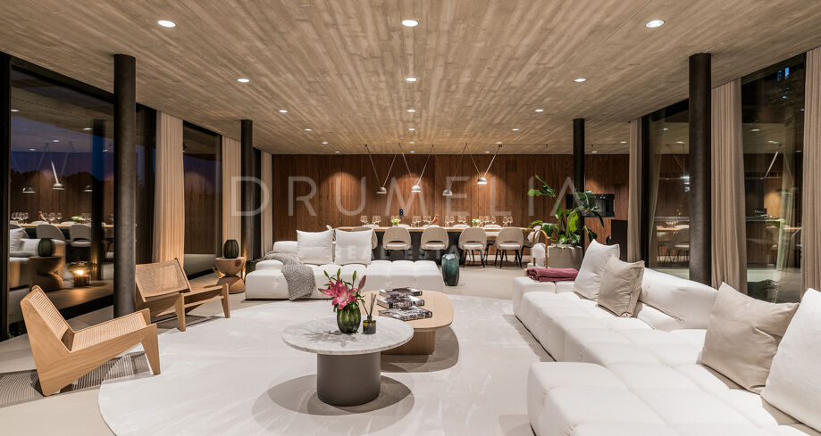 Esta villa de 5 dormitorios está a la venta en el barrio privado de Flamingos II, Benahavís, una zona tranquila y exclusiva de la Costa del Sol. Situada en una parcela elevada de 1927 m², esta propiedad ofrece impresionantes vistas panorámicas al mar Mediterráneo y a los campos de golf cercanos. La villa, con una superficie habitable de 1571 m², es conocida por su diseño arquitectónico único que combina modernidad con elementos tradicionales, haciendo hincapié en los volúmenes limpios y un patio central que realza las vistas cruzadas.