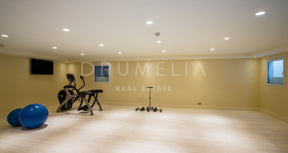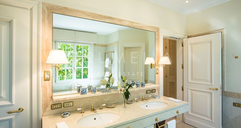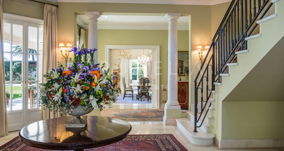A solo unos pasos del mar, en la exclusiva zona de Los Monteros en Marbella Este, esta elegante propiedad combina arquitectura clásica con un estilo de vida relajado junto al mar. El recibidor da la bienvenida con columnas imponentes, iluminación cálida y una mesa central con flores frescas, creando una atmósfera refinada y acogedora.