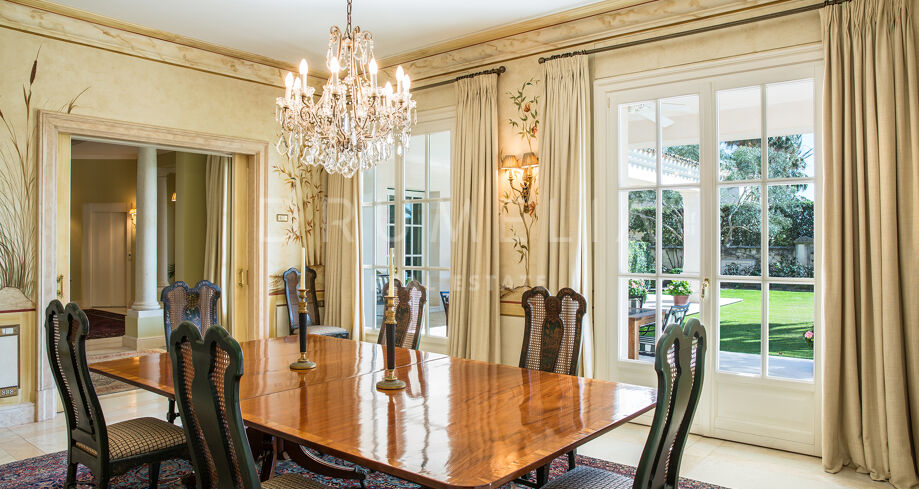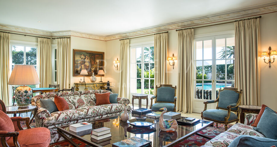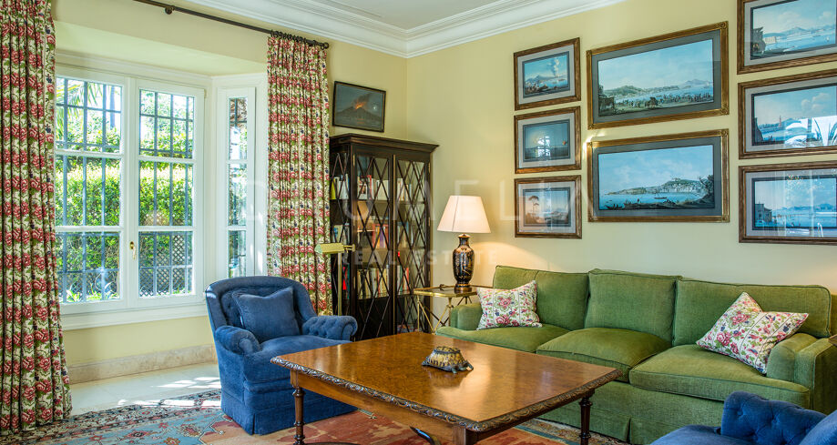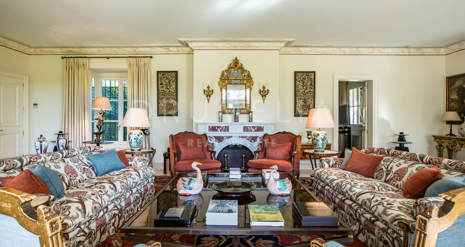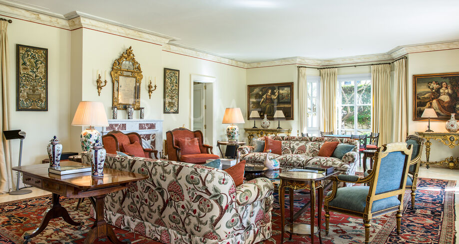 Las zonas de estar son amplias y luminosas, con grandes ventanales y puertas francesas que se abren al jardín, dejando entrar abundante luz natural. El salón principal combina mobiliario tradicional, tejidos ricos y obras de arte cuidadosamente seleccionadas, creando un espacio cómodo y elegante.