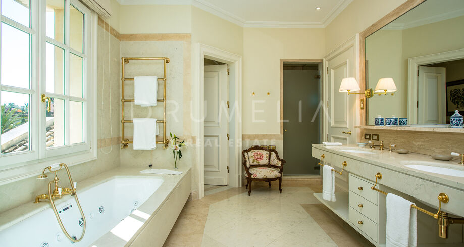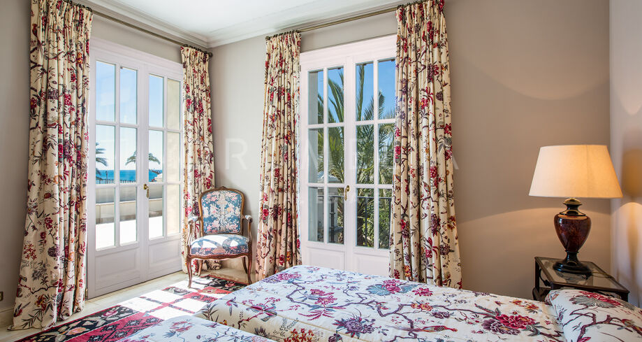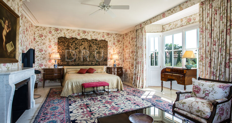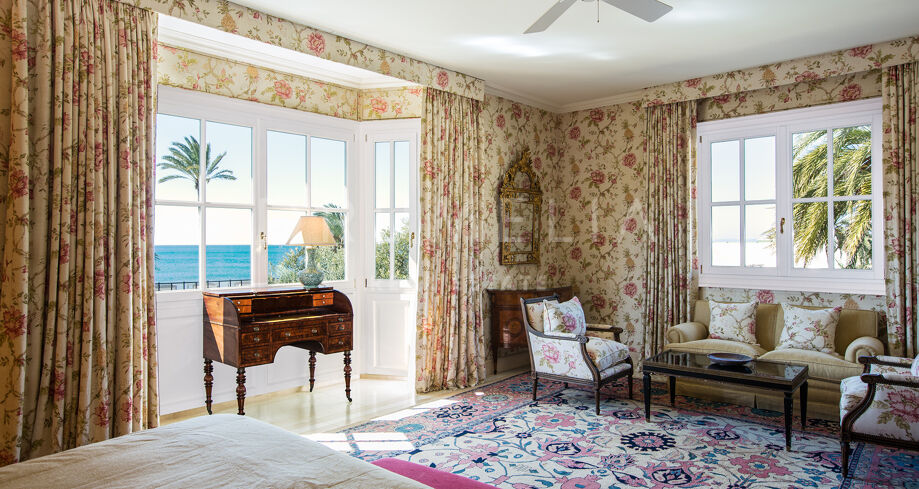 En la planta superior, el dormitorio principal disfruta de mucha luz natural y vistas al mar. Los textiles florales y los tonos suaves aportan una sensación de calma. El baño en suite cuenta con acabados en mármol, lavabos dobles, una amplia bañera y detalles clásicos en latón.