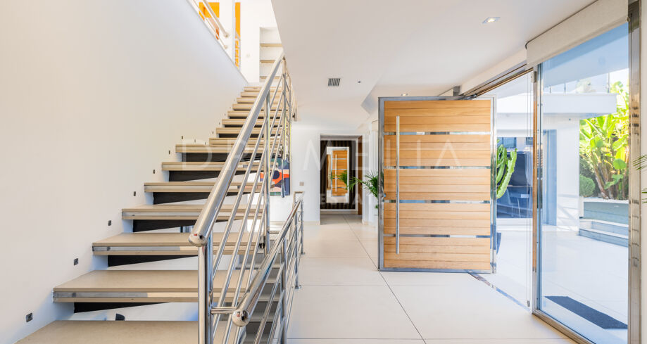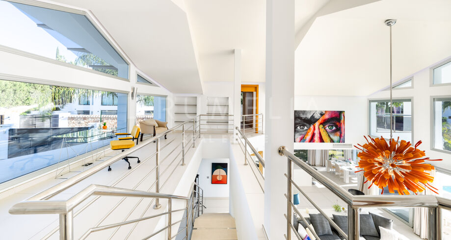 Esta elegante casa moderna de 6 dormitorios con cautivadoras vistas panorámicas al famoso Valle del Golf y un entorno de ensueño se ofrece a la venta en una urbanización cerrada de Nueva Andalucía, Marbella. Está situada en una calle tranquila, muy cerca del prestigioso Club de Golf Los Naranjos, diseñado por el legendario arquitecto de golf Robert Trent Jones. Rodeado de hermosa naturaleza, los mejores clubes de golf y propiedades de alta gama de Nueva Andalucía, cuenta con una ubicación muy conveniente con todas las comodidades cerca. Vivirá cerca de los supermercados locales, bancos, gimnasios, restaurantes, bares y cafés orgánicos, Centro Comercial Centro Plaza, casino, varias escuelas internacionales y el popular mercado al aire libre de los sábados. Las playas de bandera azul, boutiques de diseño, El Corte Inglés, yates, playa y clubes nocturnos del mundialmente famoso Puerto Banús están a sólo unos minutos.