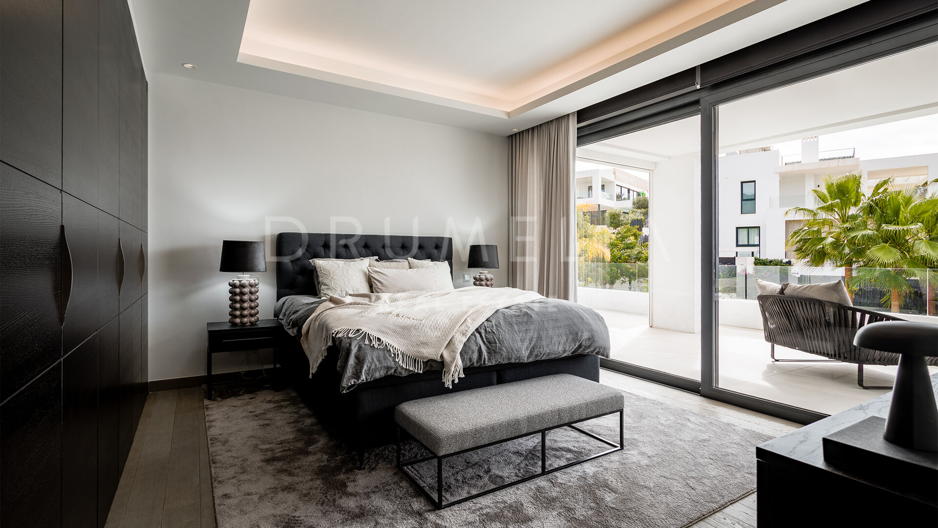 Arriba, tendrás 2 dormitorios de invitados con fabulosas vistas al Valle del Golf; una impresionante suite principal con vestidor y una terraza envolvente, que también disfruta de las agradables vistas. El nivel inferior ofrece otro dormitorio de invitados con baño en suite y un garaje para 2 coches. Existe la posibilidad de añadir un gimnasio.