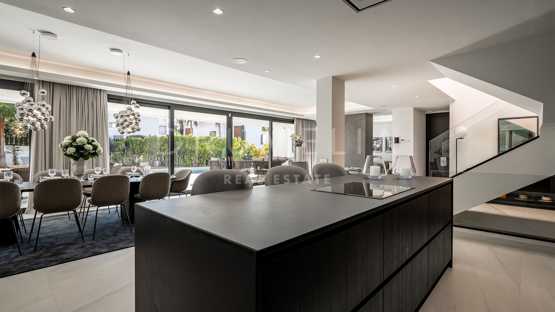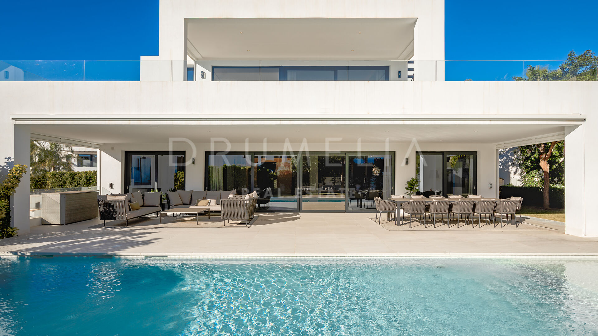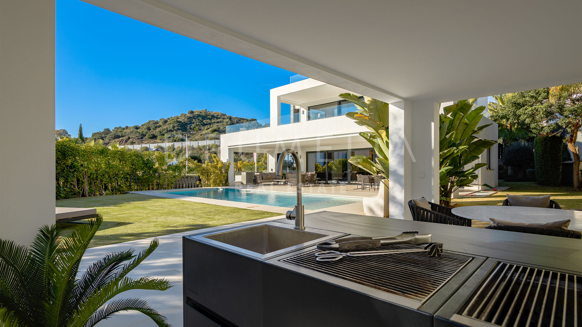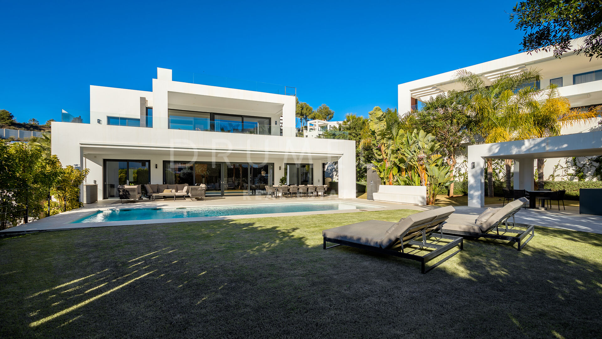 Rodeada de hermosa naturaleza y propiedades de lujo similares, la propiedad de 3 niveles orientada al sur goza de serenas vistas sobre un entorno de ensueño. Ubicada en una parcela de 1.070 m², la casa de 571 m² tiene 7 dormitorios, sótano y solárium, y presta especial atención al cálido clima mediterráneo, con muchas zonas exteriores para sentarse, cuidadosamente sombreadas y perfectas para relajarse. La moderna villa tiene una estética muy limpia y minimalista, con un sencillo exterior blanco y una elegante paleta de colores neutros en el interior. Su moderno diseño interior combina a la perfección con la arquitectura contemporánea. La distribución es cómoda y ha sido cuidadosamente pensada para satisfacer las altas expectativas. La casa consta, en la planta principal, de: un espacioso y elegante salón con varias zonas de estar y biochimenea; una elegante cocina abierta totalmente equipada con electrodomésticos de gama alta, isla central y nevera para vinos, y una zona de comedor; 1 dormitorio de invitados en suite; acceso a los porches, terrazas, cocina exterior y piscina. El jardín subtropical, cuidadosamente ajardinado, tiene césped verde y plantas maduras que rodean la propiedad y crean privacidad.