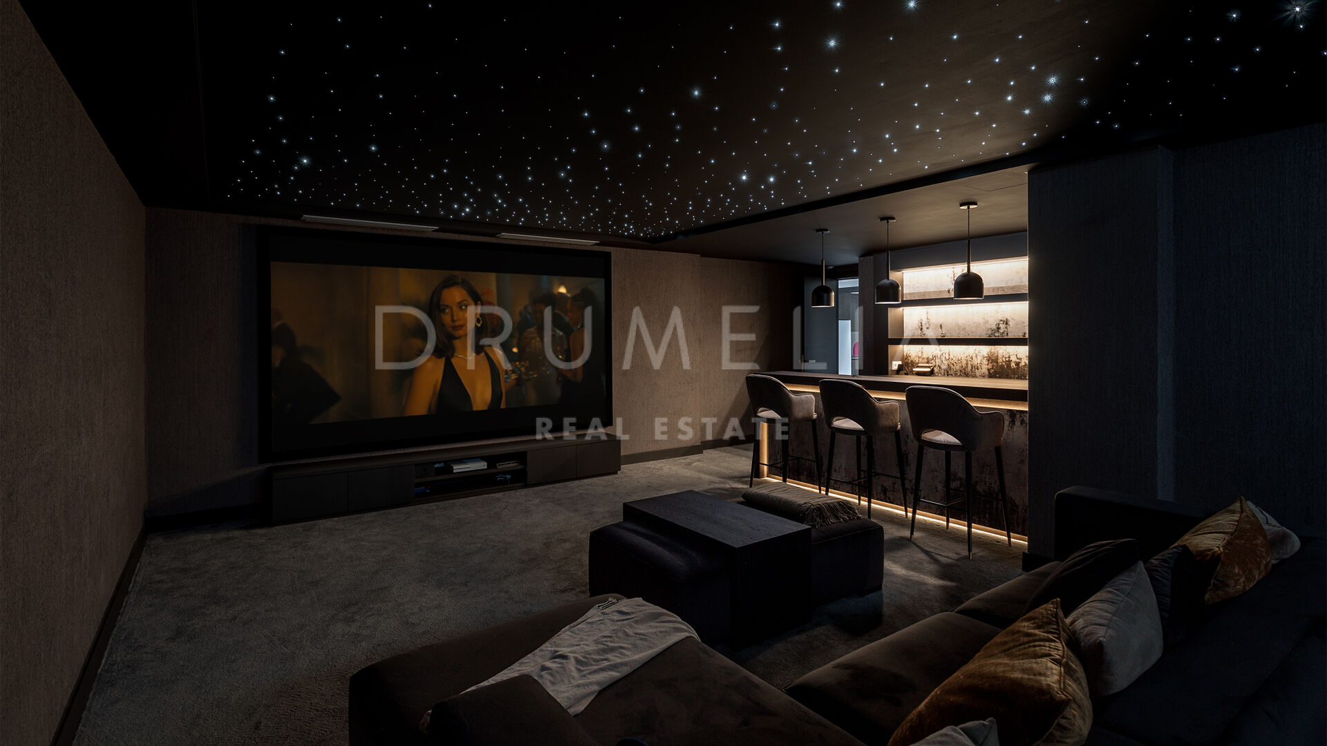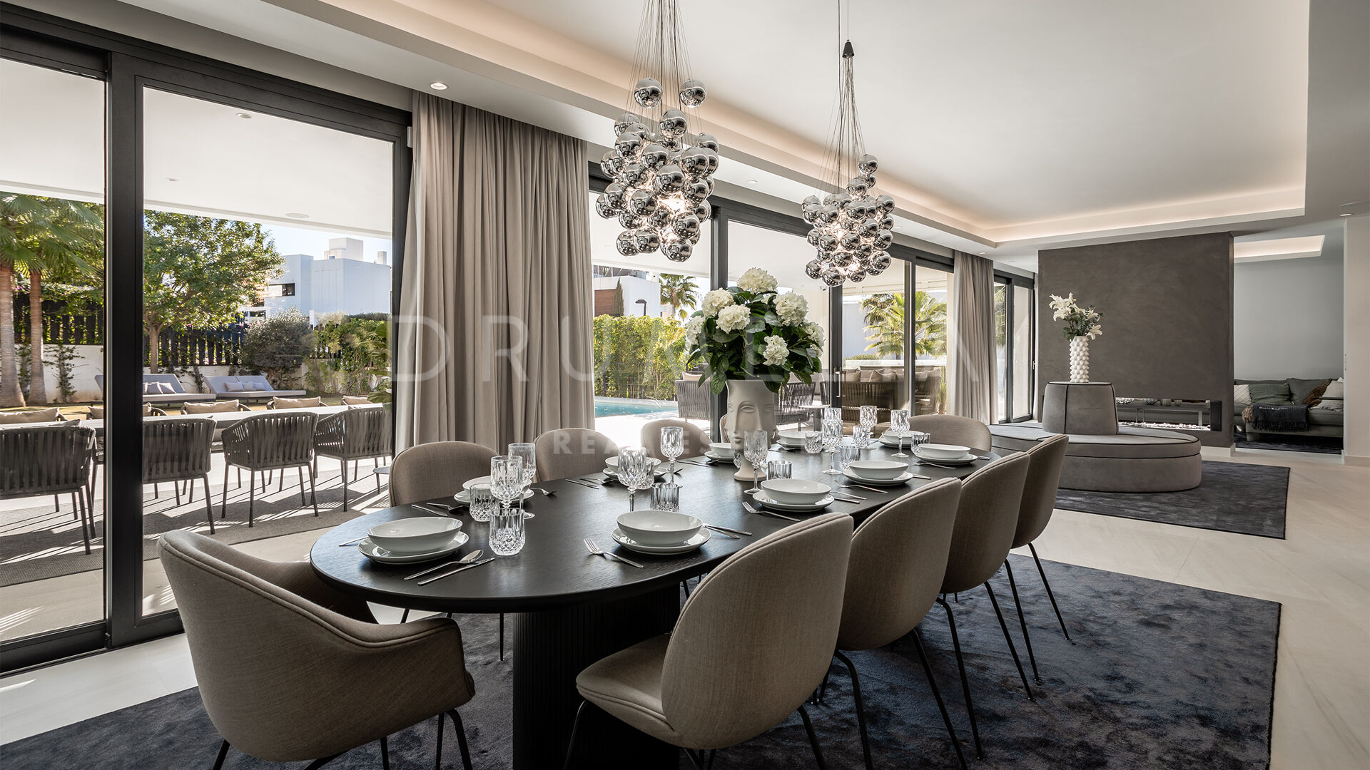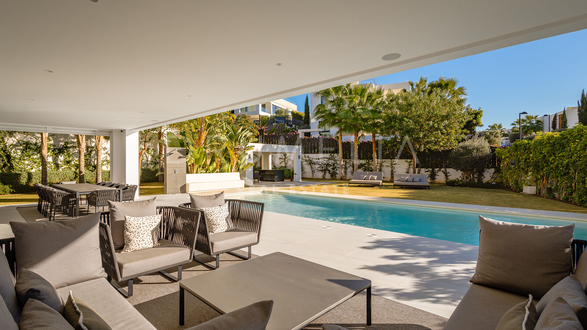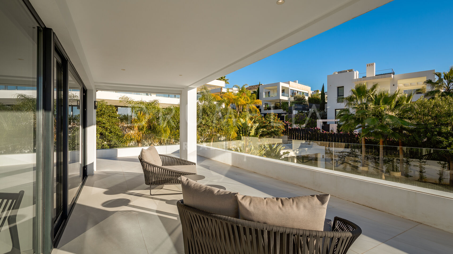 Rodeada de hermosa naturaleza y propiedades de lujo similares, la propiedad de 3 niveles orientada al sur goza de serenas vistas sobre un entorno de ensueño. Ubicada en una parcela de 1.070 m², la casa de 571 m² tiene 7 dormitorios, sótano y solárium, y presta especial atención al cálido clima mediterráneo, con muchas zonas exteriores para sentarse, cuidadosamente sombreadas y perfectas para relajarse. La moderna villa tiene una estética muy limpia y minimalista, con un sencillo exterior blanco y una elegante paleta de colores neutros en el interior. Su moderno diseño interior combina a la perfección con la arquitectura contemporánea. La distribución es cómoda y ha sido cuidadosamente pensada para satisfacer las altas expectativas. La casa consta, en la planta principal, de: un espacioso y elegante salón con varias zonas de estar y biochimenea; una elegante cocina abierta totalmente equipada con electrodomésticos de gama alta, isla central y nevera para vinos, y una zona de comedor; 1 dormitorio de invitados en suite; acceso a los porches, terrazas, cocina exterior y piscina. El jardín subtropical, cuidadosamente ajardinado, tiene césped verde y plantas maduras que rodean la propiedad y crean privacidad.