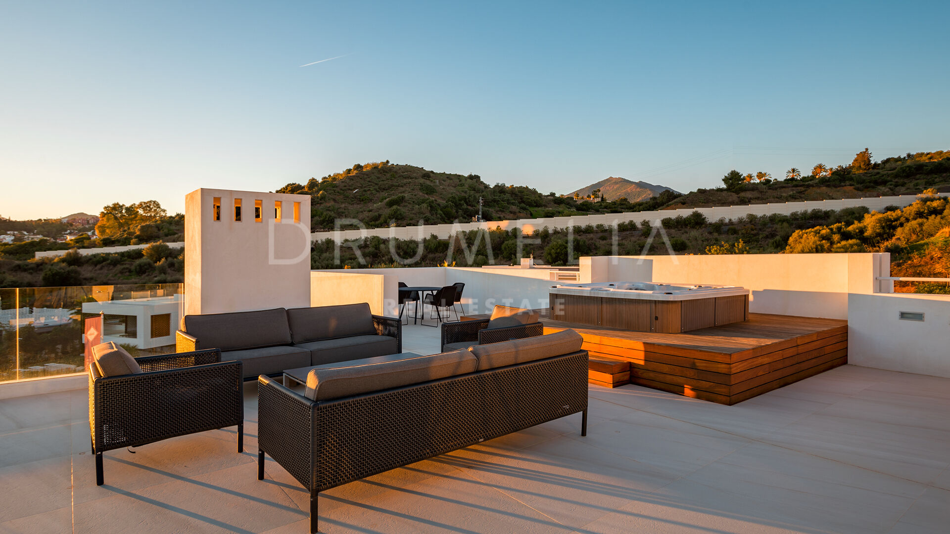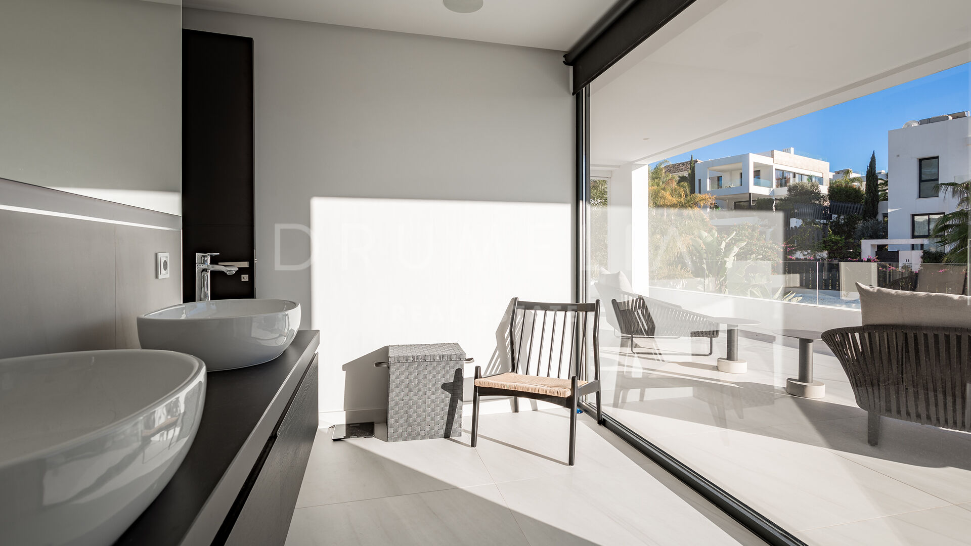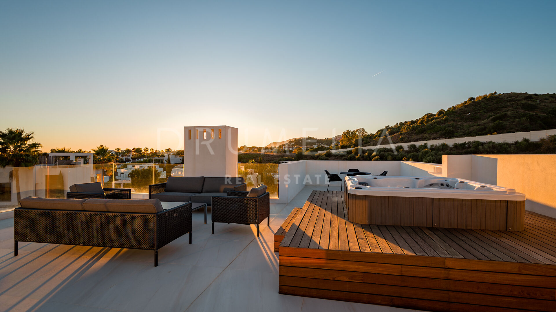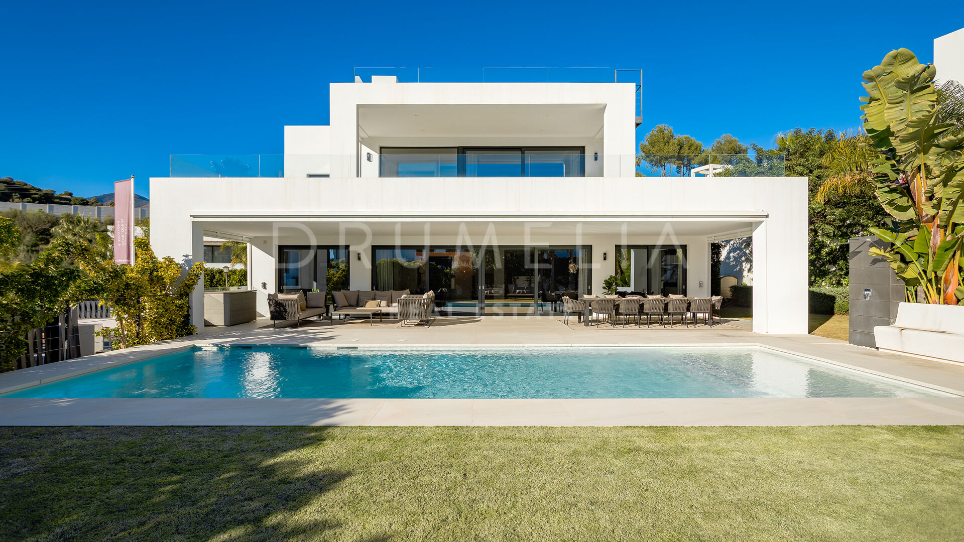 Construida con las mejores especificaciones y acabados en 2017, esta villa de lujo de estilo contemporáneo se pone a la venta en una prestigiosa ubicación en el famoso Valle del Golf, Nueva Andalucía, con el espectacular telón de fondo de la emblemática montaña de La Concha de Marbella. Los Olivos es una exclusiva comunidad de estilo boutique. El tranquilo complejo cerrado con seguridad 24 h garantiza a sus residentes total privacidad y proximidad a todos los servicios. Está a sólo unos minutos de los excelentes campos de golf, varios colegios internacionales, magníficas experiencias gastronómicas, playas de Bandera Azul y el chic de Puerto Banús.