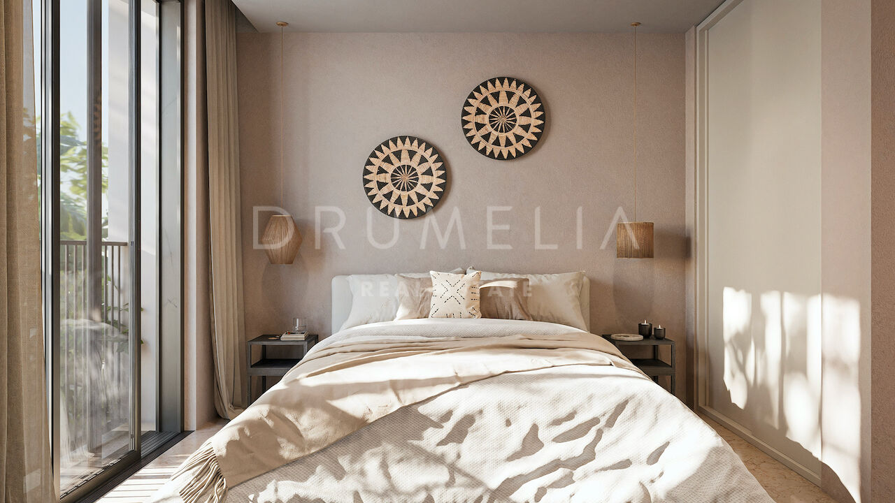 El dormitorio principal en suite, con zona de vestidor, también tiene acceso directo a la terraza. Los dos dormitorios de invitados comparten un baño amplio. En el aseo de cortesía se ha instalado una práctica zona de lavandería totalmente equipada.