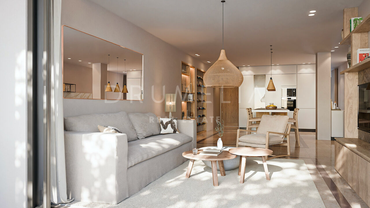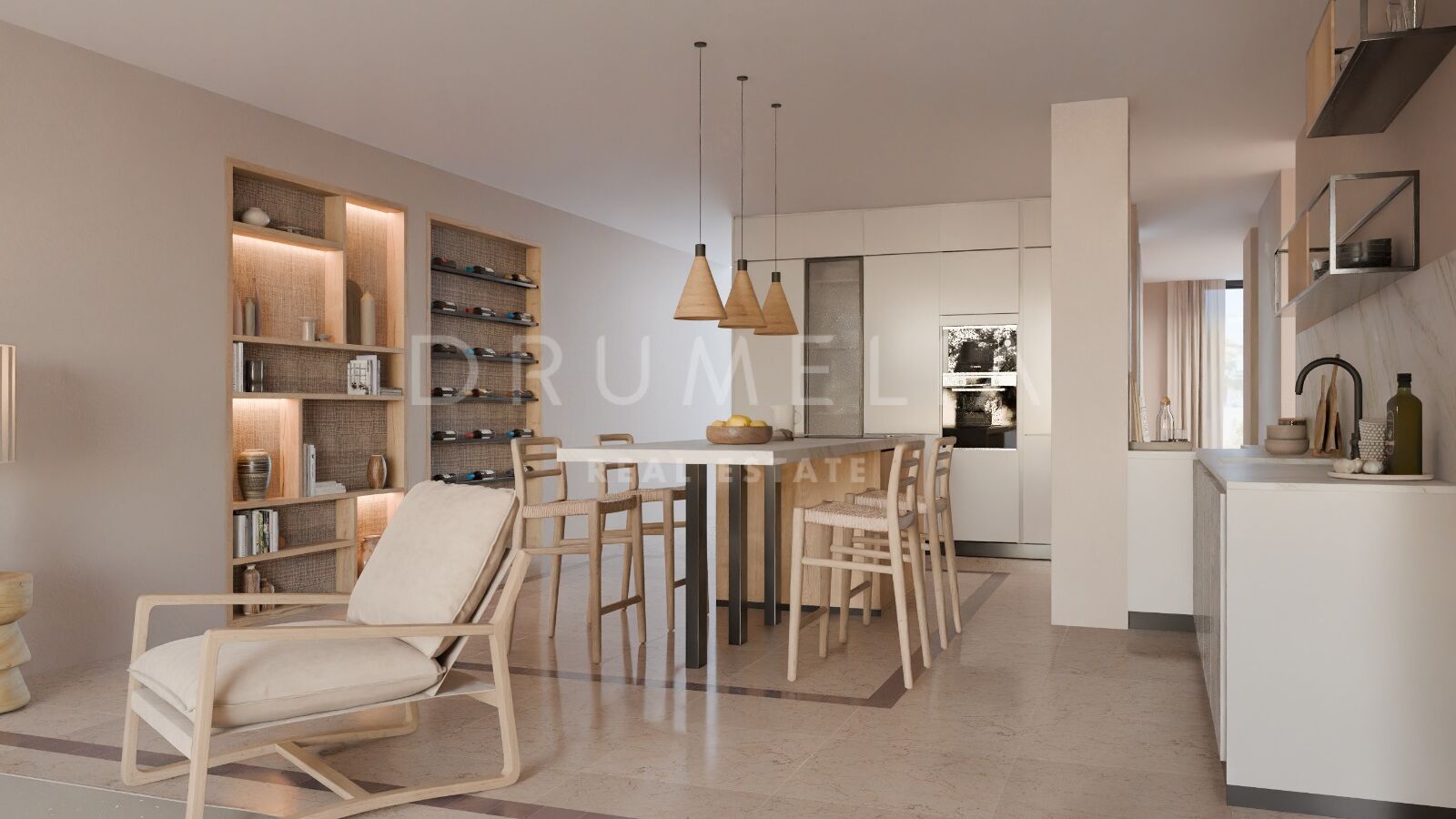 Se accede a un amplio salón-comedor de planta abierta, lleno de luz natural y con acceso directo a la terraza orientada al suroeste con hermosas vistas al mar. La cocina nueva, totalmente equipada con electrodomésticos Siemens, incluye una gran isla con mesa de comedor, perfecta para compartir momentos con familia y amigos.