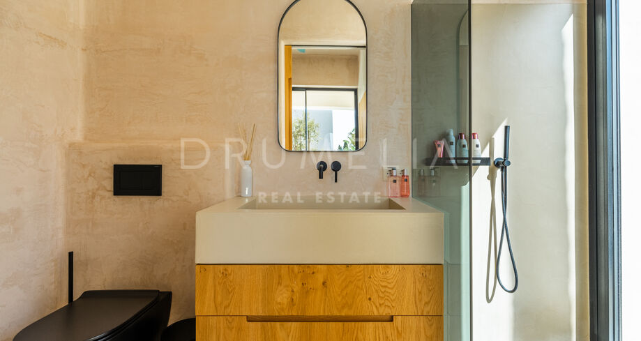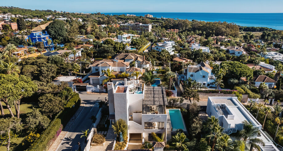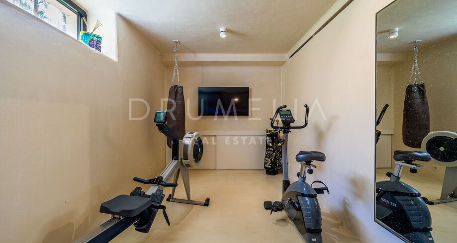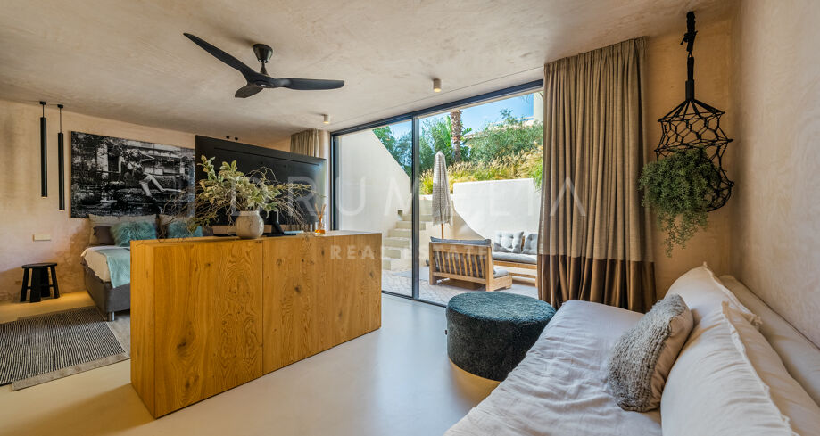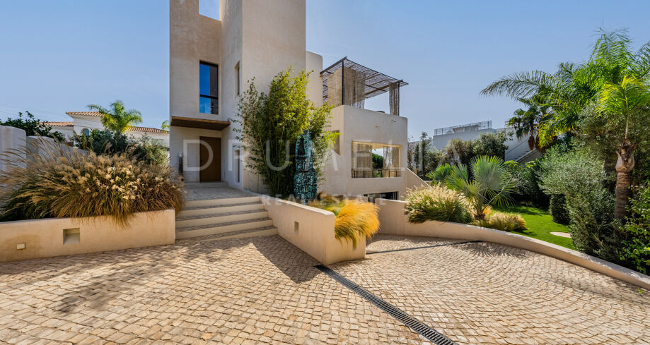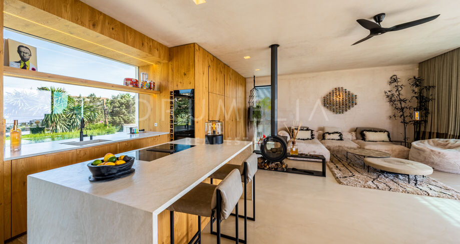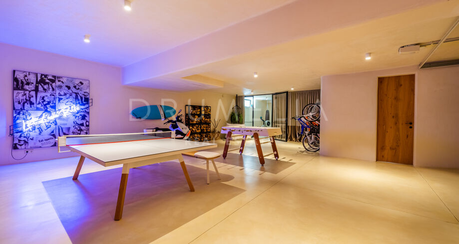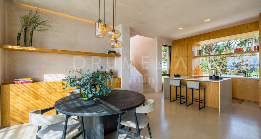 Ubicada en una parcela de esquina de 622 m², la villa de alta gama de 422 m² con 200 m² de terraza fue diseñada por un conocido arquitecto y construida en 2021 por una empresa constructora famosa por su creatividad y sus espectaculares diseños con una atmósfera de extraordinario eco-lujo. La fabulosa propiedad de 3 niveles cuenta con 4 dormitorios con terrazas privadas, un sótano y un garaje subterráneo, así como una terraza/solarium en la azotea con jacuzzi que disfruta de impresionantes vistas al mar desde el puerto deportivo de Cabopino hasta el Hotel Don Carlos y la famosa Nikki Beach, y hasta la costa africana. La zona de estar de planta abierta en la primera planta incluye un salón con una chimenea de madera de diseño personalizado, una zona de comedor, una elegante cocina totalmente equipada con una isla y serenas vistas verdes, un vestíbulo y un aseo de invitados. Se abre directamente a través de las puertas de cristal de gran altura y anchura a una increíble terraza cubierta con estupendas vistas al mar. Los elementos visuales como las líneas limpias, los elementos de madera, los materiales orgánicos, una paleta de colores neutros de tonos beige cálidos con acentos negros en contraste y el agua azul evocan una sensación de relajación y calma. Con una piscina climatizada, un gimnasio, salas de cine y de juegos, una zona de comedor al aire libre, un encantador patio, céspedes verdes y elementos acuáticos, la casa es ideal para entretener a los invitados y disfrutar del glorioso estilo de vida mediterráneo.