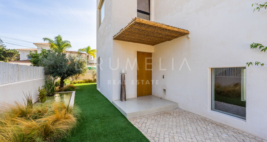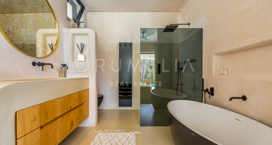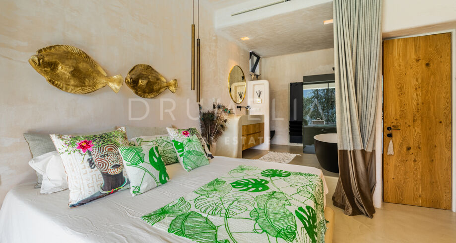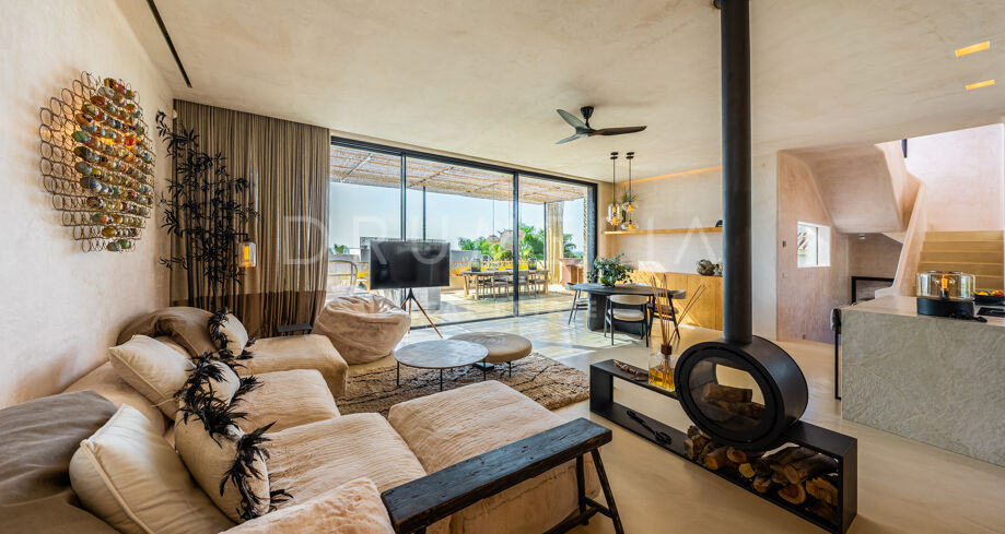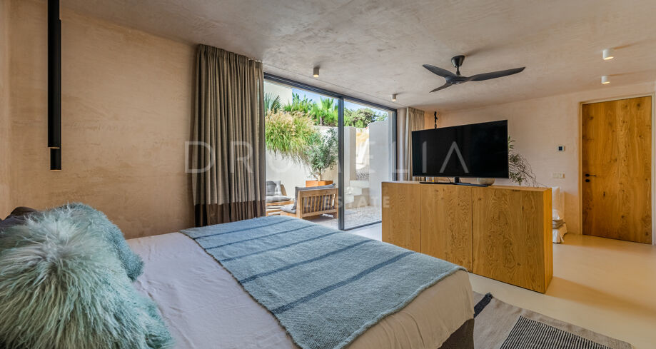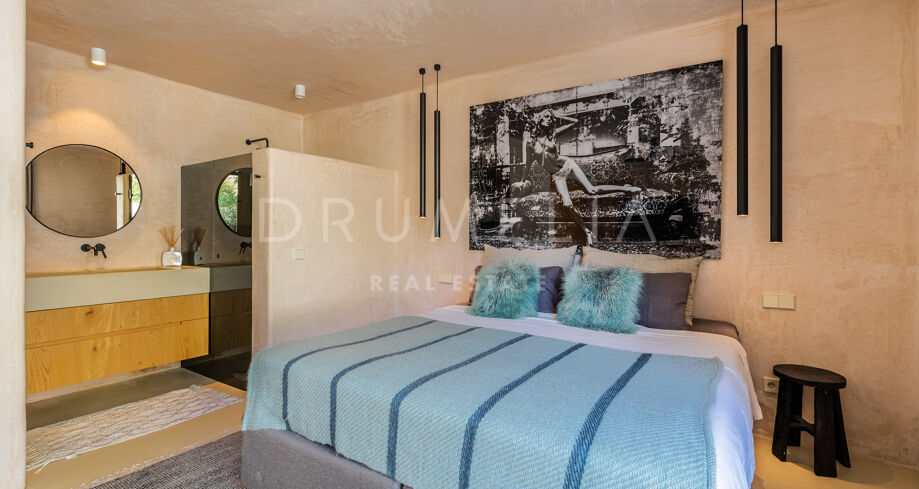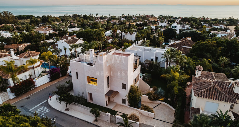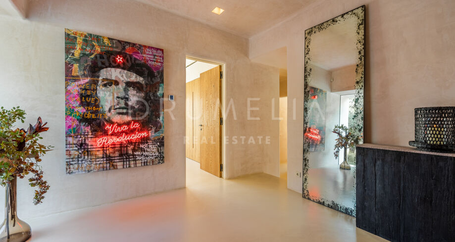 Ubicada en una parcela de esquina de 622 m², la villa de alta gama de 422 m² con 200 m² de terraza fue diseñada por un conocido arquitecto y construida en 2021 por una empresa constructora famosa por su creatividad y sus espectaculares diseños con una atmósfera de extraordinario eco-lujo. La fabulosa propiedad de 3 niveles cuenta con 4 dormitorios con terrazas privadas, un sótano y un garaje subterráneo, así como una terraza/solarium en la azotea con jacuzzi que disfruta de impresionantes vistas al mar desde el puerto deportivo de Cabopino hasta el Hotel Don Carlos y la famosa Nikki Beach, y hasta la costa africana. La zona de estar de planta abierta en la primera planta incluye un salón con una chimenea de madera de diseño personalizado, una zona de comedor, una elegante cocina totalmente equipada con una isla y serenas vistas verdes, un vestíbulo y un aseo de invitados. Se abre directamente a través de las puertas de cristal de gran altura y anchura a una increíble terraza cubierta con estupendas vistas al mar. Los elementos visuales como las líneas limpias, los elementos de madera, los materiales orgánicos, una paleta de colores neutros de tonos beige cálidos con acentos negros en contraste y el agua azul evocan una sensación de relajación y calma. Con una piscina climatizada, un gimnasio, salas de cine y de juegos, una zona de comedor al aire libre, un encantador patio, céspedes verdes y elementos acuáticos, la casa es ideal para entretener a los invitados y disfrutar del glorioso estilo de vida mediterráneo.