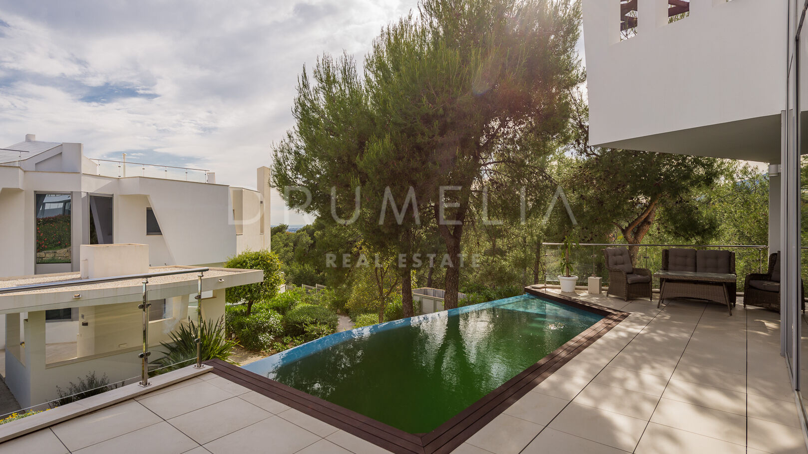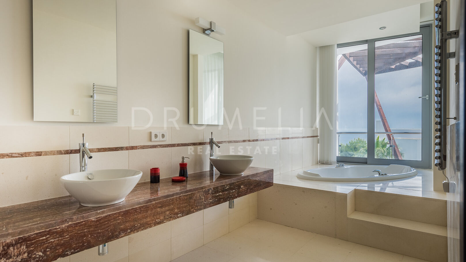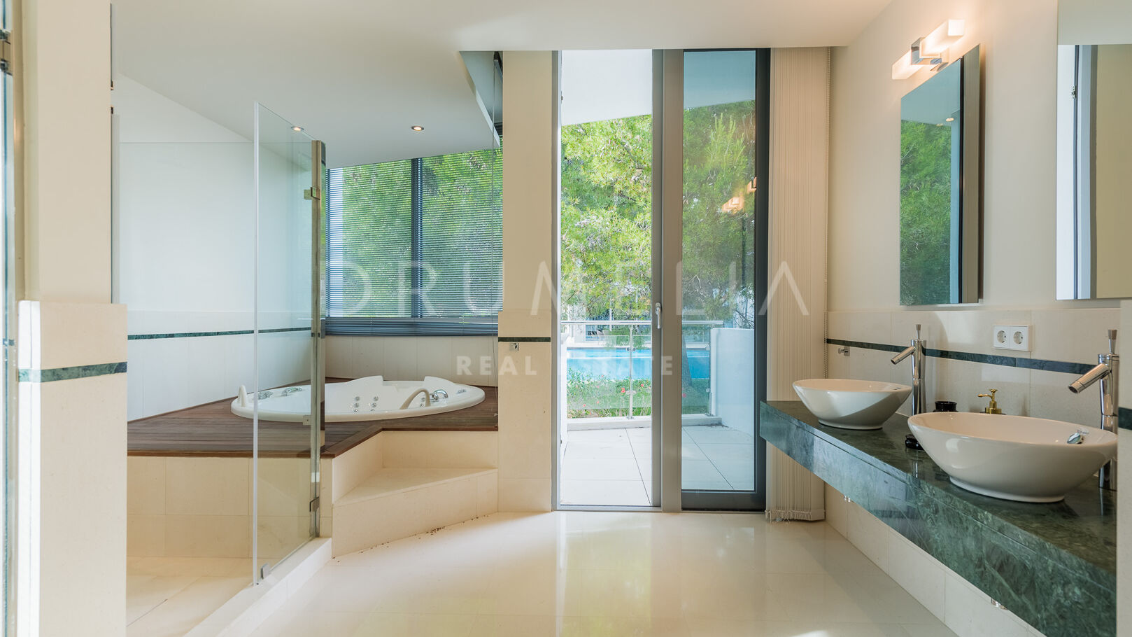 La moderna casa de 860 m² ofrece un espacio vital flexible con un amplio salón de planta abierta con techo de doble altura, una elegante cocina en blanco y negro y un comedor, 5 dormitorios con balcones y 5 modernos baños, 1 aseo de invitados, garaje, amplias terrazas con salones y una piscina infinita. Promueve la funcionalidad actualizada y el diseño de moda con una cuidadosa atención a los detalles contemporáneos: un concepto de planta abierta, abundancia de luz natural y cristal, paleta de colores neutros restringida por el estilo contemporáneo, líneas limpias y fuertes formas geométricas, emocionantes escaleras de moda. La propiedad goza de unas vistas espectaculares del exuberante entorno verde, la gran piscina, la emblemática montaña de La Concha y unas inolvidables vistas panorámicas al mar.