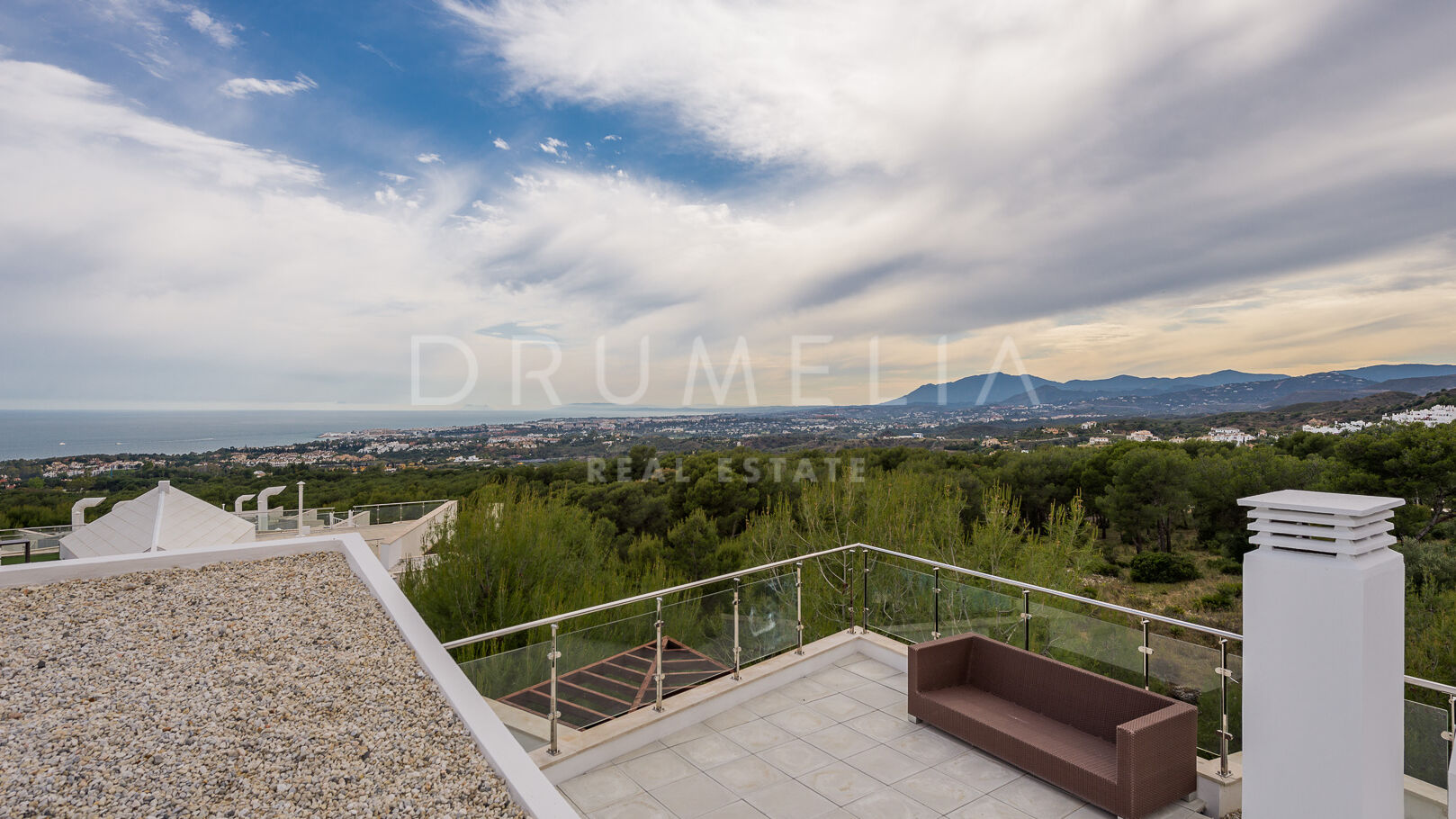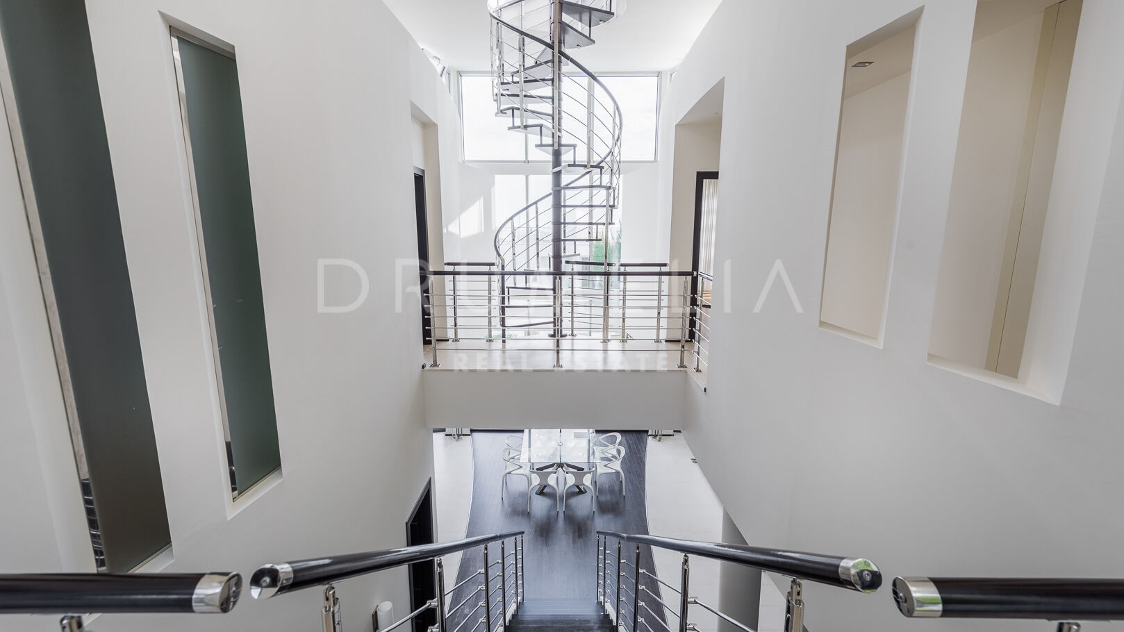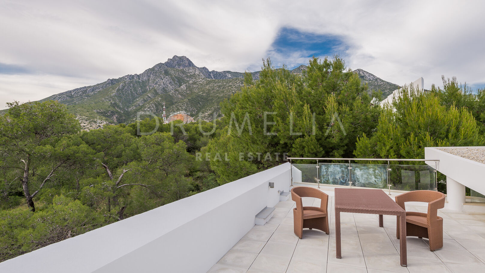 Esta impresionante e innovadora casa adosada con una elegante fachada asimétrica irregular y 89 m² de terrazas está situada en la exclusiva urbanización privada de Sierra Blanca, en la Milla de Oro de Marbella. Se trata de una de las direcciones más conocidas de Marbella y de toda la región mediterránea. Impresionante, elegante y única en muchos sentidos, esta propiedad ofrece unos estándares, un diseño y una calidad excepcionales, con mucha luz natural, soluciones de iluminación ergonómicas de los diseñadores, formas claras y líneas geométricas, una paleta de colores contemporánea y detalles que crean una imagen muy moderna y un ambiente elegante. La maravillosa residencia está enclavada en el entorno natural de la urbanización cerrada de la ladera de la montaña, en una de las zonas más deseadas de Marbella, con la proximidad de propiedades de alta gama, a sólo unos minutos del glamuroso Puerto Banús, el casco antiguo de Marbella, excelentes playas de arena, incluso galardonadas con Banderas Azules ecológicas, colegios internacionales y todo tipo de servicios que puede ofrecer la prestigiosa y hermosa Costa del Sol. La propia urbanización cuenta con hermosos jardines subtropicales, un gimnasio, una sauna, un baño turco y 3 piscinas comunitarias, una de ellas climatizada.