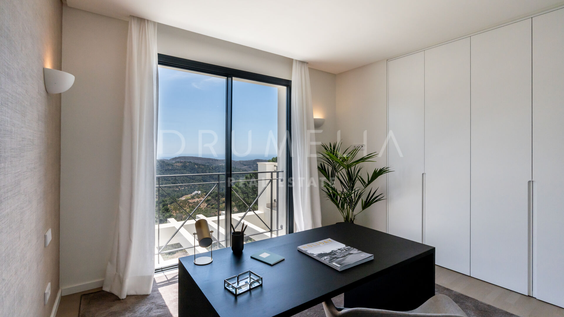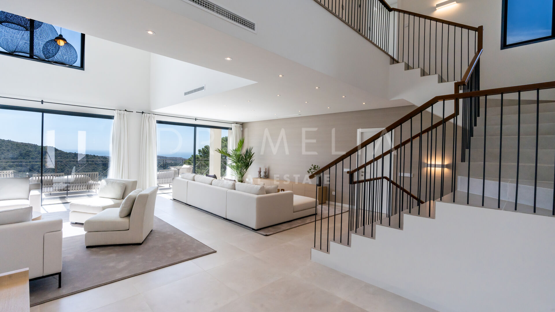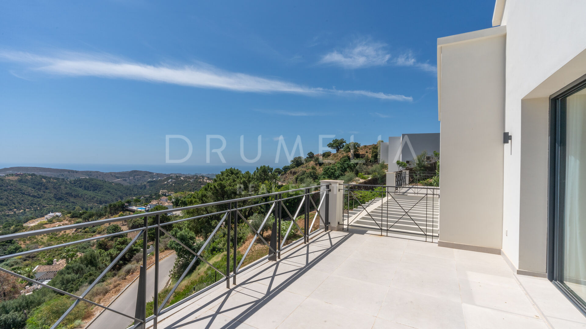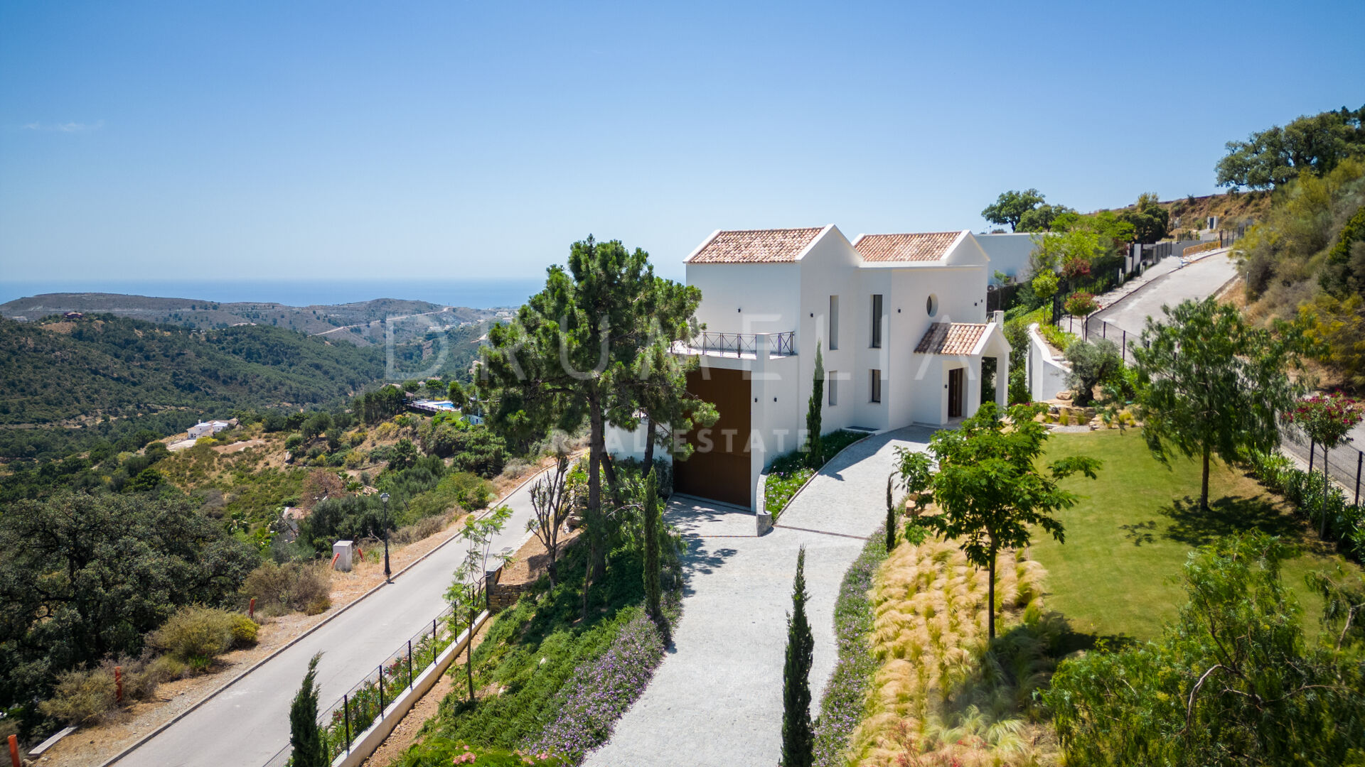 Ubicada en una gran parcela de 2.430 m², a esta villa ecológica de estilo mediterráneo contemporáneo se accede por un camino privado, que conduce a la entrada principal y a un garaje para 4 coches. La espectacular casa sur/este de 556 m², con una perfecta optimización del espacio, está diseñada para que entre la luz y vincule el exterior con el interior. La distribución abierta de la zona de estar comprende 2 zonas de estar con chimenea, una zona de comedor, una moderna y eficiente cocina italiana totalmente equipada con electrodomésticos alemanes, y un espacio de oficina. Hay una escalera muy elegante, pero también preinstalación para un futuro ascensor. Las ventanas correderas y las puertas de cristal dan acceso a las terrazas parcialmente cubiertas con vistas a la montaña y al mar. La suite principal es completamente privada, con una terraza cubierta, grandes armarios empotrados y una lujosa zona de baño con ducha a ras de suelo, bañera exenta, lavabos dobles y un aseo separado. Este nivel también alberga un baño de invitados y una sala polivalente.