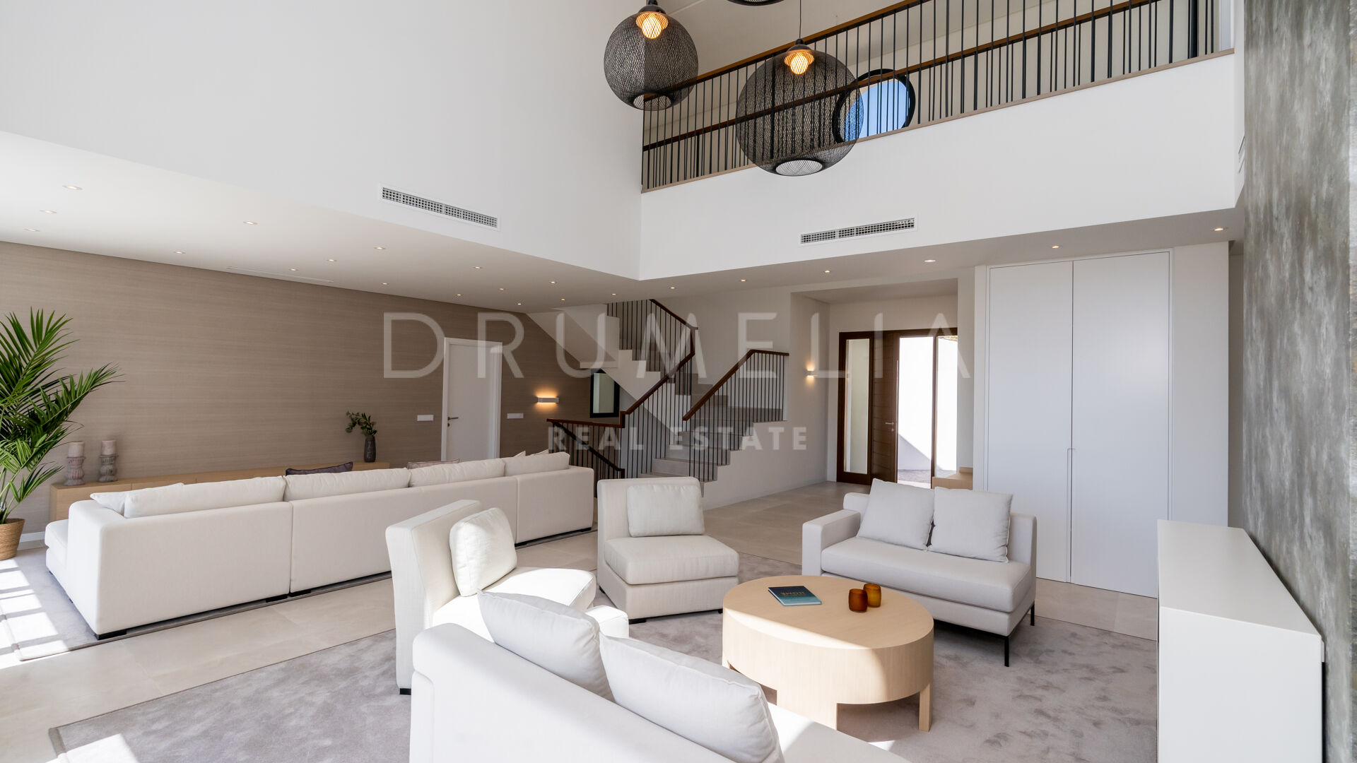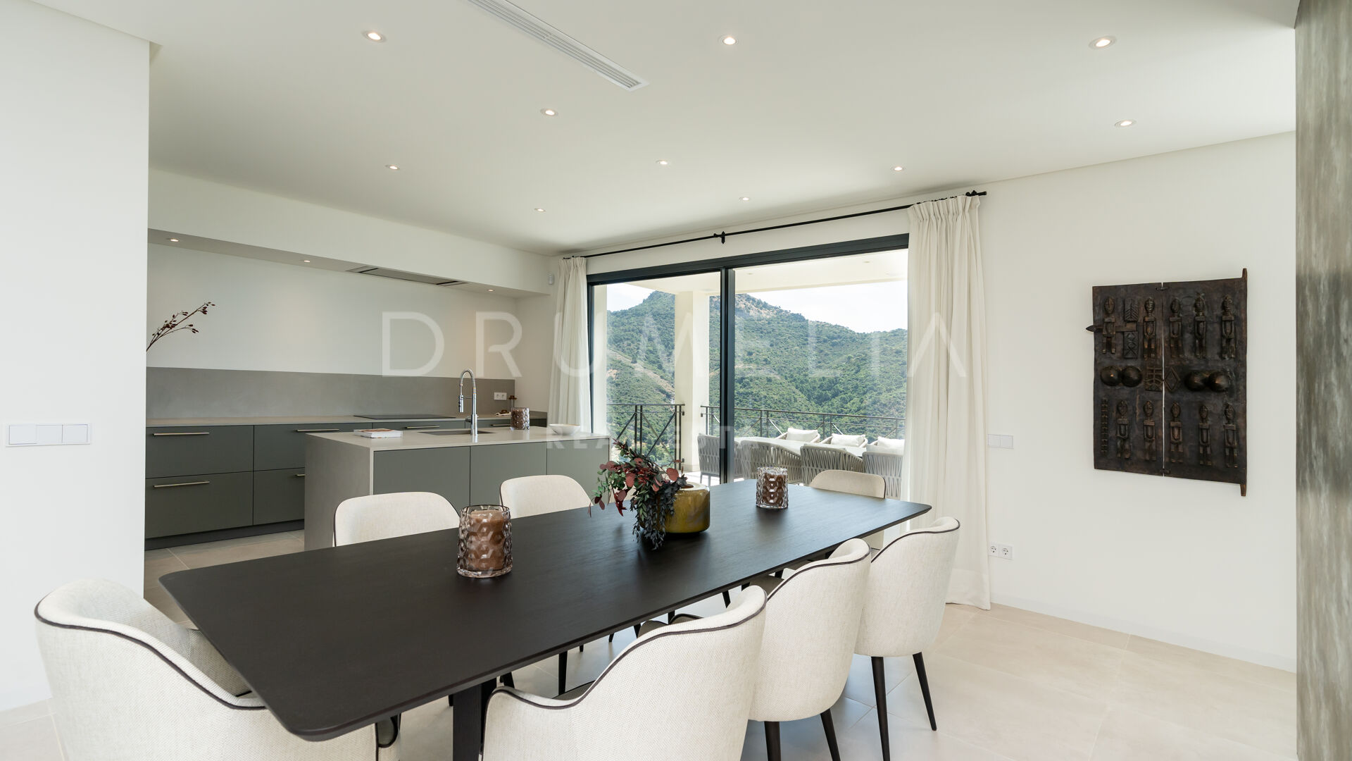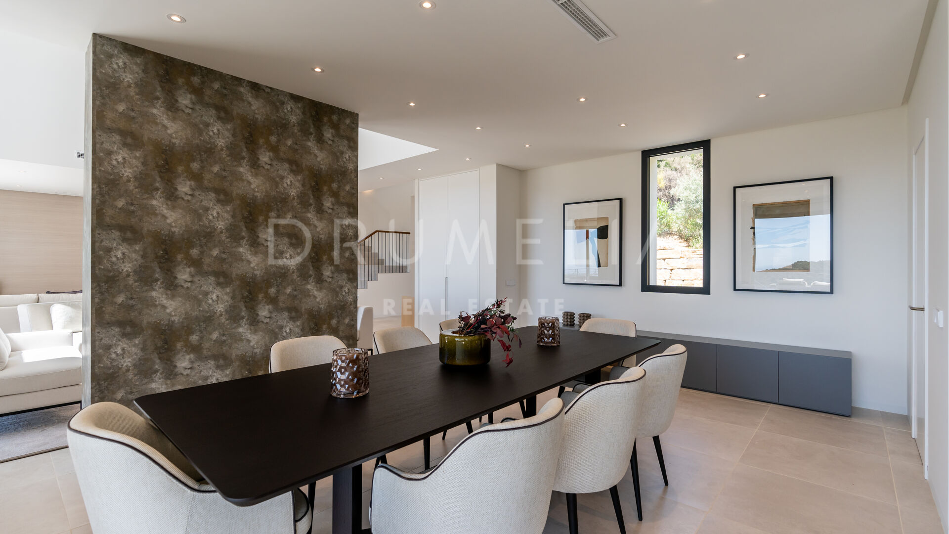 Ubicada en una gran parcela de 2.430 m², a esta villa ecológica de estilo mediterráneo contemporáneo se accede por un camino privado, que conduce a la entrada principal y a un garaje para 4 coches. La espectacular casa sur/este de 556 m², con una perfecta optimización del espacio, está diseñada para que entre la luz y vincule el exterior con el interior. La distribución abierta de la zona de estar comprende 2 zonas de estar con chimenea, una zona de comedor, una moderna y eficiente cocina italiana totalmente equipada con electrodomésticos alemanes, y un espacio de oficina. Hay una escalera muy elegante, pero también preinstalación para un futuro ascensor. Las ventanas correderas y las puertas de cristal dan acceso a las terrazas parcialmente cubiertas con vistas a la montaña y al mar. La suite principal es completamente privada, con una terraza cubierta, grandes armarios empotrados y una lujosa zona de baño con ducha a ras de suelo, bañera exenta, lavabos dobles y un aseo separado. Este nivel también alberga un baño de invitados y una sala polivalente.