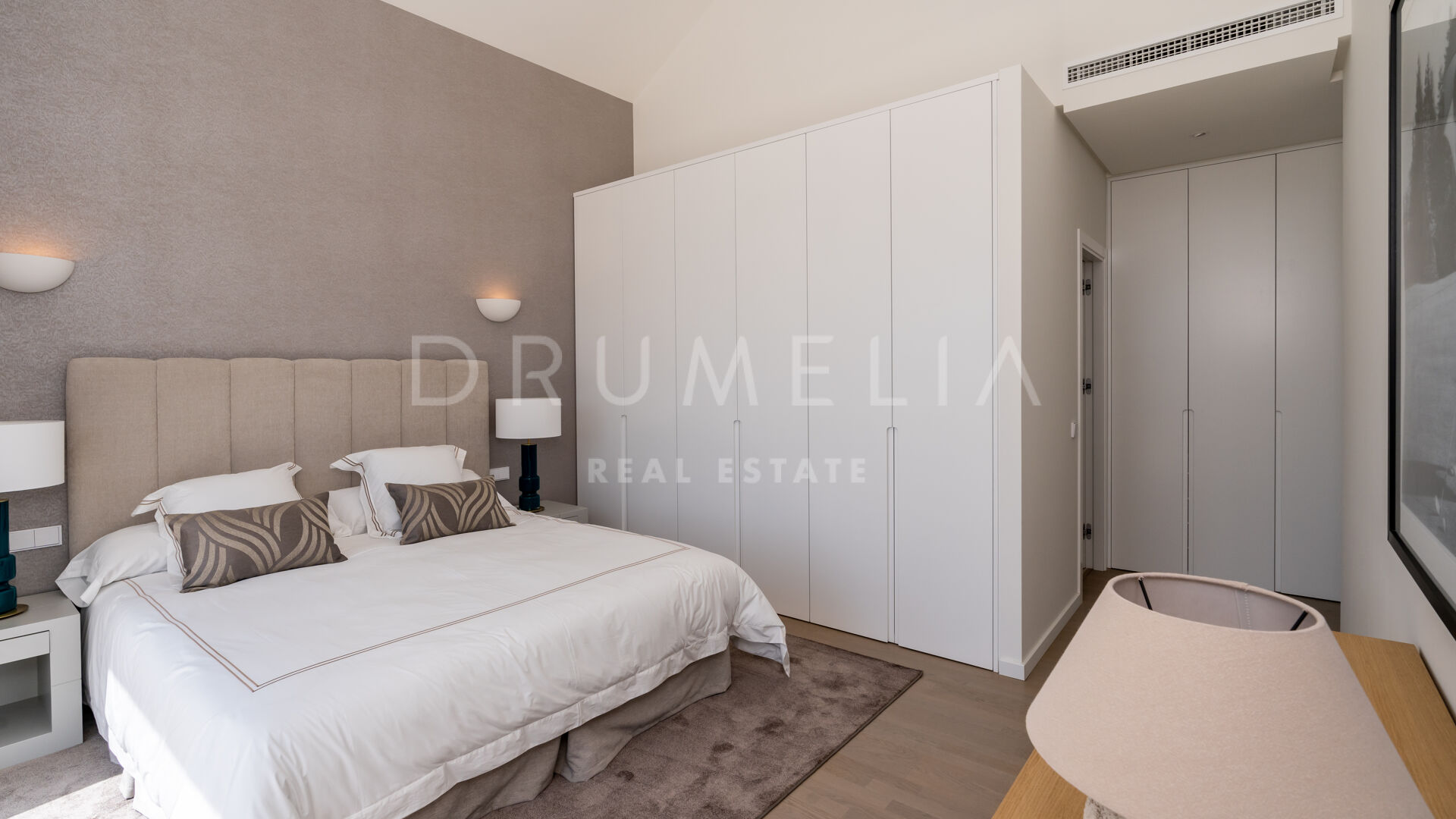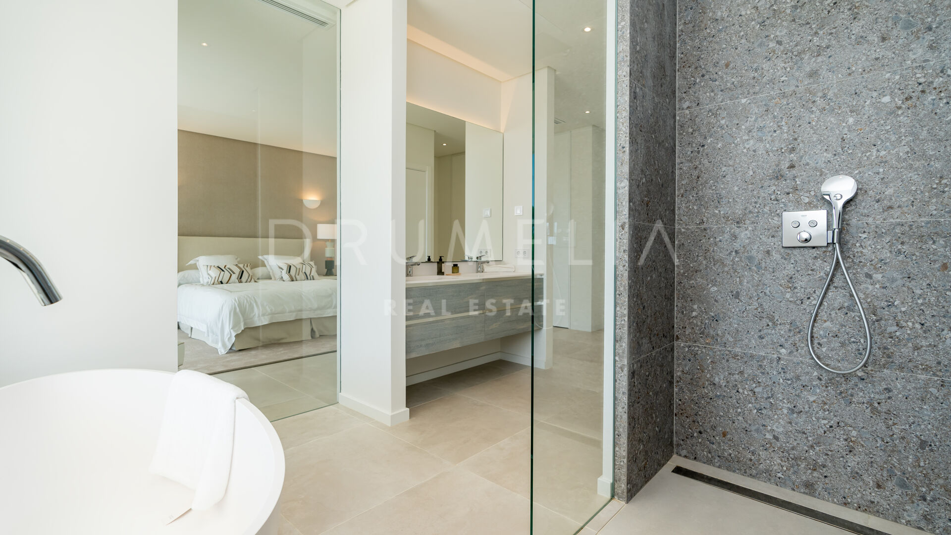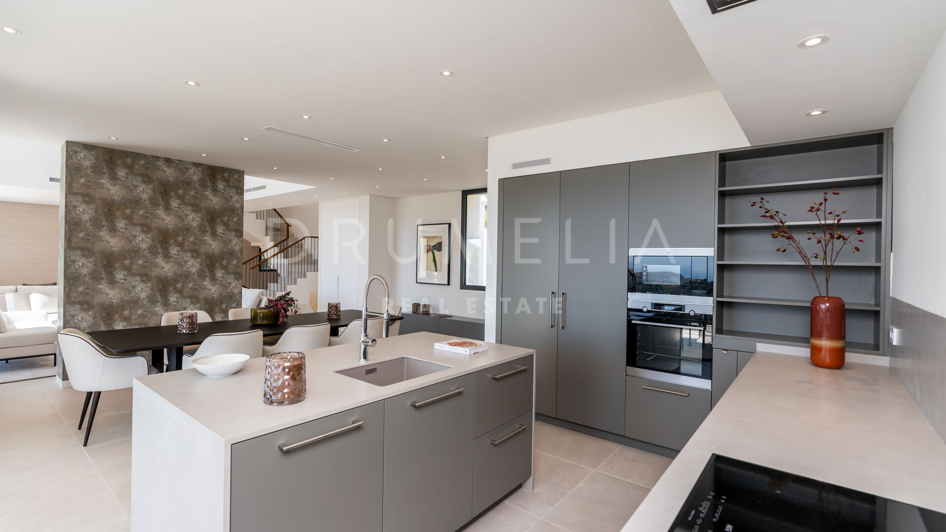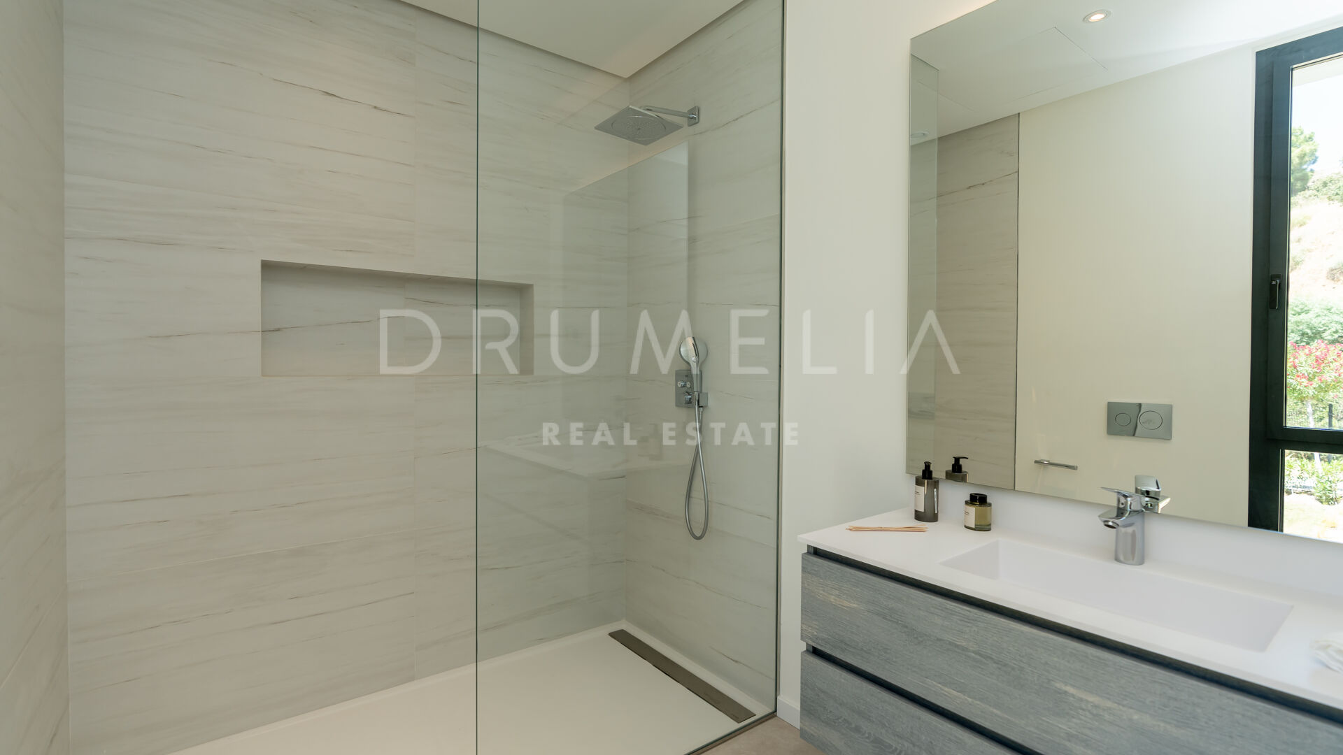 Ubicada en una gran parcela de 2.430 m², a esta villa ecológica de estilo mediterráneo contemporáneo se accede por un camino privado, que conduce a la entrada principal y a un garaje para 4 coches. La espectacular casa sur/este de 556 m², con una perfecta optimización del espacio, está diseñada para que entre la luz y vincule el exterior con el interior. La distribución abierta de la zona de estar comprende 2 zonas de estar con chimenea, una zona de comedor, una moderna y eficiente cocina italiana totalmente equipada con electrodomésticos alemanes, y un espacio de oficina. Hay una escalera muy elegante, pero también preinstalación para un futuro ascensor. Las ventanas correderas y las puertas de cristal dan acceso a las terrazas parcialmente cubiertas con vistas a la montaña y al mar. La suite principal es completamente privada, con una terraza cubierta, grandes armarios empotrados y una lujosa zona de baño con ducha a ras de suelo, bañera exenta, lavabos dobles y un aseo separado. Este nivel también alberga un baño de invitados y una sala polivalente.