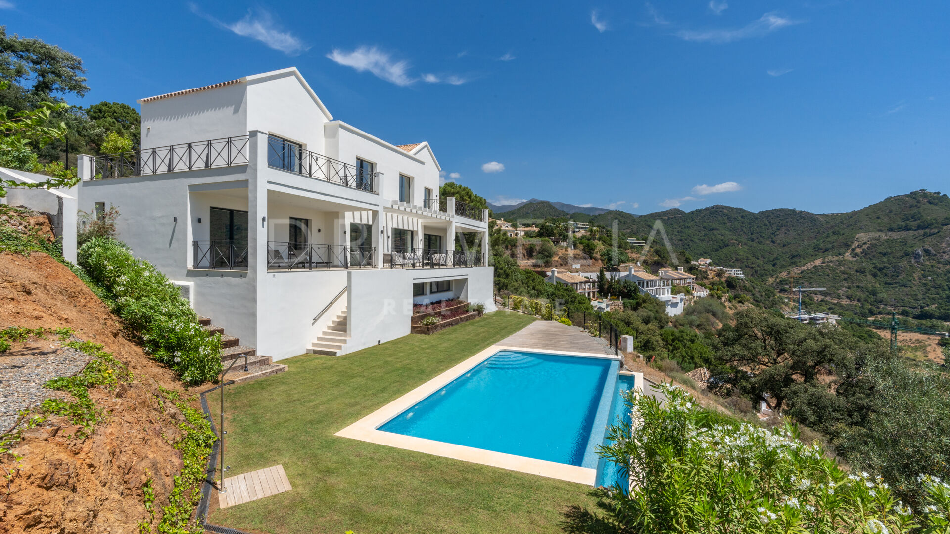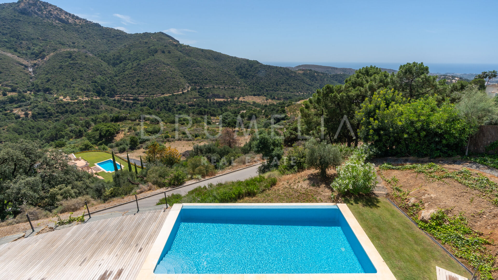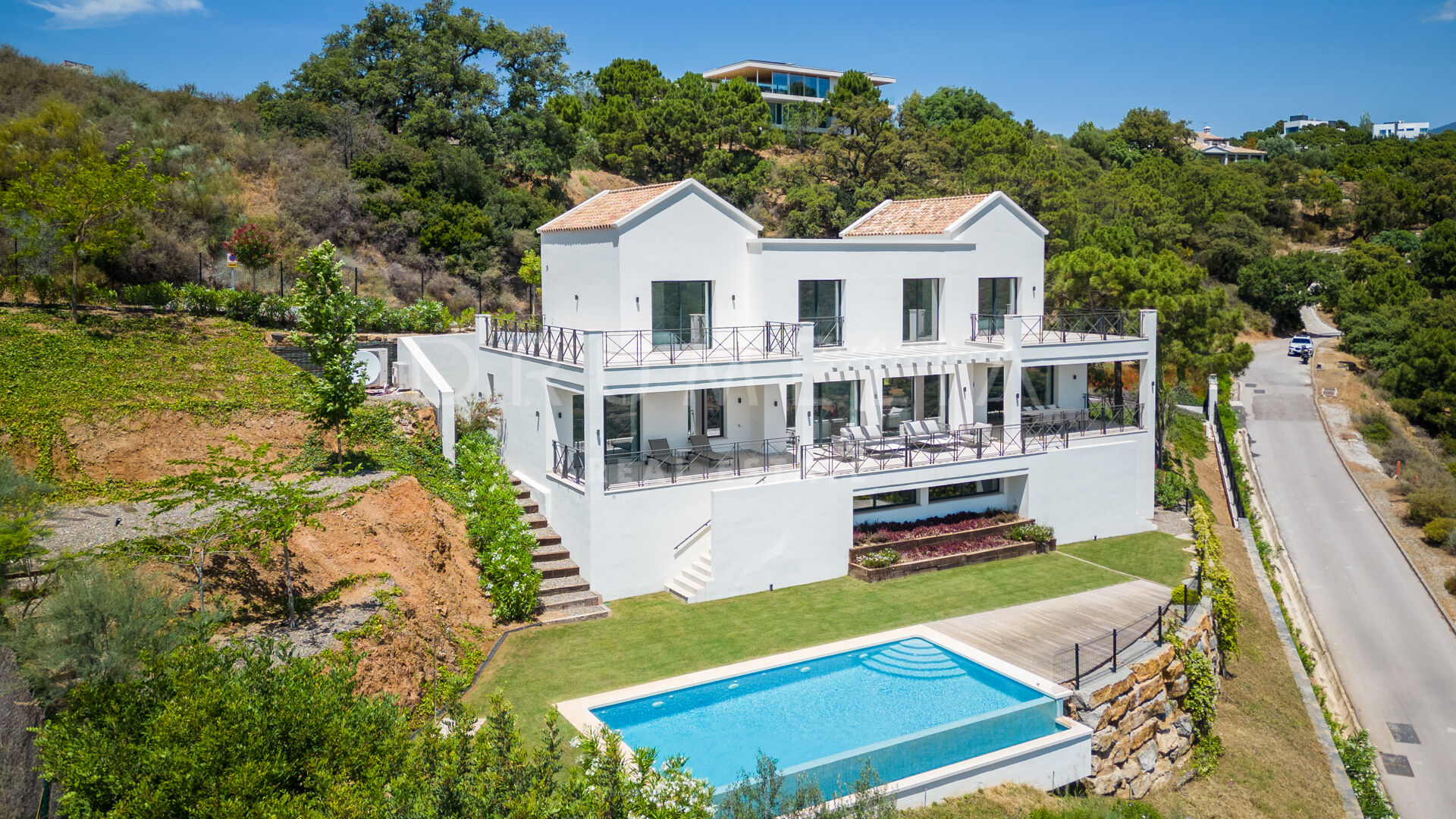 La planta superior cuenta con 3 suites de invitados con grandes ventanas y armarios empotrados; 2 de ellas tienen acceso a las terrazas, ideales para tomar el sol y el café de la mañana. El sótano consta del garaje, espacio para la lavandería y una gran sala de máquinas, que alberga los equipos de calefacción y refrigeración, los depósitos de agua y el equipo de la piscina. El gran espacio del garaje tiene luz natural, y puede dividirse para realizar una sala de cine, un gimnasio, dormitorios adicionales o un apartamento con acceso directo a la piscina, y aún así tener espacio más que suficiente para 2 coches. Hay 2 escaleras que bajan desde las terrazas del nivel principal hasta el nivel de la piscina y el jardín, con unas vistas panorámicas inmejorables. El jardín cuenta con un sistema de riego automático, una gran variedad de plantas, césped y zonas ajardinadas, una imponente piscina infinita y un salón con cubierta de madera.