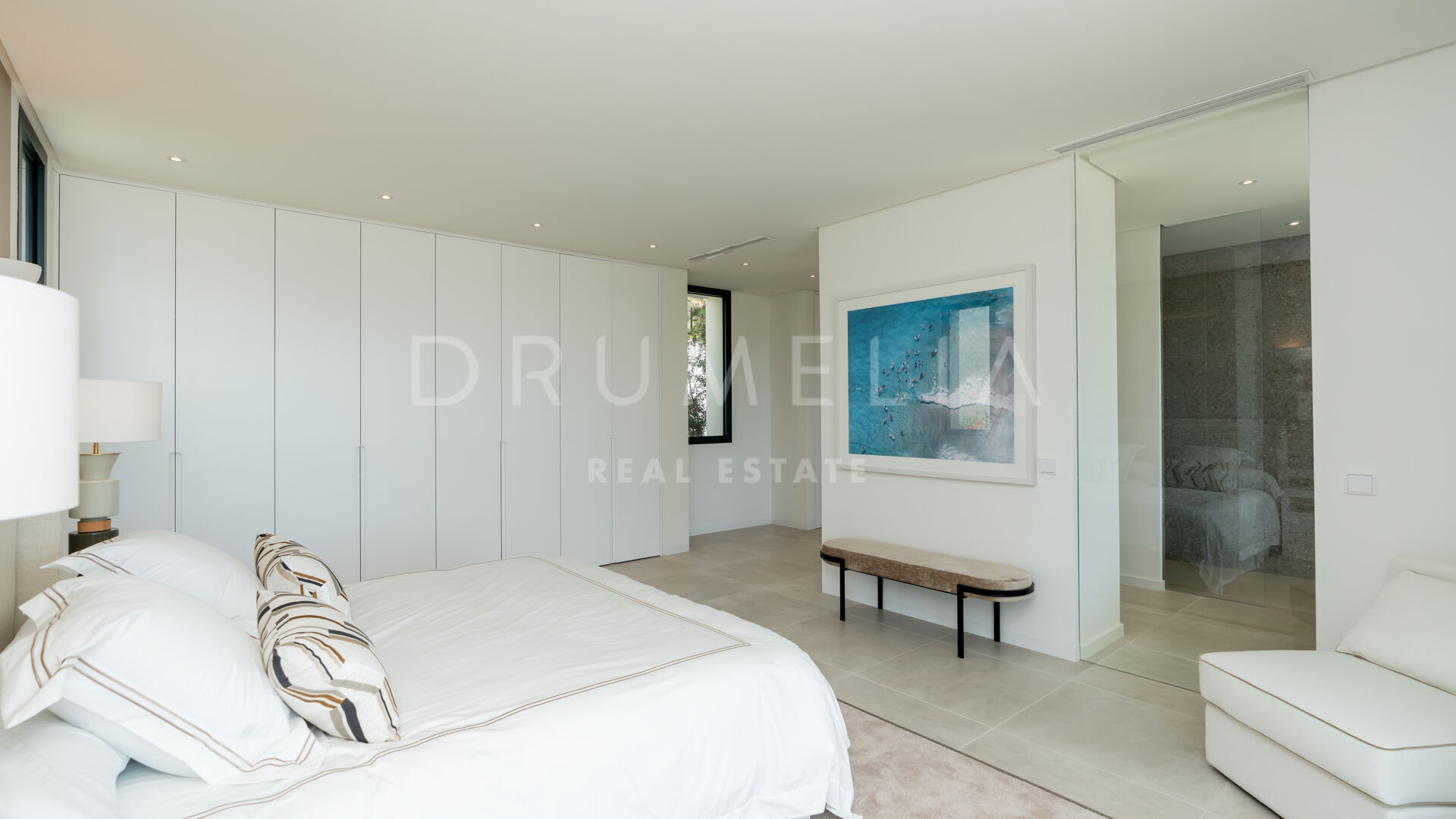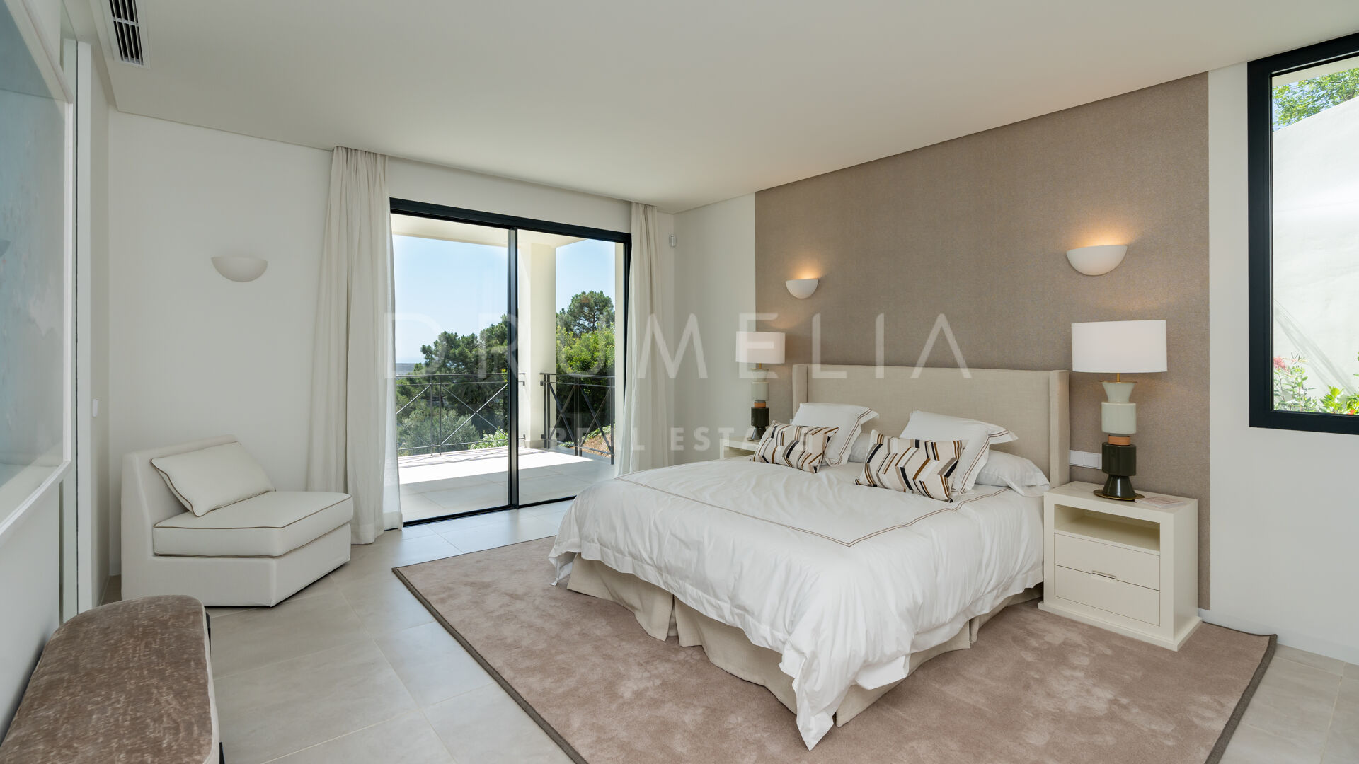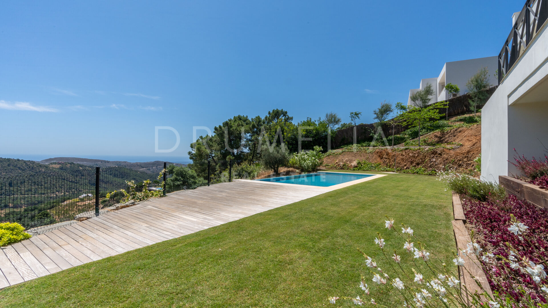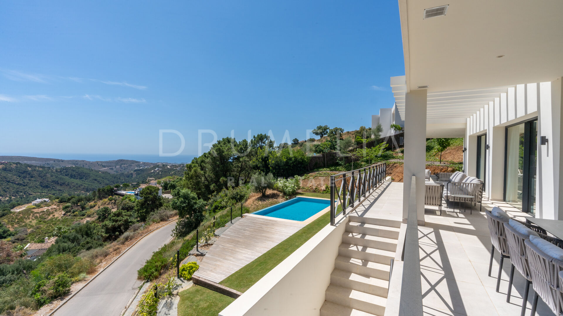 La planta superior cuenta con 3 suites de invitados con grandes ventanas y armarios empotrados; 2 de ellas tienen acceso a las terrazas, ideales para tomar el sol y el café de la mañana. El sótano consta del garaje, espacio para la lavandería y una gran sala de máquinas, que alberga los equipos de calefacción y refrigeración, los depósitos de agua y el equipo de la piscina. El gran espacio del garaje tiene luz natural, y puede dividirse para realizar una sala de cine, un gimnasio, dormitorios adicionales o un apartamento con acceso directo a la piscina, y aún así tener espacio más que suficiente para 2 coches. Hay 2 escaleras que bajan desde las terrazas del nivel principal hasta el nivel de la piscina y el jardín, con unas vistas panorámicas inmejorables. El jardín cuenta con un sistema de riego automático, una gran variedad de plantas, césped y zonas ajardinadas, una imponente piscina infinita y un salón con cubierta de madera.