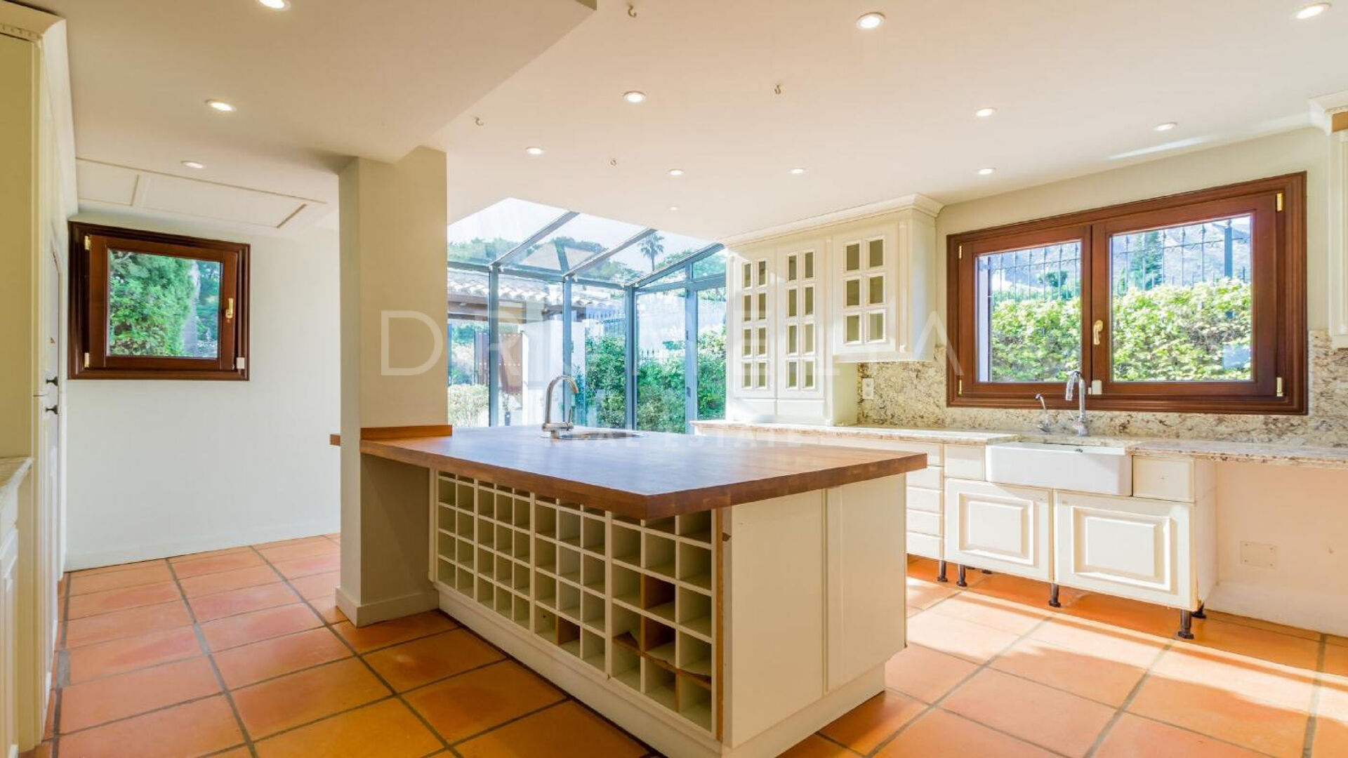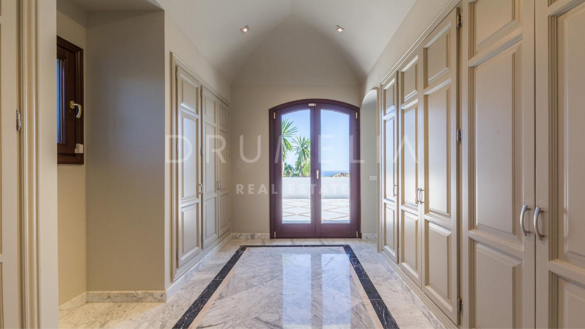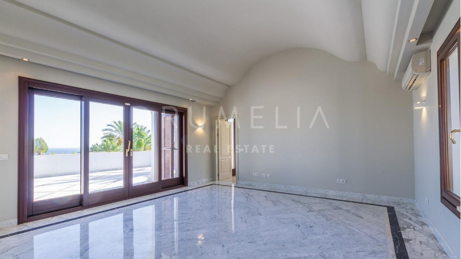 La villa cuenta con un vestíbulo de entrada, un amplio salón con chimenea y salida a la terraza cubierta orientada al sur y al jardín, un aseo para invitados y dos dormitorios con baño privado en la planta principal. La amplia cocina totalmente equipada ofrece un diseño de isla y un techo conservador de vidrio de moda y un acristalamiento en las paredes laterales, una extensión natural de la habitación, que proporciona un espacio vital adicional utilizable para ser disfrutado durante todo el año. Arriba hay un dormitorio principal con un excelente vestidor, un baño de mármol con ducha y jacuzzi, y una terraza/solarium descubierta con espectaculares vistas al mar. El nivel inferior, que también tiene un acceso desde el jardín y la zona de la piscina, ofrece una suite de 4 dormitorios con armarios empotrados, trasteros y lavaderos, garaje para 4 coches. Una juguetona combinación de elementos tradicionales con elementos modernos añade un carácter dinámico y un poderoso estilo de vanguardia.
