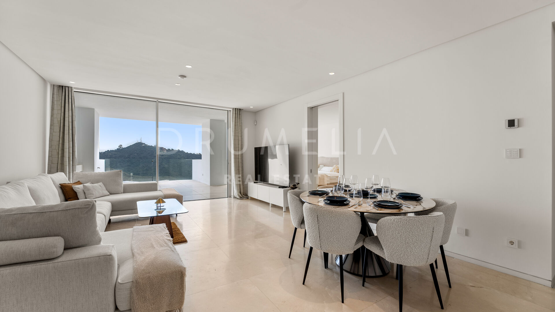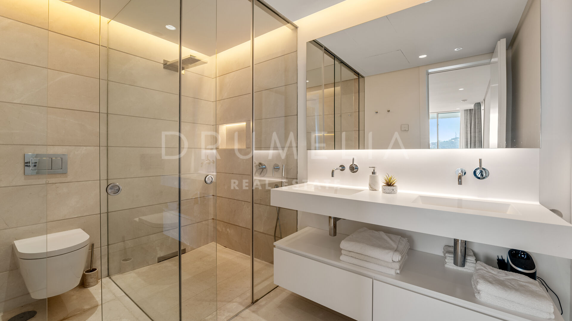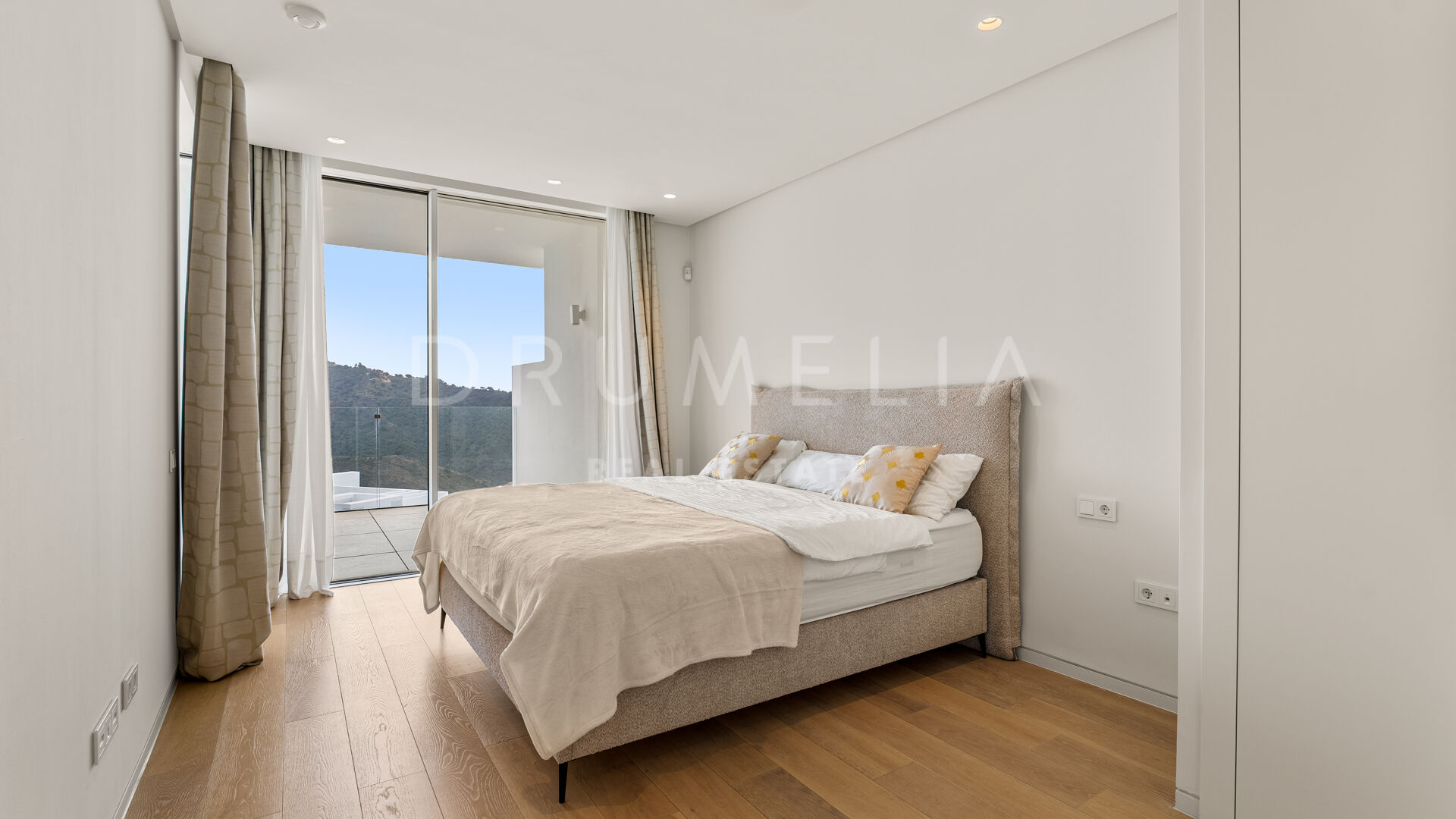Al entrar, le recibe una distribución diáfana totalmente amueblada que muestra un salón elegantemente diseñado y una impresionante cocina Gunni & Trentino, equipada con sofisticados electrodomésticos Siemens. Los amplios ventanales Schüco comunican a la perfección el salón con una generosa terraza, donde podrá disfrutar de impresionantes vistas a la montaña y al mar. El dormitorio principal cuenta con un lujoso baño en suite, complementado por un dormitorio de invitados, un baño secundario y un práctico lavadero.