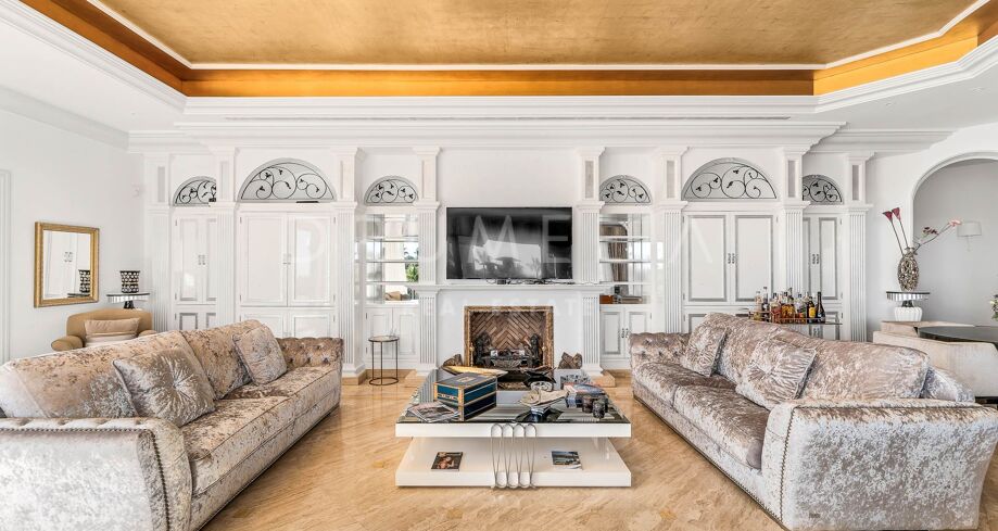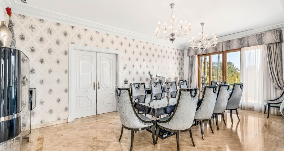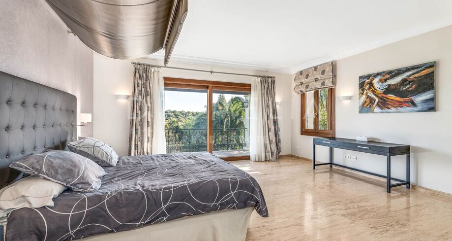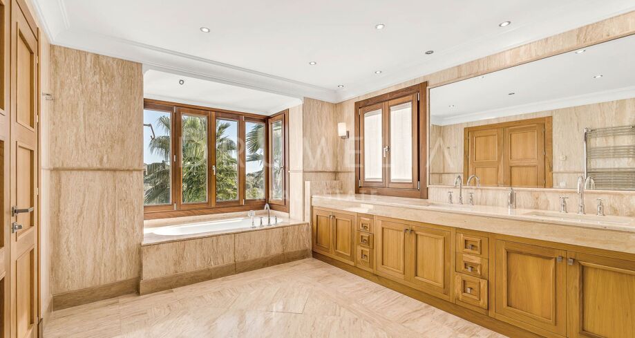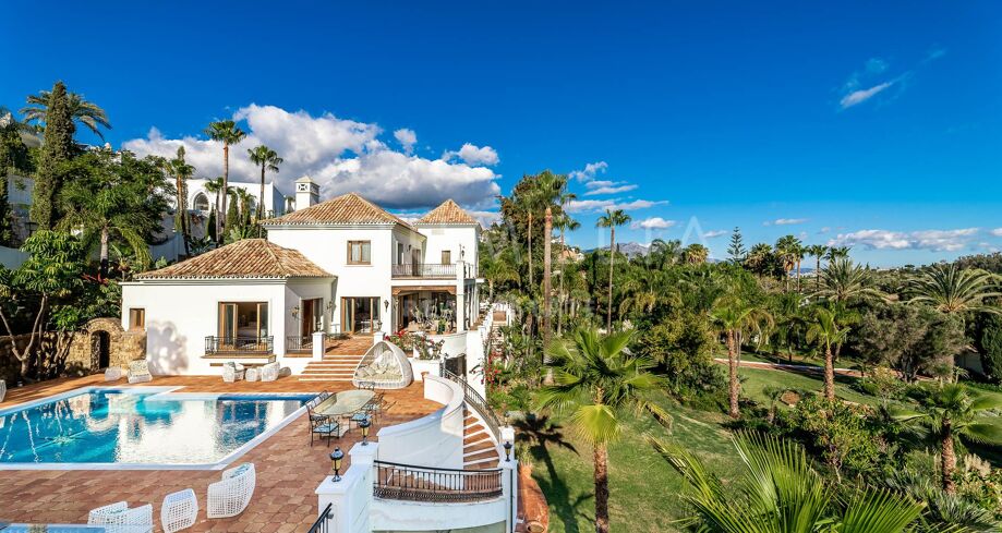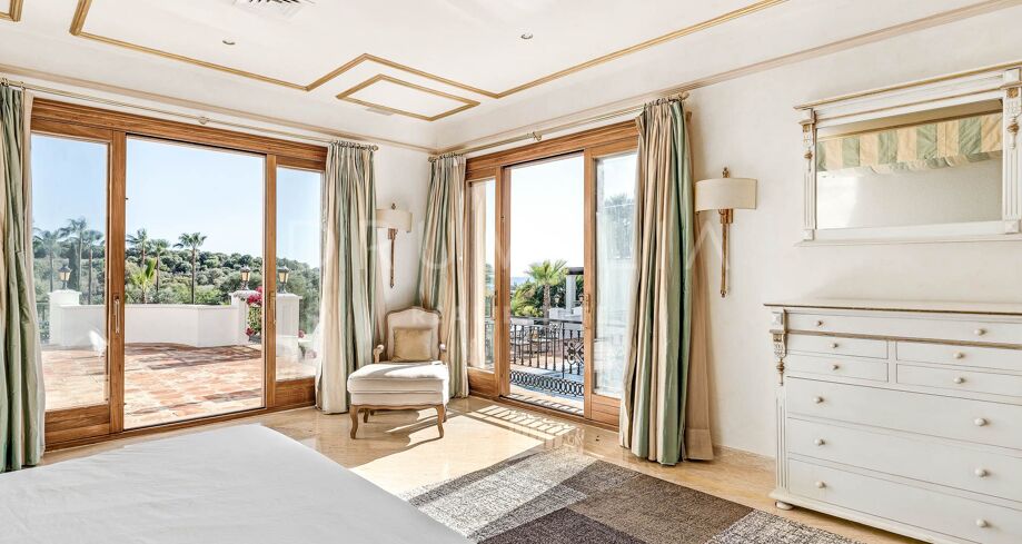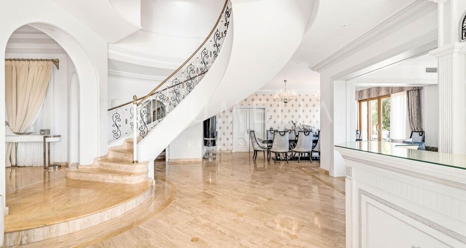 La magnífica mansión ofrece 16 lujosos dormitorios y 16 cuartos de baño, zonas de estar, comedor y entretenimiento lo suficientemente hermosas como para invitar a reyes y reinas. Deslumbra con su hermosa fachada y su arquitectura tradicional mediterránea. Un amplio hall de entrada con una exquisita escalera conduce a un elegante salón con chimenea, y a una zona de comedor independiente con acceso a las terrazas y al jardín. Los espacios exteriores son igualmente notables. Se han creado cuidadosamente aprovechando al máximo las increíbles vistas panorámicas a la montaña y al mar (orientación sur). Te impresionarán el jardín, perfectamente cuidado, las imponentes zonas verdes y los rincones románticos, la gran piscina, el elegante chill out y las zonas de comedor al aire libre.