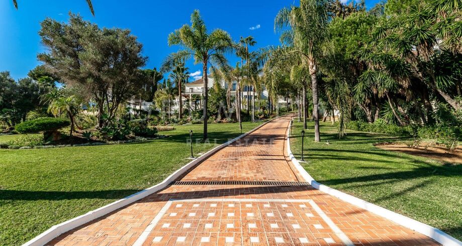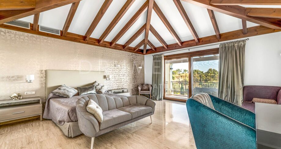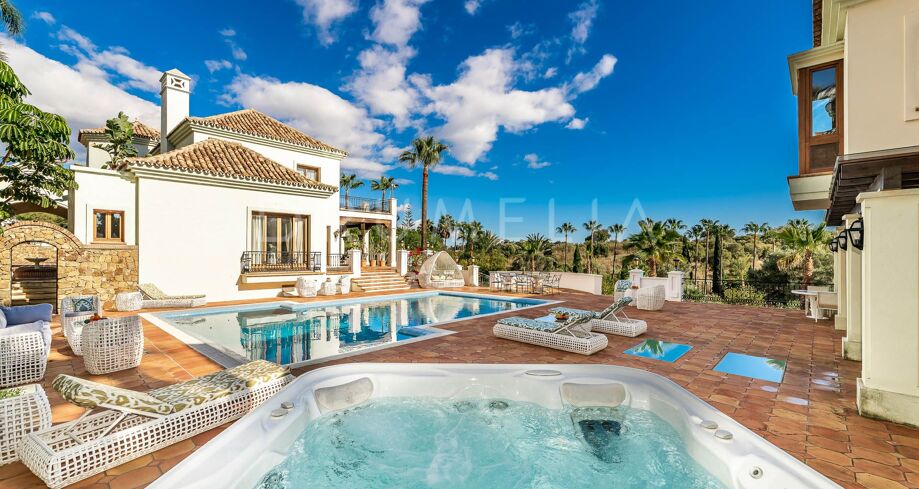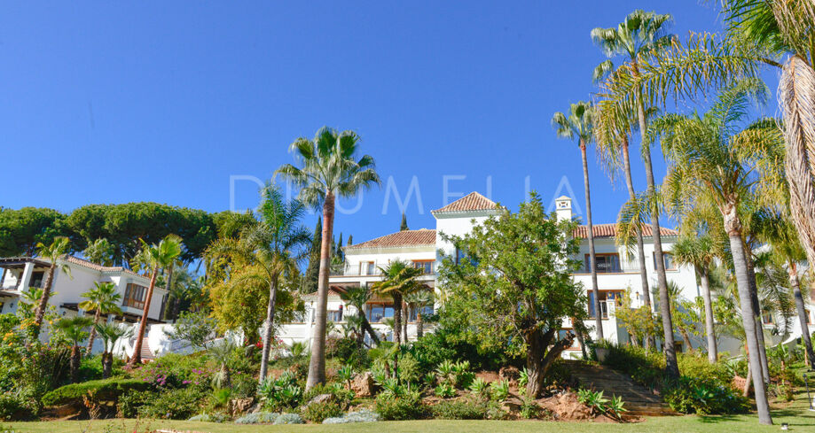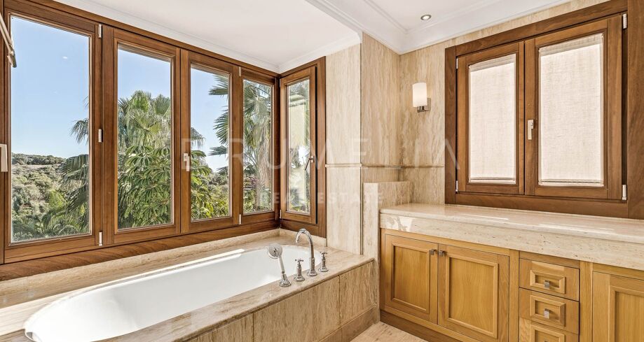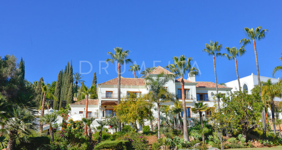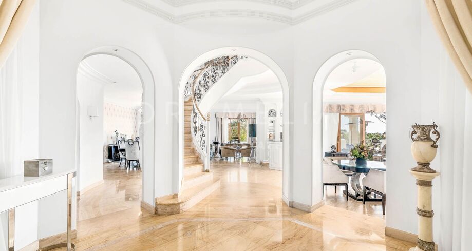 La magnífica mansión ofrece 16 lujosos dormitorios y 16 cuartos de baño, zonas de estar, comedor y entretenimiento lo suficientemente hermosas como para invitar a reyes y reinas. Deslumbra con su hermosa fachada y su arquitectura tradicional mediterránea. Un amplio hall de entrada con una exquisita escalera conduce a un elegante salón con chimenea, y a una zona de comedor independiente con acceso a las terrazas y al jardín. Los espacios exteriores son igualmente notables. Se han creado cuidadosamente aprovechando al máximo las increíbles vistas panorámicas a la montaña y al mar (orientación sur). Te impresionarán el jardín, perfectamente cuidado, las imponentes zonas verdes y los rincones románticos, la gran piscina, el elegante chill out y las zonas de comedor al aire libre.