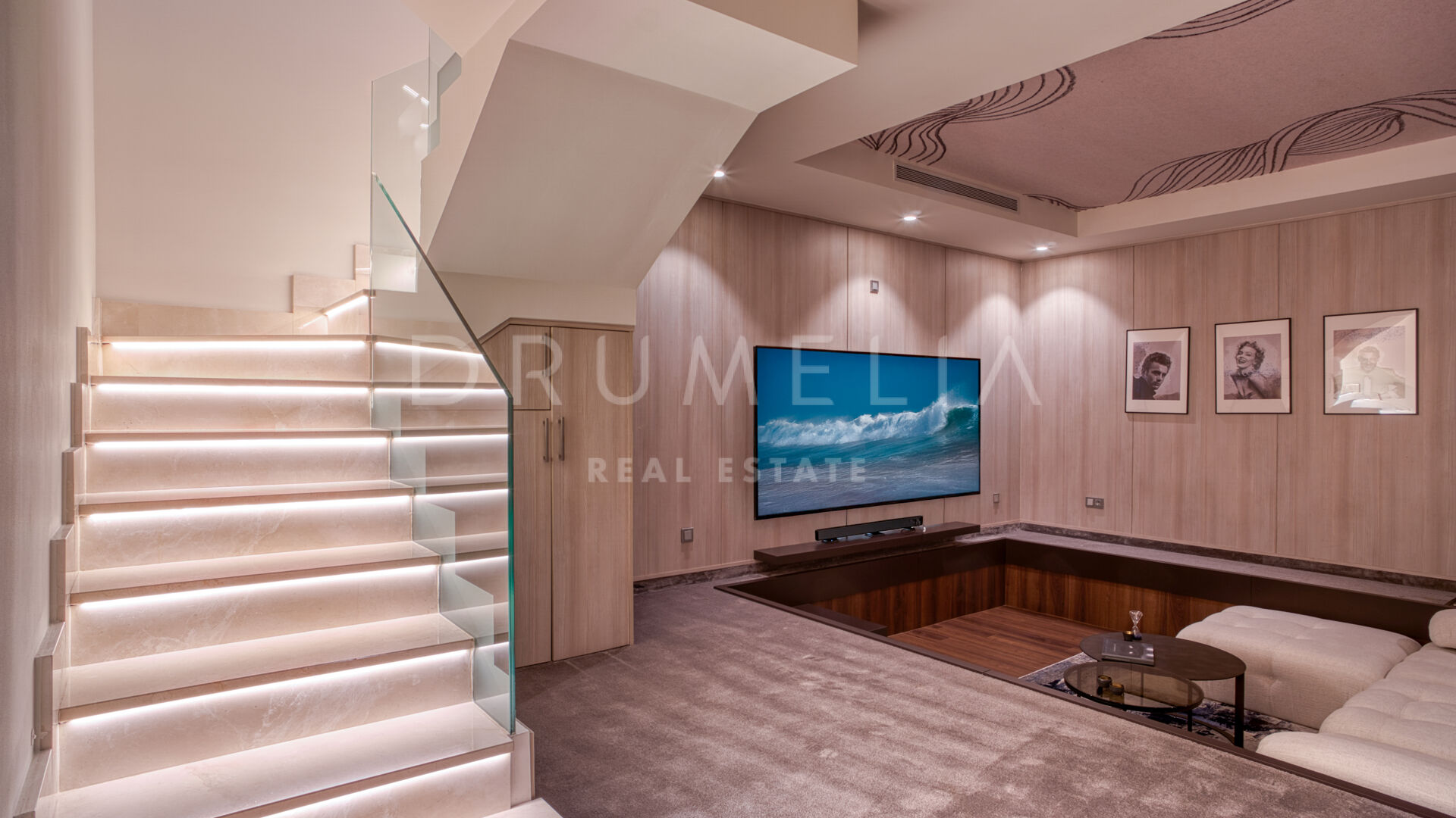 En el nivel inferior, disfrute de una sala de cine privada con bar, un dormitorio adicional con baño y un área de lavandería dedicada. Perfecto para entretenerse o relajarse con estilo.