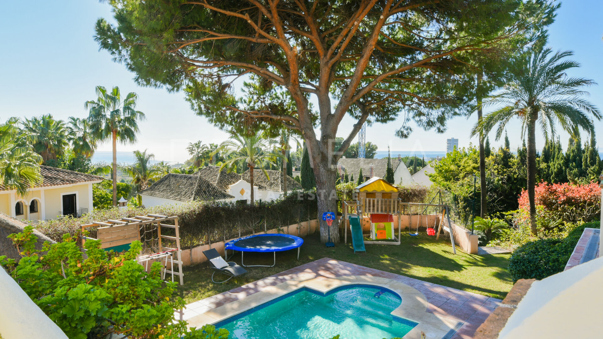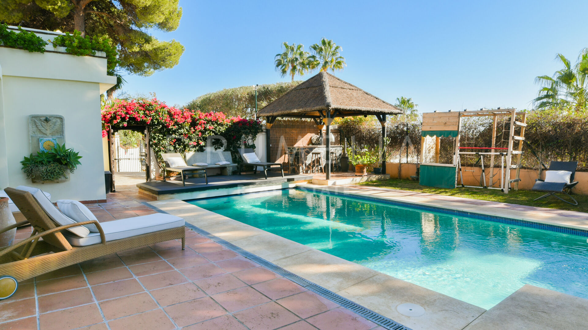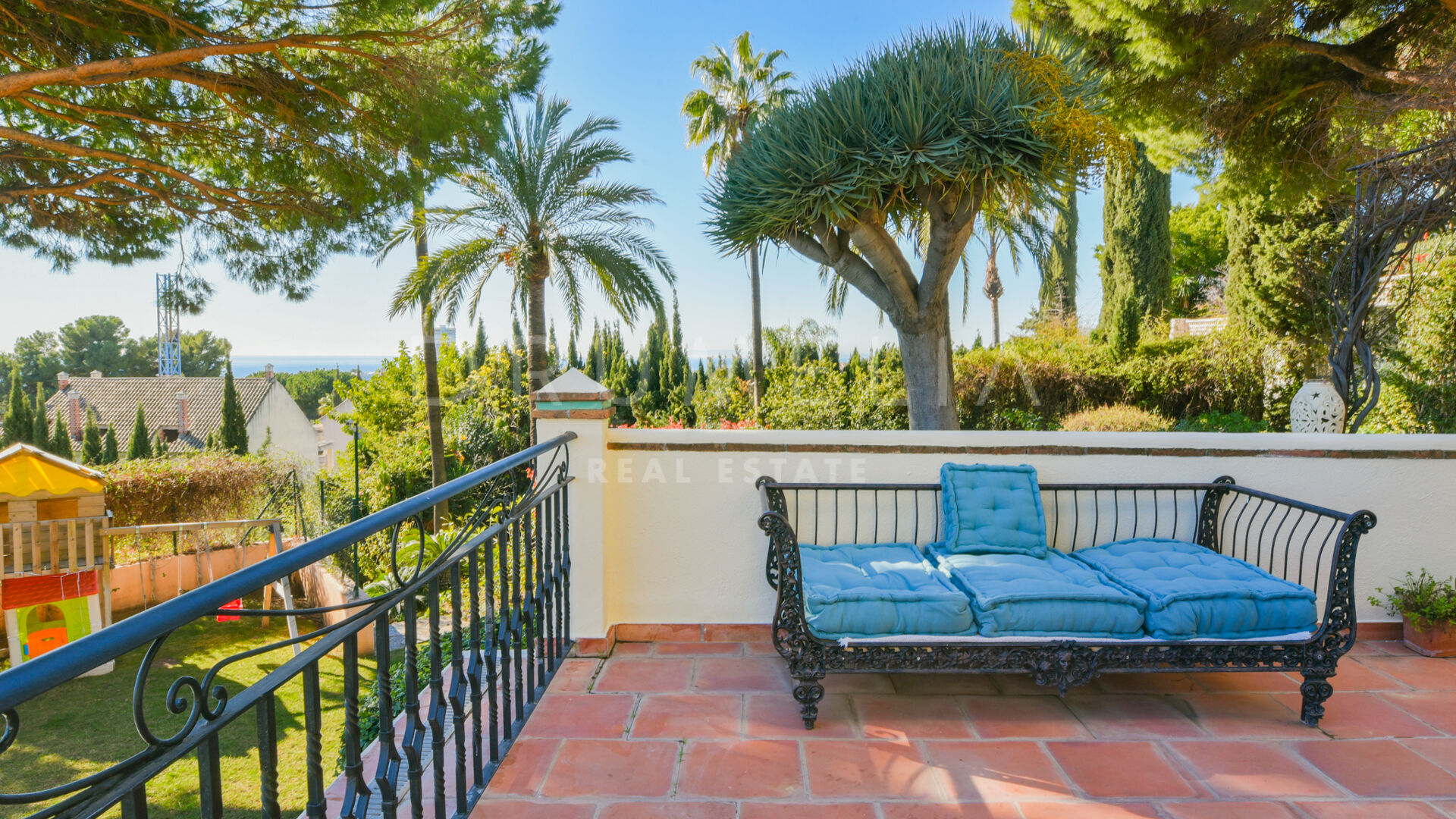 Se pone a la venta esta excepcional casa familiar de 5 dormitorios en la exclusiva zona de Río Real, Marbella, una de las más bellas y prestigiosas de la Costa del Sol, a sólo 5 minutos del centro de la ciudad. Ubicada en una parcela de 1.771 m², la espectacular propiedad de 497 m² disfruta del sol y de preciosas vistas al mar, con África y Gibraltar en el horizonte, y a la montaña.