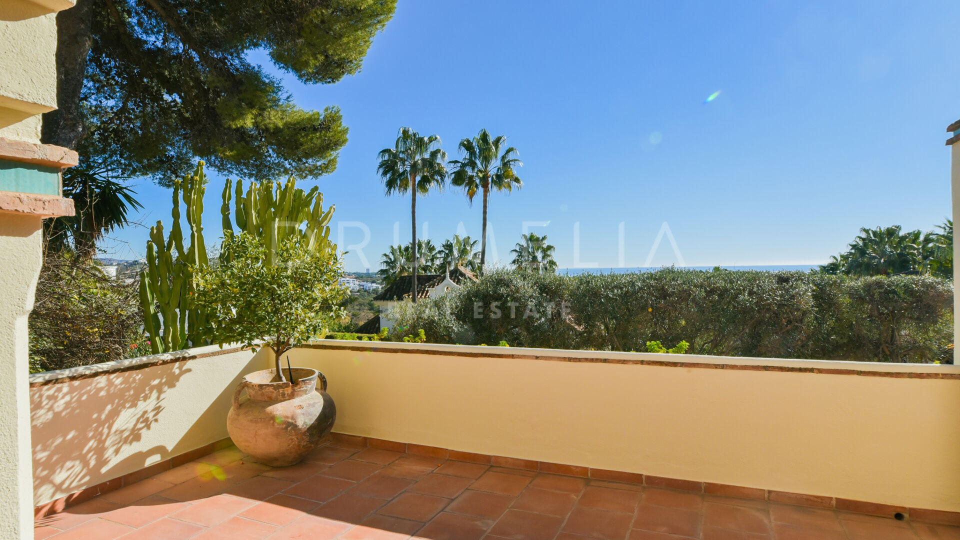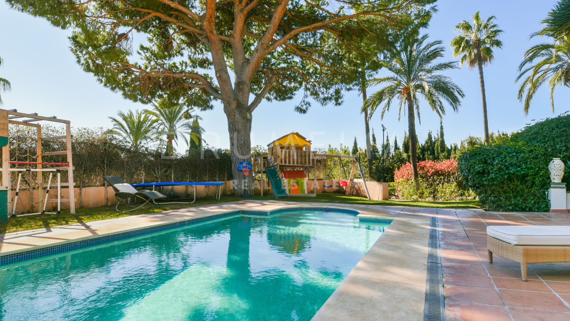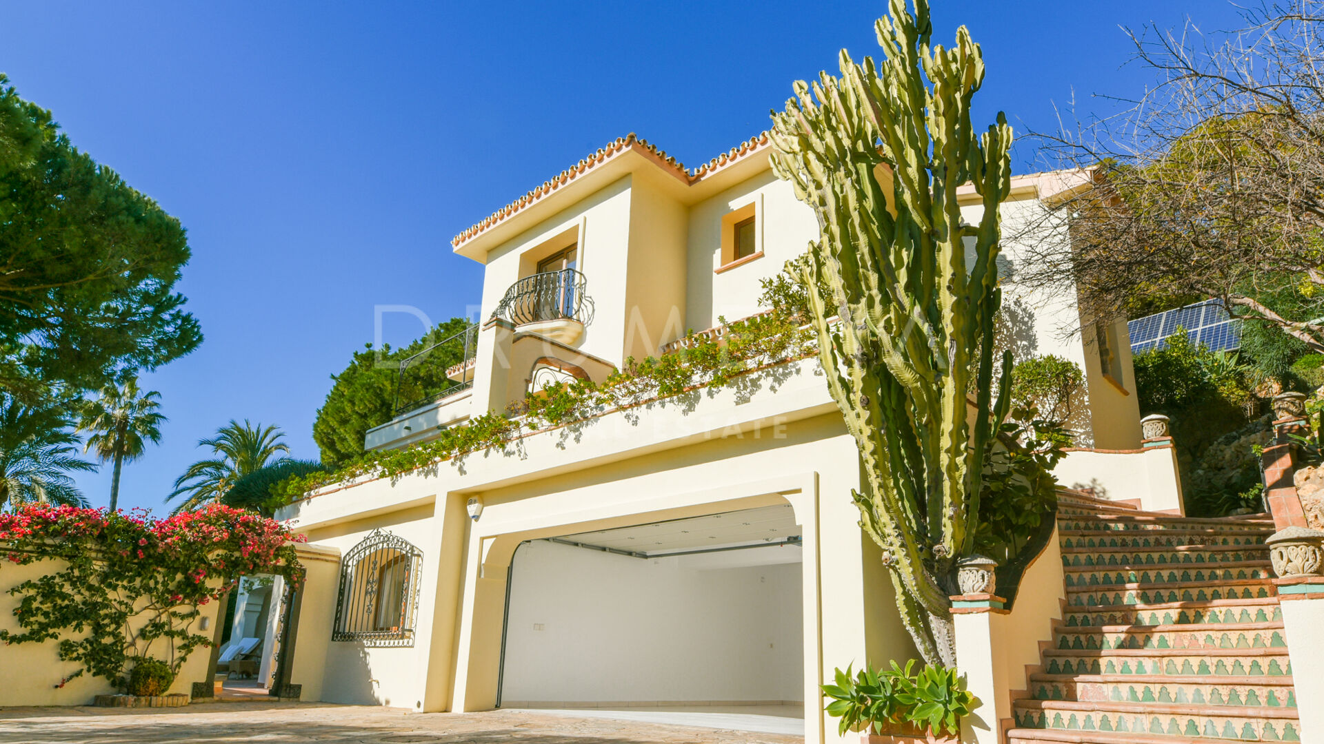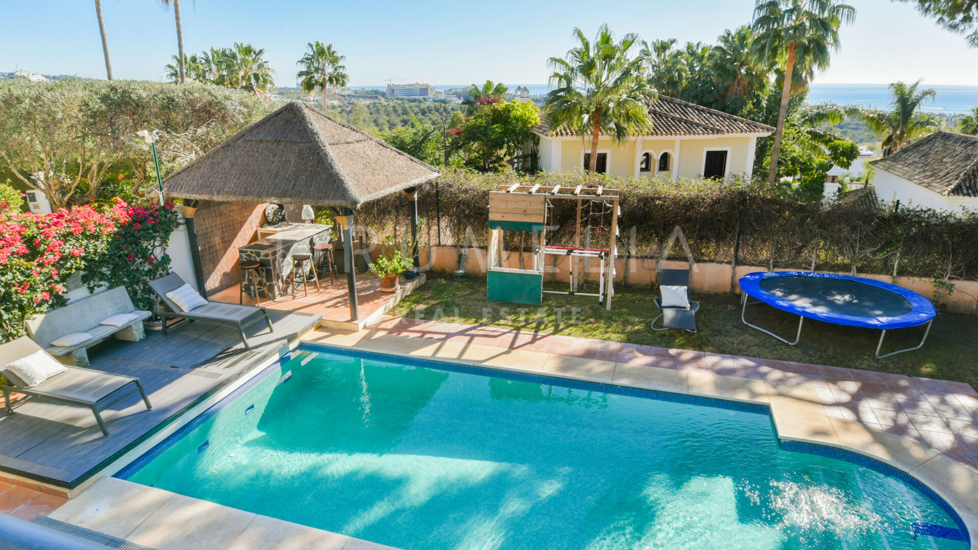 Se pone a la venta esta excepcional casa familiar de 5 dormitorios en la exclusiva zona de Río Real, Marbella, una de las más bellas y prestigiosas de la Costa del Sol, a sólo 5 minutos del centro de la ciudad. Ubicada en una parcela de 1.771 m², la espectacular propiedad de 497 m² disfruta del sol y de preciosas vistas al mar, con África y Gibraltar en el horizonte, y a la montaña.