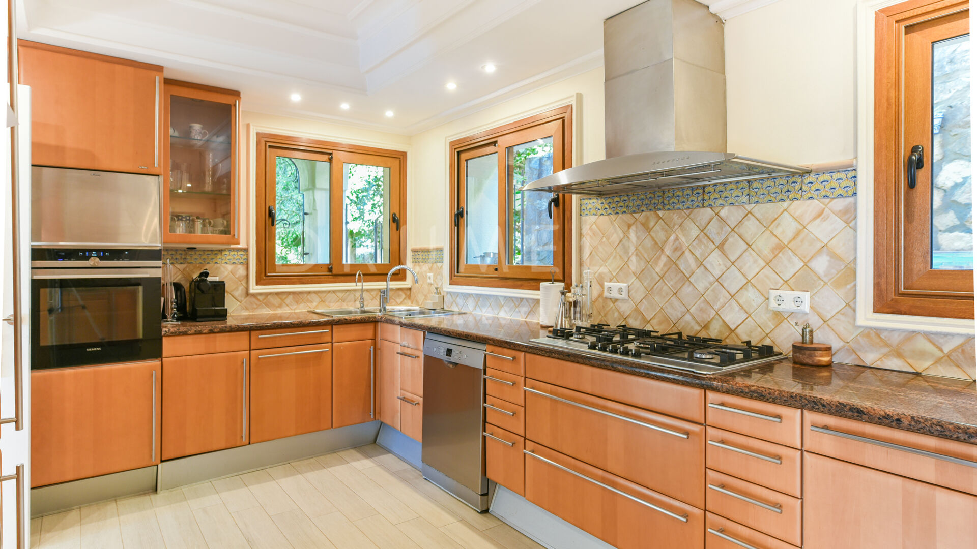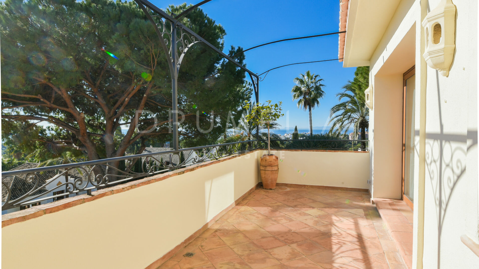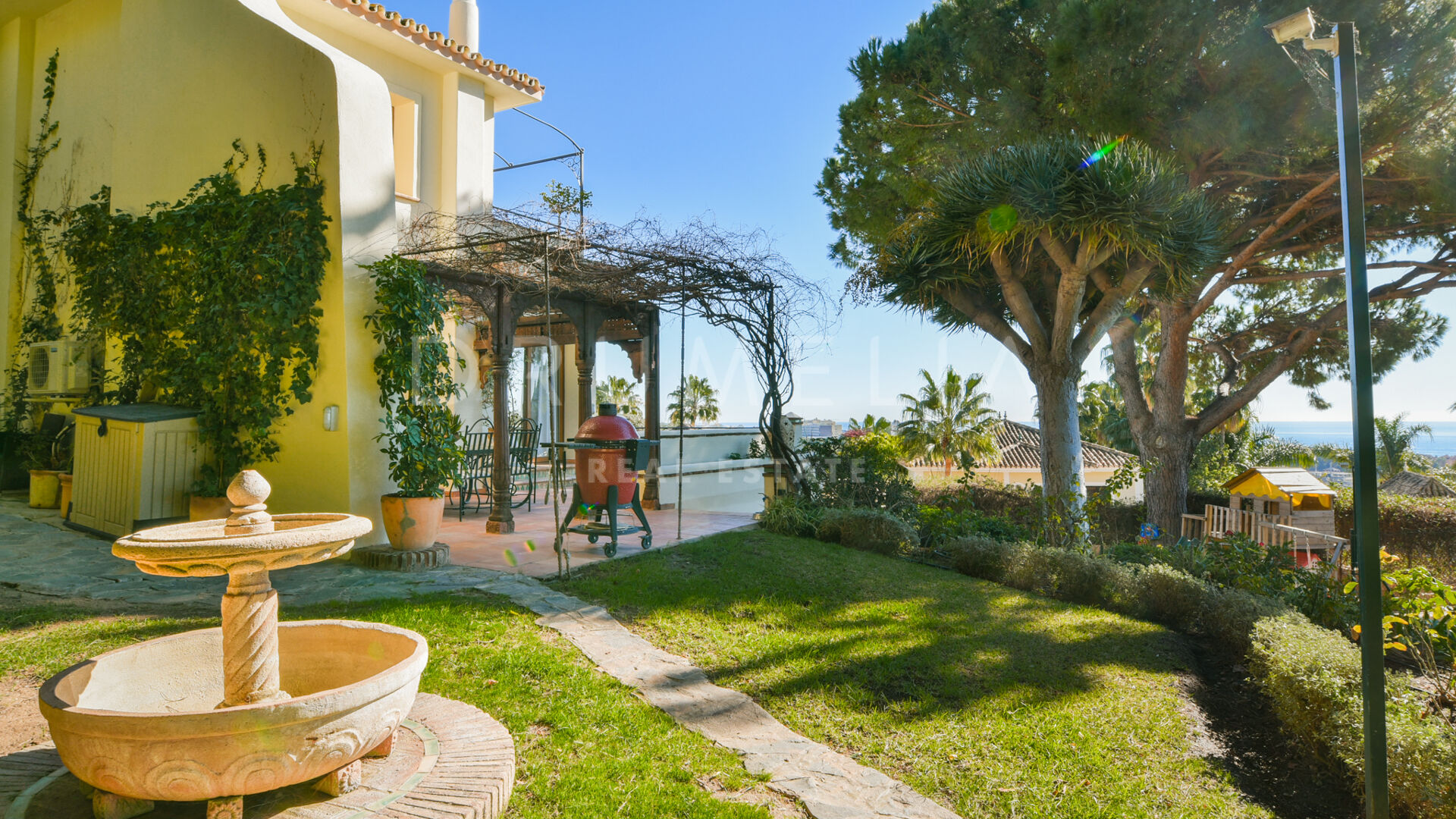 Rodeada de propiedades similares de alta gama y de una hermosa naturaleza, la magnífica casa está construida en 3 niveles y cuenta con 3 espaciosas suites para invitados, un apartamento para el personal y un enorme dormitorio principal con zona de estar e impresionante vestidor. El amplio y acogedor salón con una zona de relax junto a una chimenea comunica con la fantástica cocina totalmente equipada, conectada con un elegante comedor familiar. Se abre a las amplias terrazas con increíbles vistas panorámicas al mar y a toda la costa. El nivel inferior ofrece alojamiento para invitados o para el personal, con una cocina, un dormitorio adicional, un rincón vinoteca y un gran centro SPA con sauna de infrarrojos y sala de vapor (baño turco). Esta propiedad tiene un amplio garaje cubierto para 2 coches y otras 2 plazas de aparcamiento descubiertas. La gran parcela tiene 2 niveles; en el nivel superior hay una pérgola junto a una piscina, una zona infantil y mucho más, mientras que en otra zona hay árboles frutales y pinos mediterráneos. Las terrazas cubiertas, soleadas y privadas de 116 m² invitan a disfrutar del estilo de vida mediterráneo
