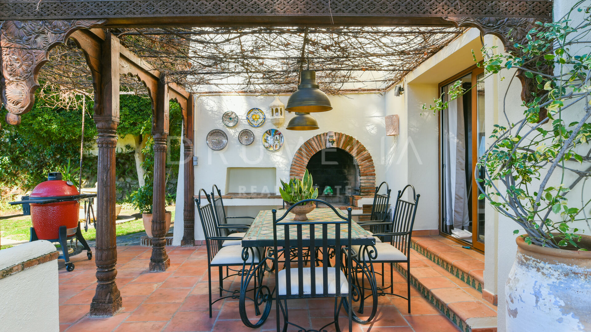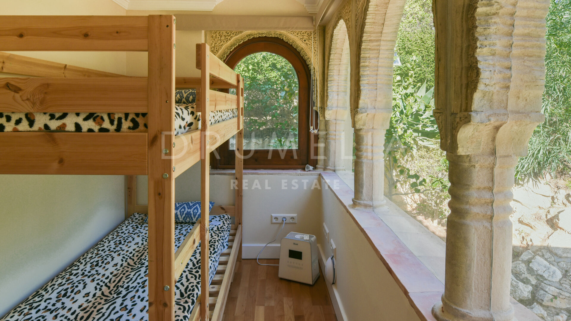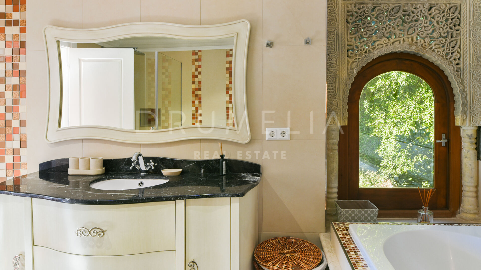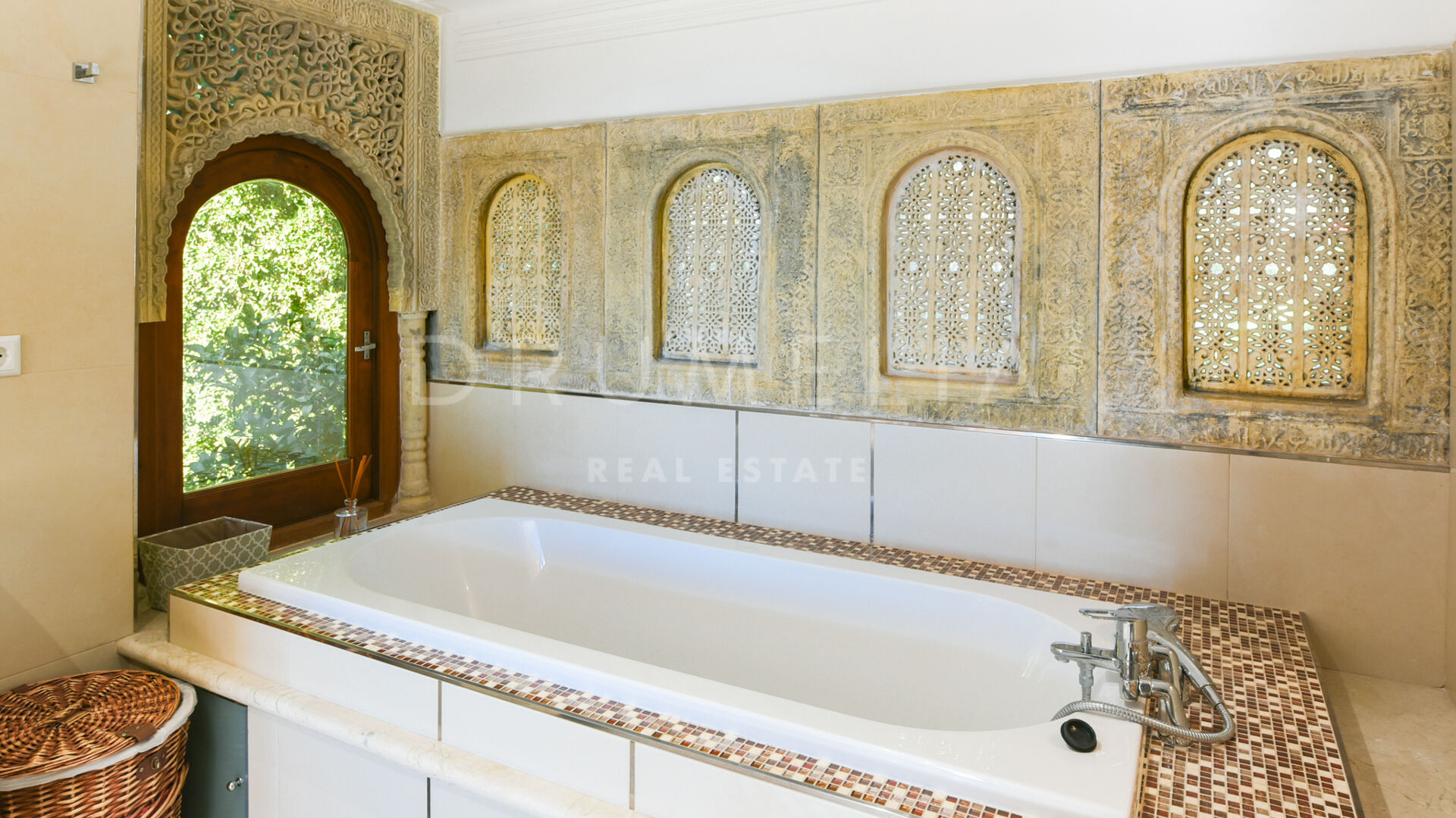 La impresionante casa de Marbella Este se vende en buen estado y con todas las prestaciones que necesitas, como aire acondicionado, doble acristalamiento, puertas de cristal, armarios empotrados, etc. Dispone de alarma y videovigilancia, sistemas eléctricos con placas solares fotovoltaicas y agua con inventor de primera calidad. Las características peculiares de esta villa son sus puertas y algunas de sus ventanas traídas de África. La impresionante chimenea de mármol, los suelos de mármol fino con calefacción por suelo radiante, los elementos decorativos distintivos de Al-Andalus, los nuevos suelos de mármol y los acabados de madera en los dormitorios añaden exclusividad a esta extraordinaria propiedad.