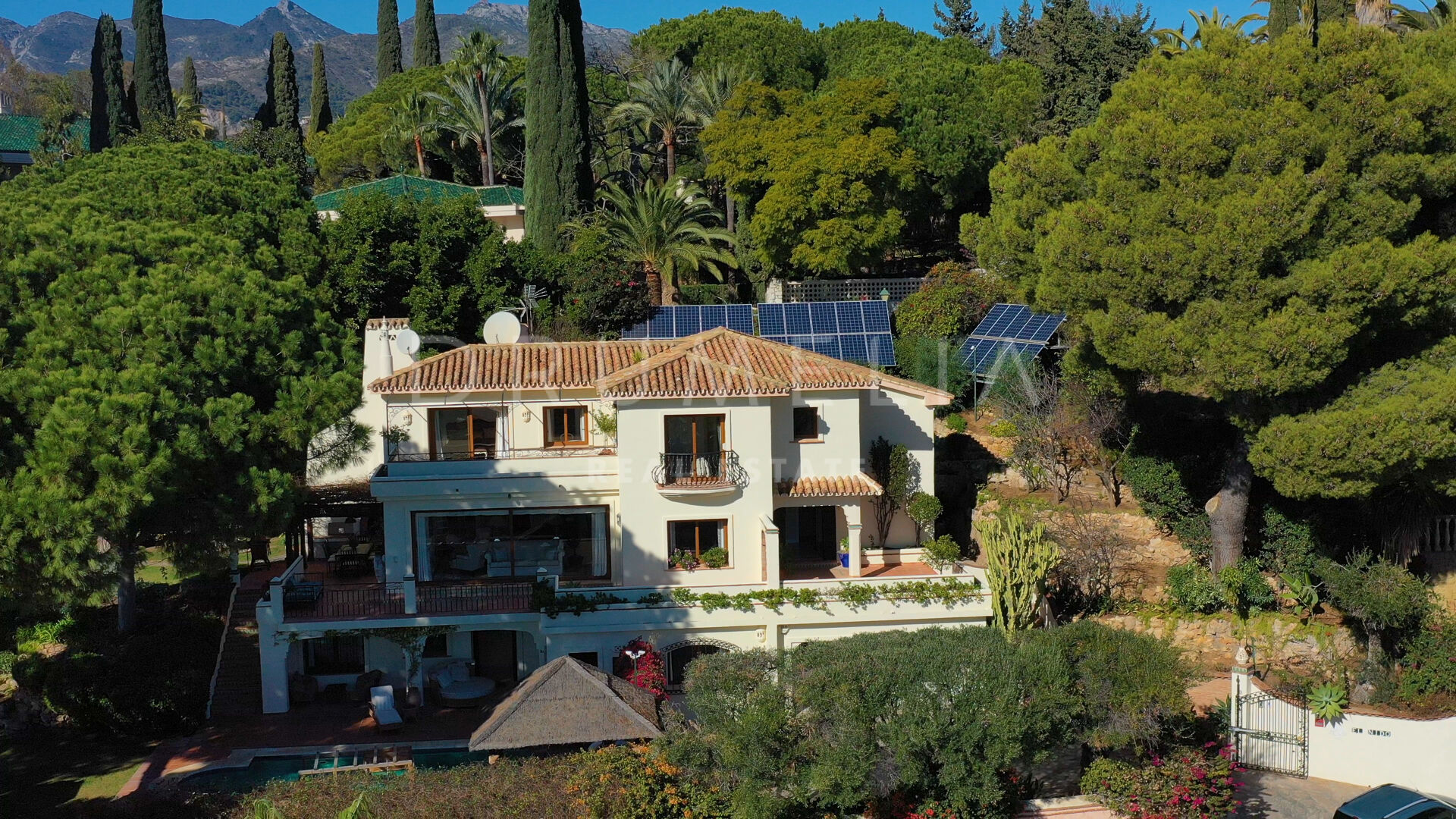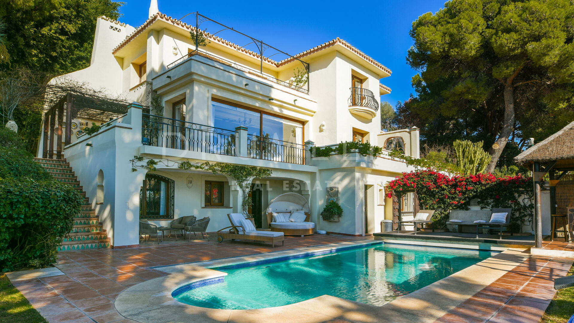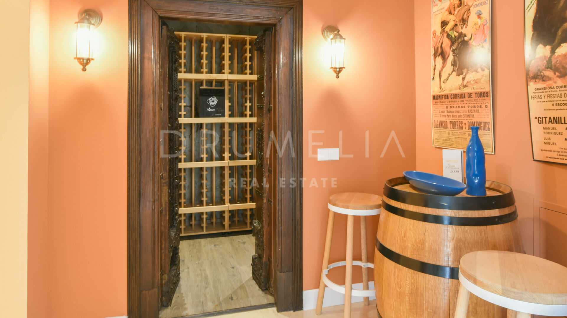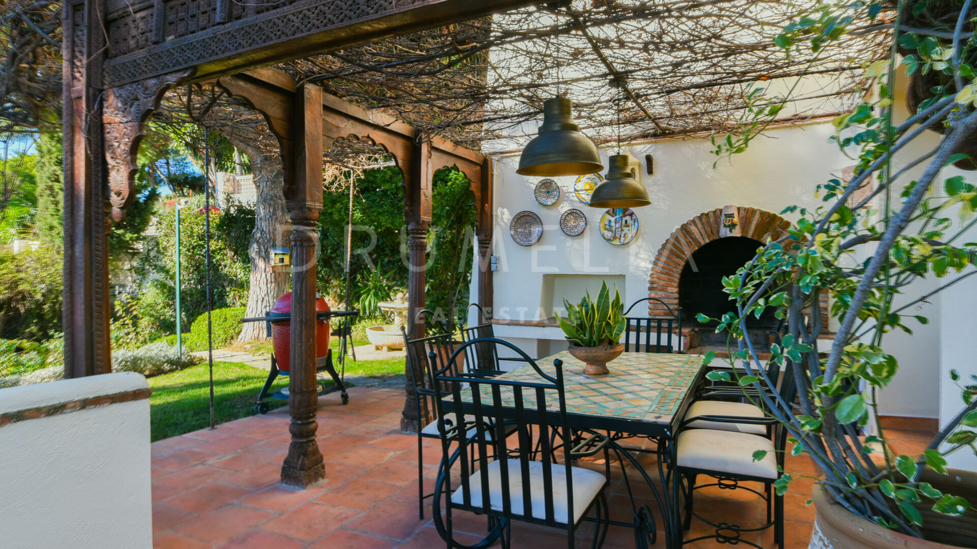 La impresionante casa de Marbella Este se vende en buen estado y con todas las prestaciones que necesitas, como aire acondicionado, doble acristalamiento, puertas de cristal, armarios empotrados, etc. Dispone de alarma y videovigilancia, sistemas eléctricos con placas solares fotovoltaicas y agua con inventor de primera calidad. Las características peculiares de esta villa son sus puertas y algunas de sus ventanas traídas de África. La impresionante chimenea de mármol, los suelos de mármol fino con calefacción por suelo radiante, los elementos decorativos distintivos de Al-Andalus, los nuevos suelos de mármol y los acabados de madera en los dormitorios añaden exclusividad a esta extraordinaria propiedad.