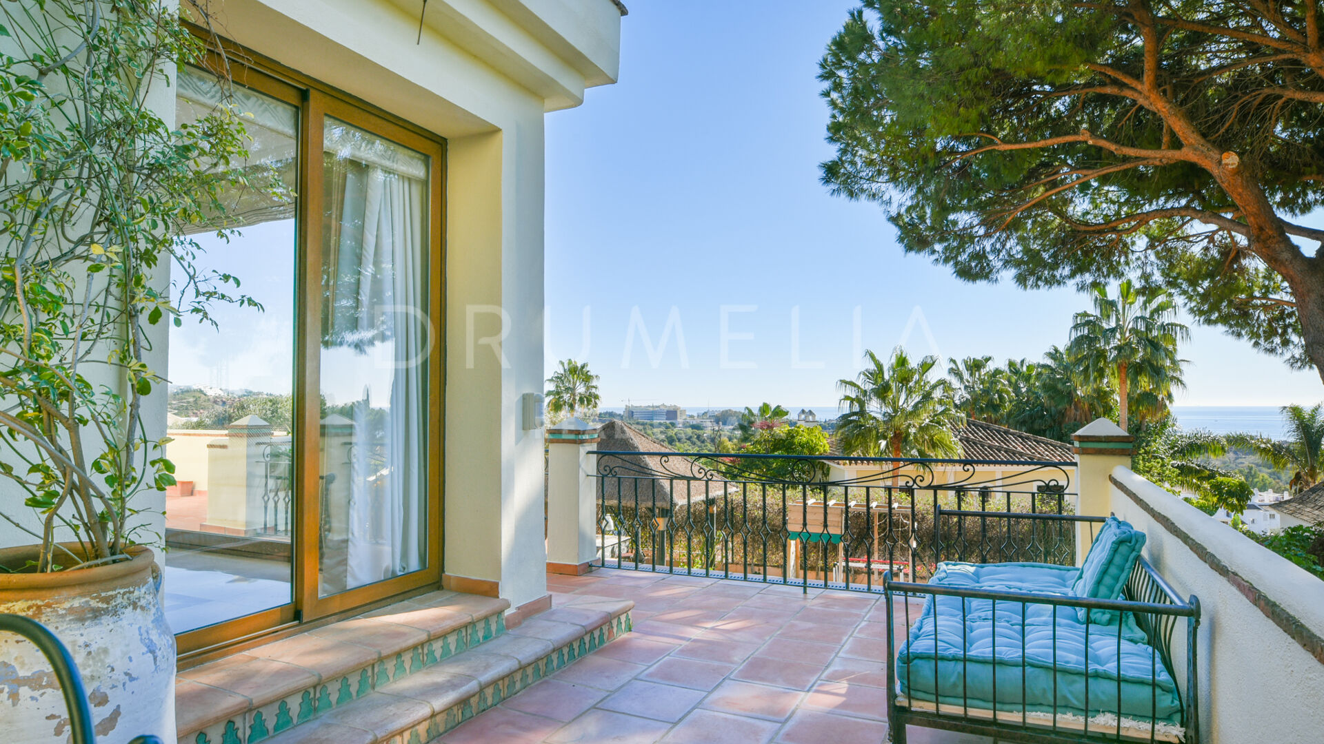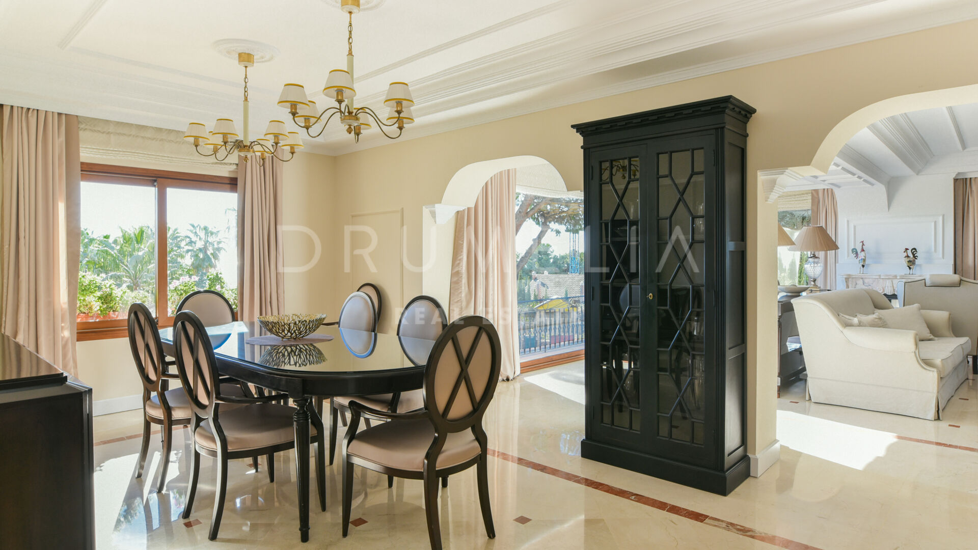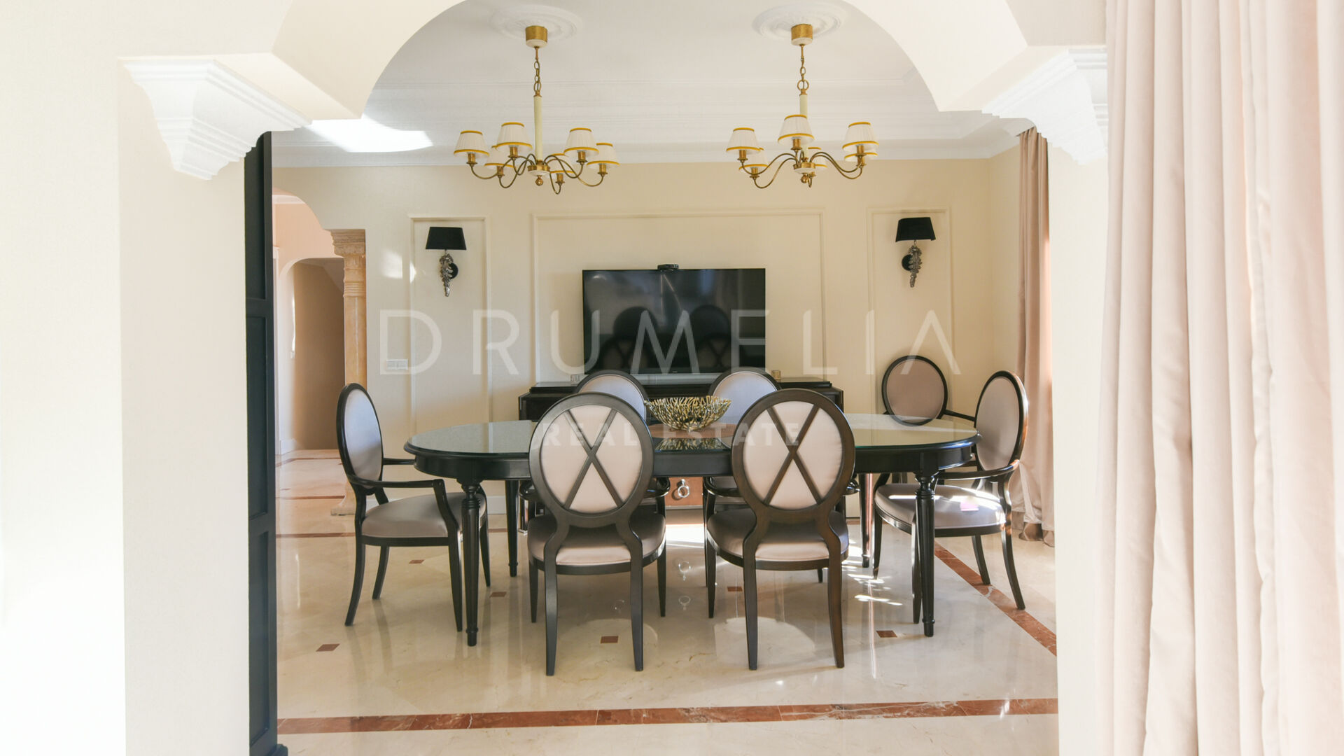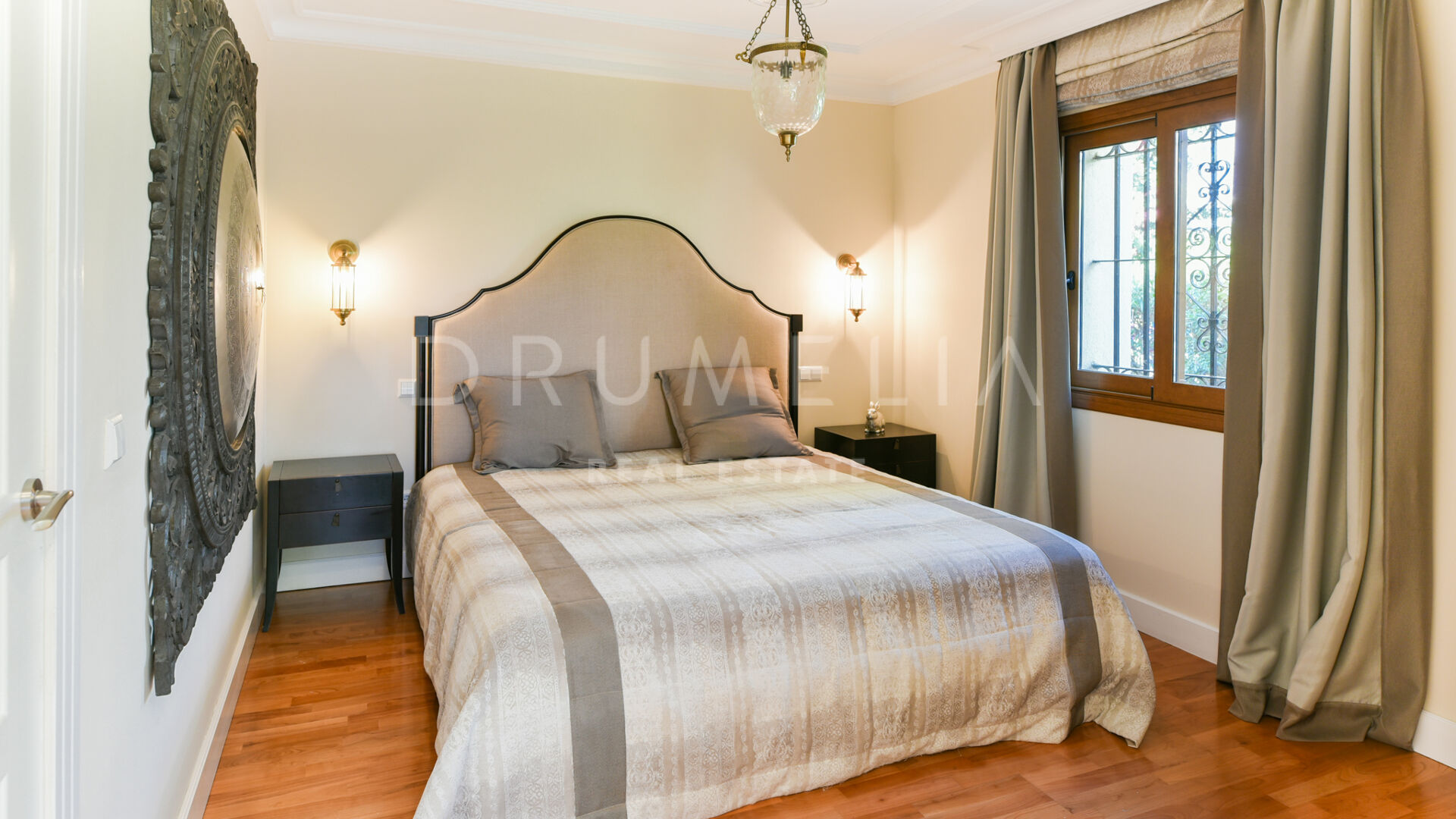 La impresionante casa de Marbella Este se vende en buen estado y con todas las prestaciones que necesitas, como aire acondicionado, doble acristalamiento, puertas de cristal, armarios empotrados, etc. Dispone de alarma y videovigilancia, sistemas eléctricos con placas solares fotovoltaicas y agua con inventor de primera calidad. Las características peculiares de esta villa son sus puertas y algunas de sus ventanas traídas de África. La impresionante chimenea de mármol, los suelos de mármol fino con calefacción por suelo radiante, los elementos decorativos distintivos de Al-Andalus, los nuevos suelos de mármol y los acabados de madera en los dormitorios añaden exclusividad a esta extraordinaria propiedad.