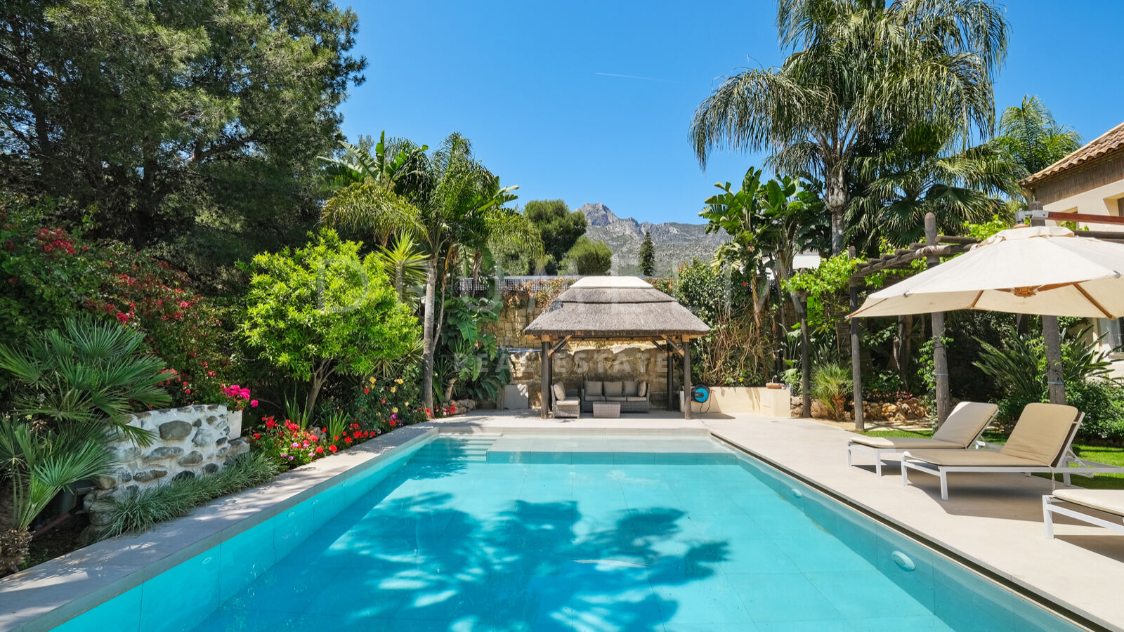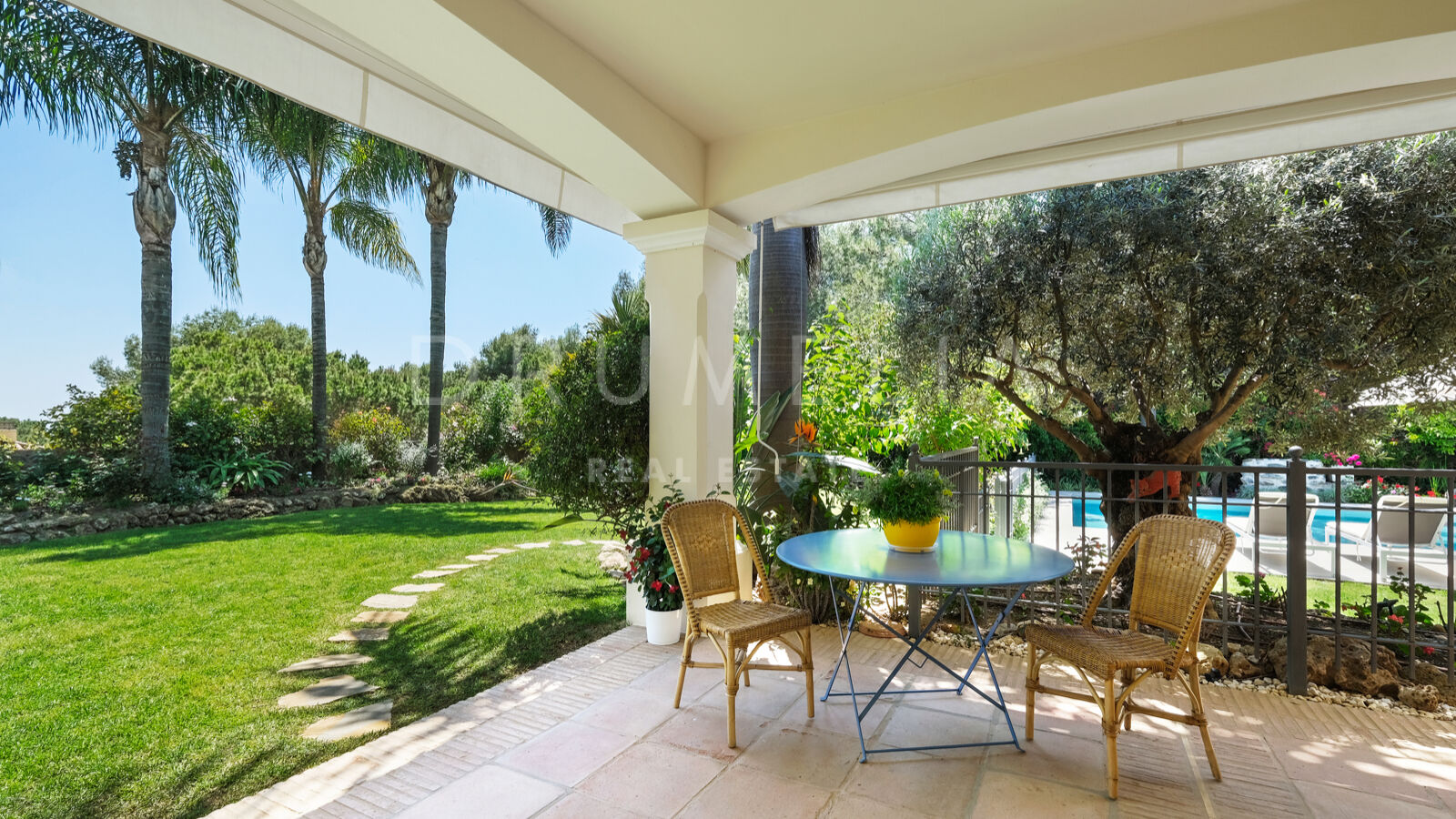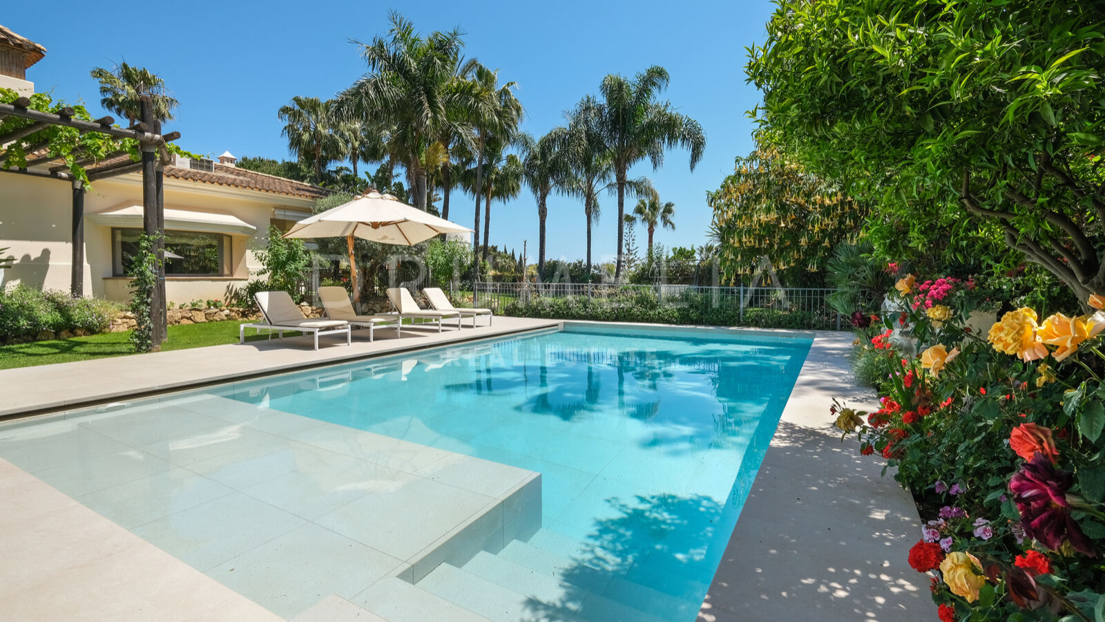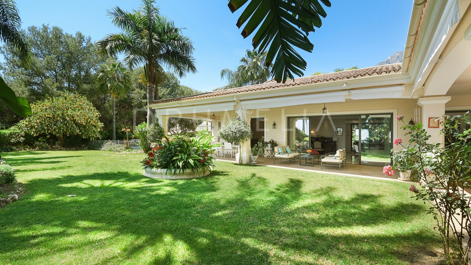 Disfrutarás de la perfecta conexión entre la vida interior y exterior en esta planta, ya que la cocina, el salón y el comedor, y 2 dormitorios en suite se abren a las amplias terrazas y a un jardín meticulosamente ajardinado. Invitando a disfrutar del mundialmente famoso estilo de vida mediterráneo, la parcela cuenta con una piscina equipada con sistema de ósmosis, un solárium, un exótico pabellón con zona de estar que garantiza puro disfrute y relajación en la intimidad de tu propio oasis. Los jardines con un olivo centenario, palmeras y una cuidada vegetación subtropical permiten disfrutar del romántico olor de las flores en el aire, y del sonido de las abejas zumbando alrededor de hermosas rosas.