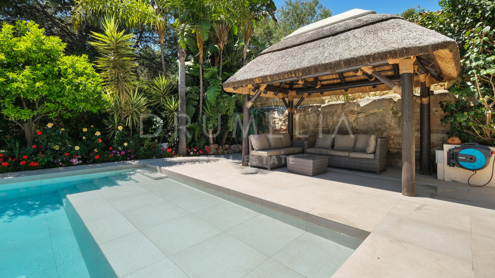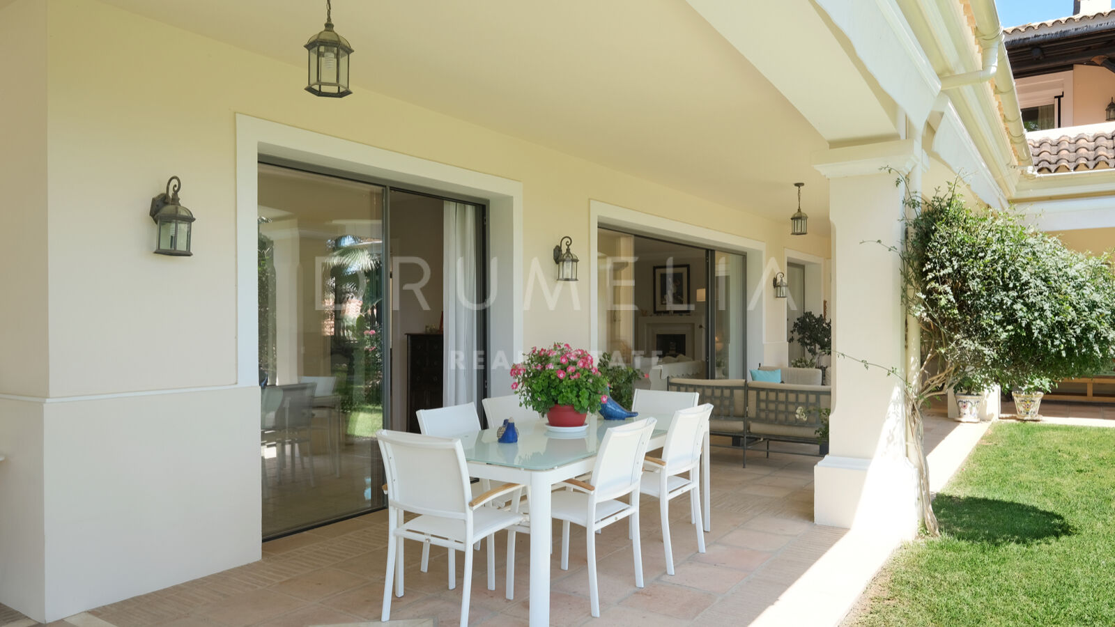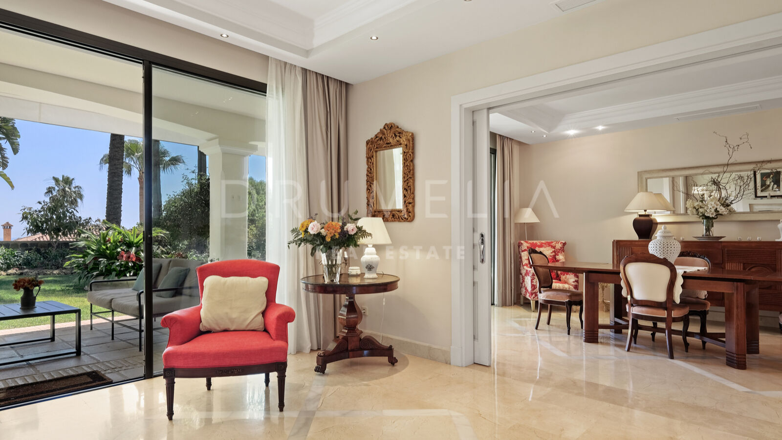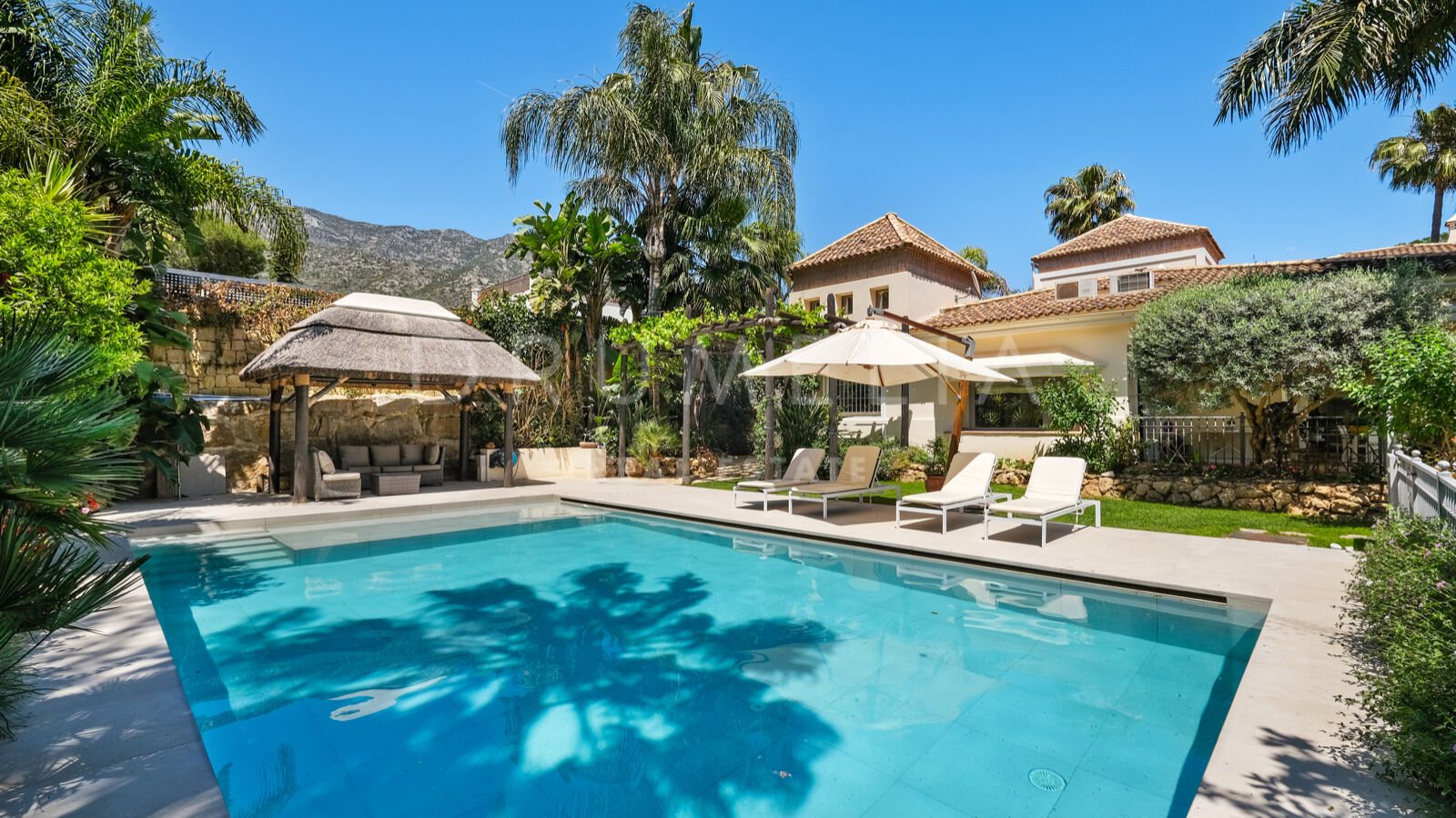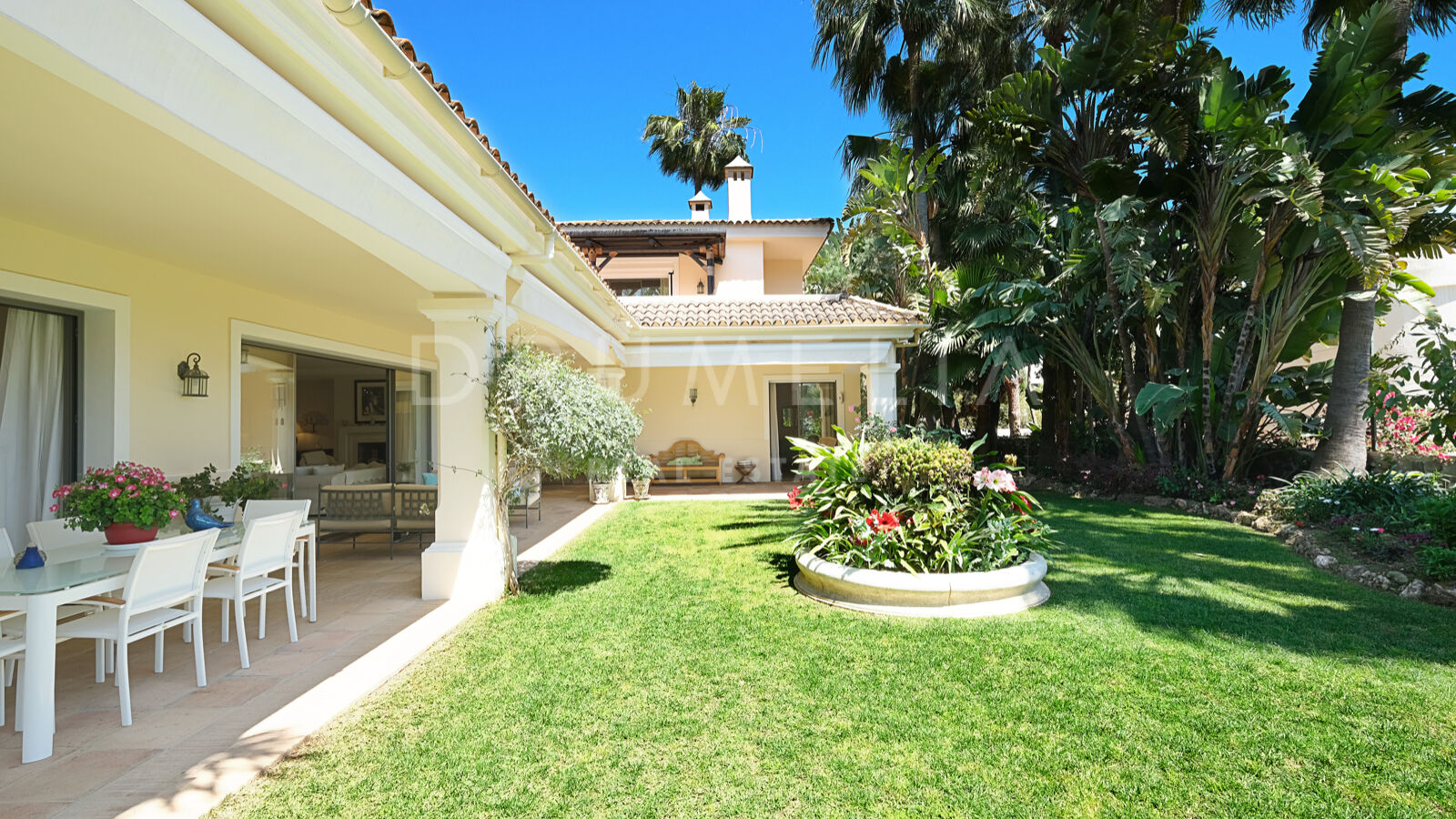Disfrutarás de la perfecta conexión entre la vida interior y exterior en esta planta, ya que la cocina, el salón y el comedor, y 2 dormitorios en suite se abren a las amplias terrazas y a un jardín meticulosamente ajardinado. Invitando a disfrutar del mundialmente famoso estilo de vida mediterráneo, la parcela cuenta con una piscina equipada con sistema de ósmosis, un solárium, un exótico pabellón con zona de estar que garantiza puro disfrute y relajación en la intimidad de tu propio oasis. Los jardines con un olivo centenario, palmeras y una cuidada vegetación subtropical permiten disfrutar del romántico olor de las flores en el aire, y del sonido de las abejas zumbando alrededor de hermosas rosas.