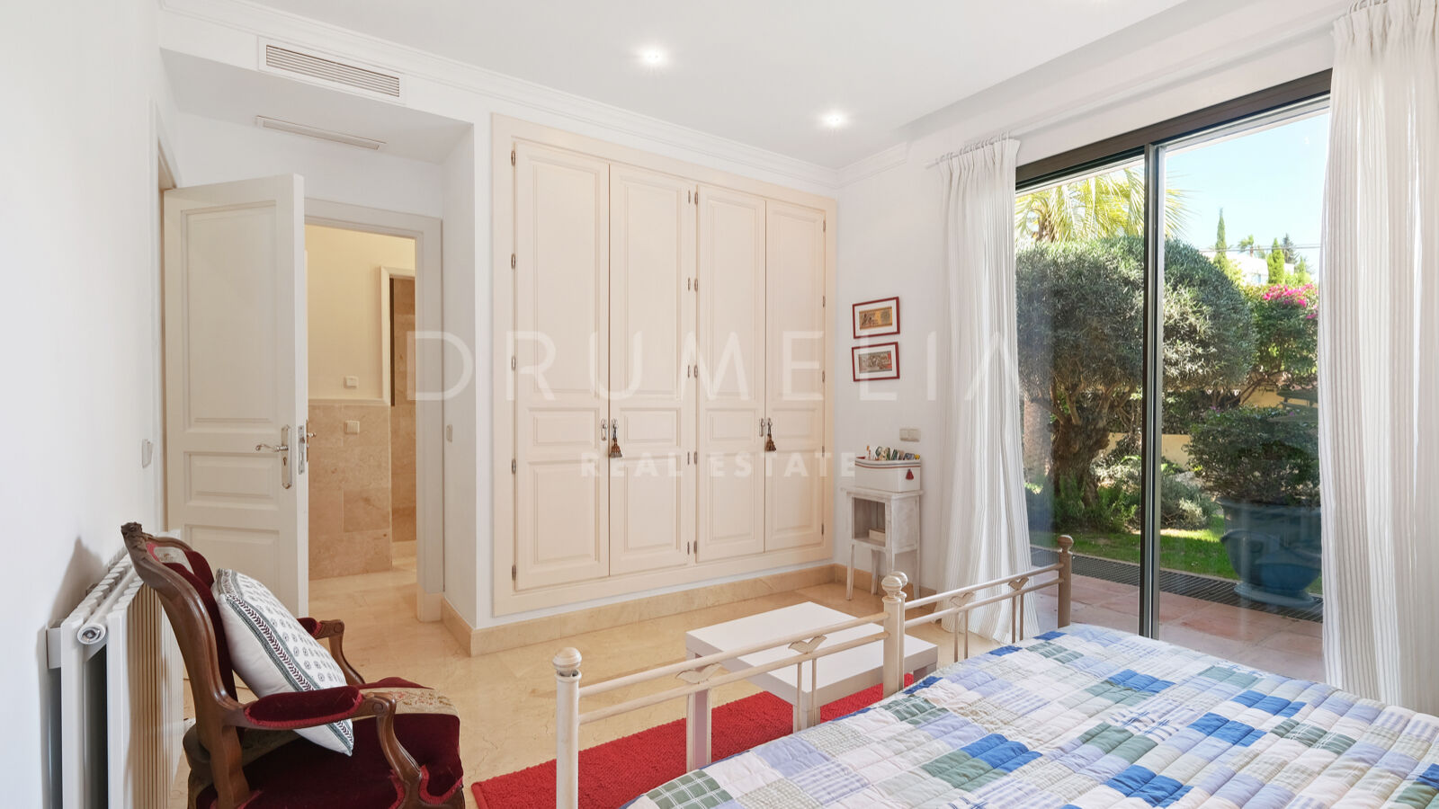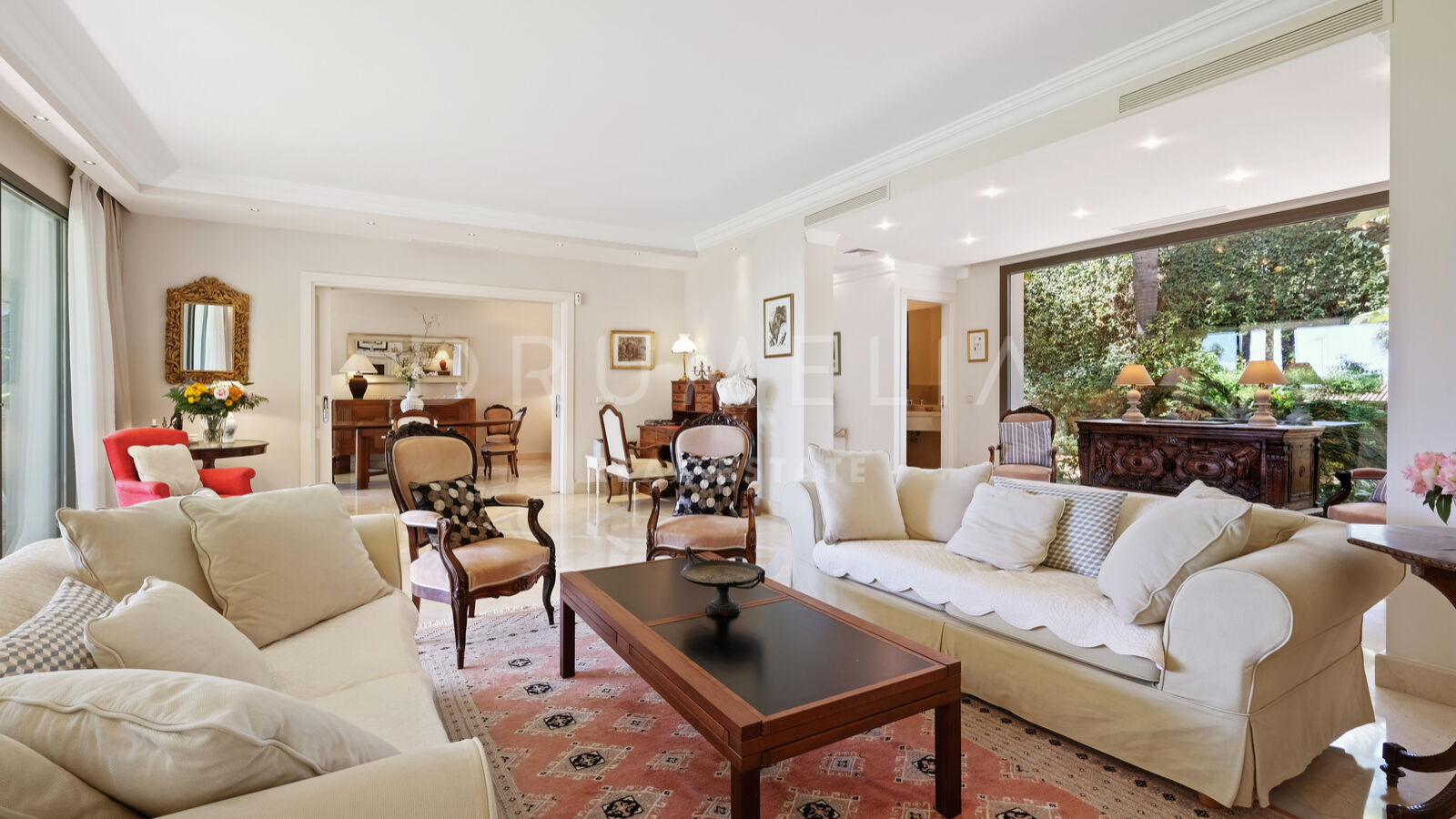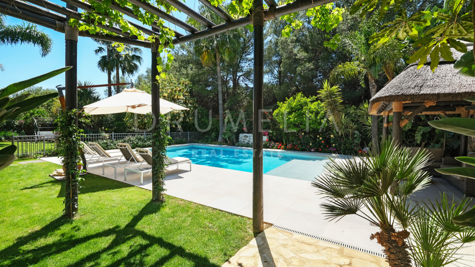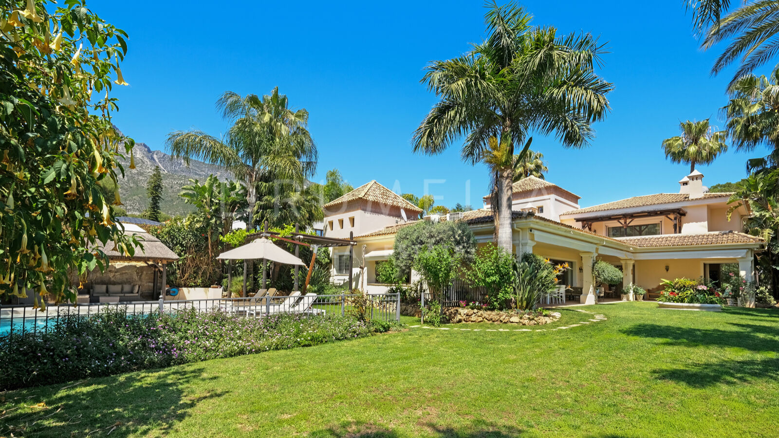 Disfrutarás de la perfecta conexión entre la vida interior y exterior en esta planta, ya que la cocina, el salón y el comedor, y 2 dormitorios en suite se abren a las amplias terrazas y a un jardín meticulosamente ajardinado. Invitando a disfrutar del mundialmente famoso estilo de vida mediterráneo, la parcela cuenta con una piscina equipada con sistema de ósmosis, un solárium, un exótico pabellón con zona de estar que garantiza puro disfrute y relajación en la intimidad de tu propio oasis. Los jardines con un olivo centenario, palmeras y una cuidada vegetación subtropical permiten disfrutar del romántico olor de las flores en el aire, y del sonido de las abejas zumbando alrededor de hermosas rosas.