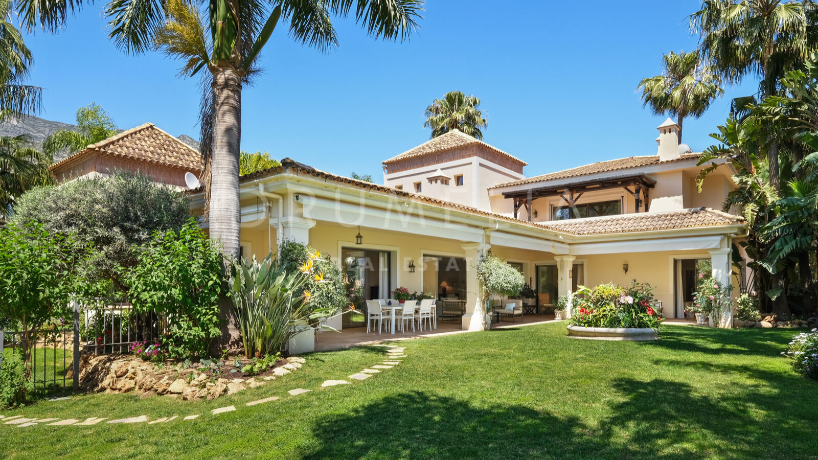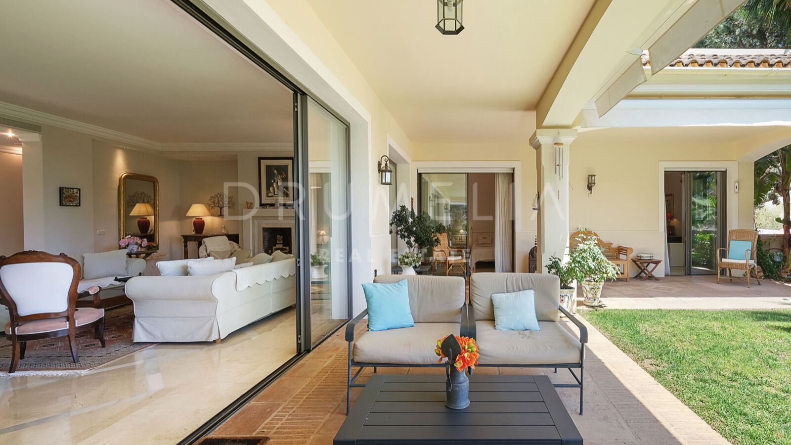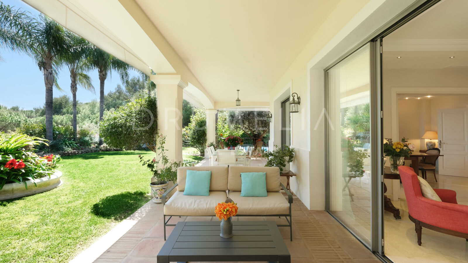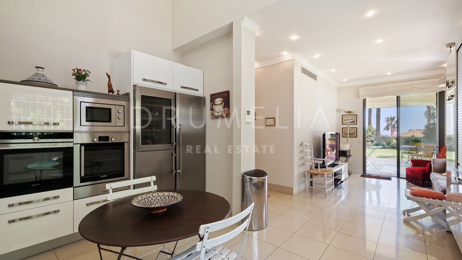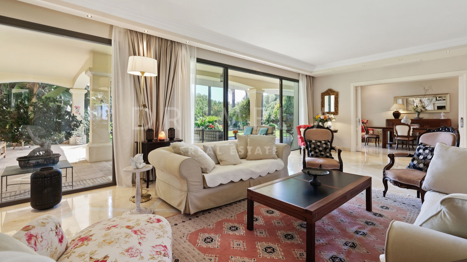 Disfrutarás de la perfecta conexión entre la vida interior y exterior en esta planta, ya que la cocina, el salón y el comedor, y 2 dormitorios en suite se abren a las amplias terrazas y a un jardín meticulosamente ajardinado. Invitando a disfrutar del mundialmente famoso estilo de vida mediterráneo, la parcela cuenta con una piscina equipada con sistema de ósmosis, un solárium, un exótico pabellón con zona de estar que garantiza puro disfrute y relajación en la intimidad de tu propio oasis. Los jardines con un olivo centenario, palmeras y una cuidada vegetación subtropical permiten disfrutar del romántico olor de las flores en el aire, y del sonido de las abejas zumbando alrededor de hermosas rosas.