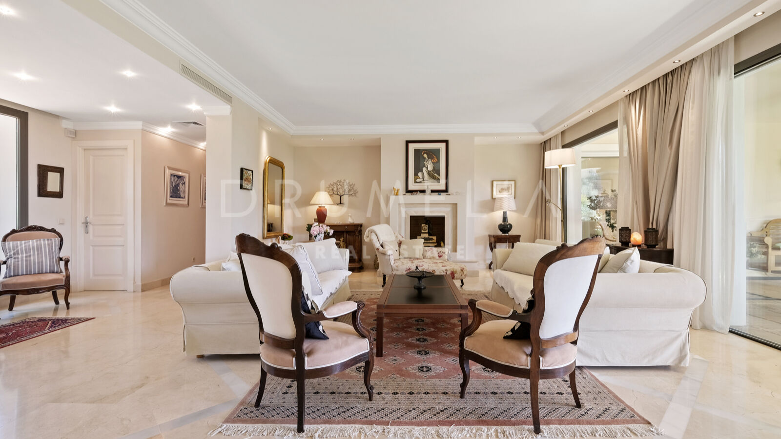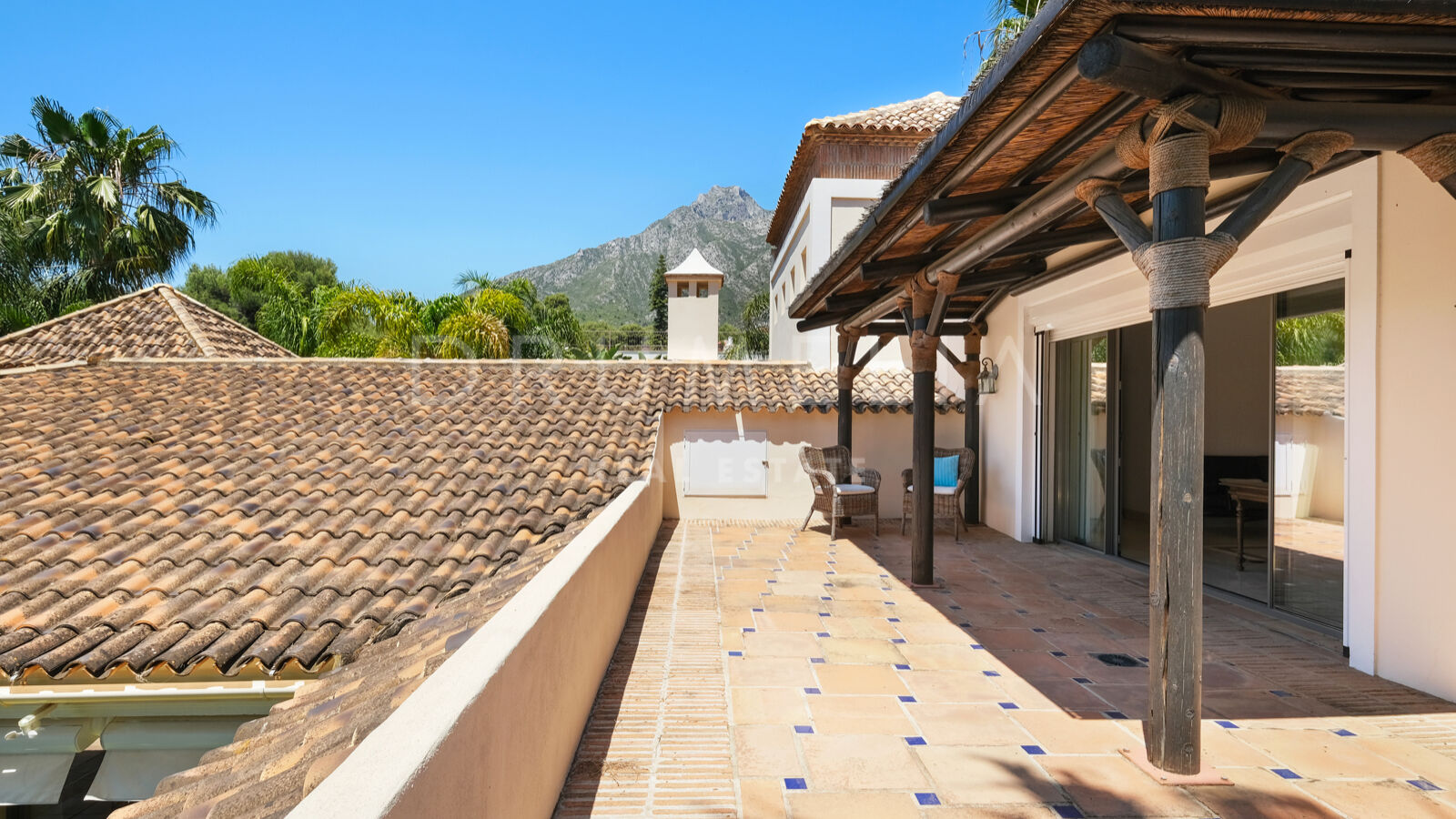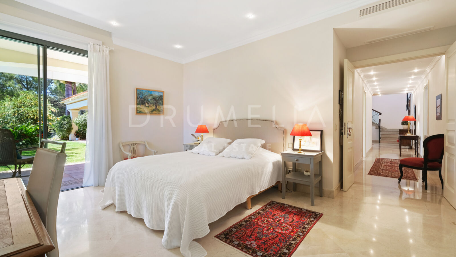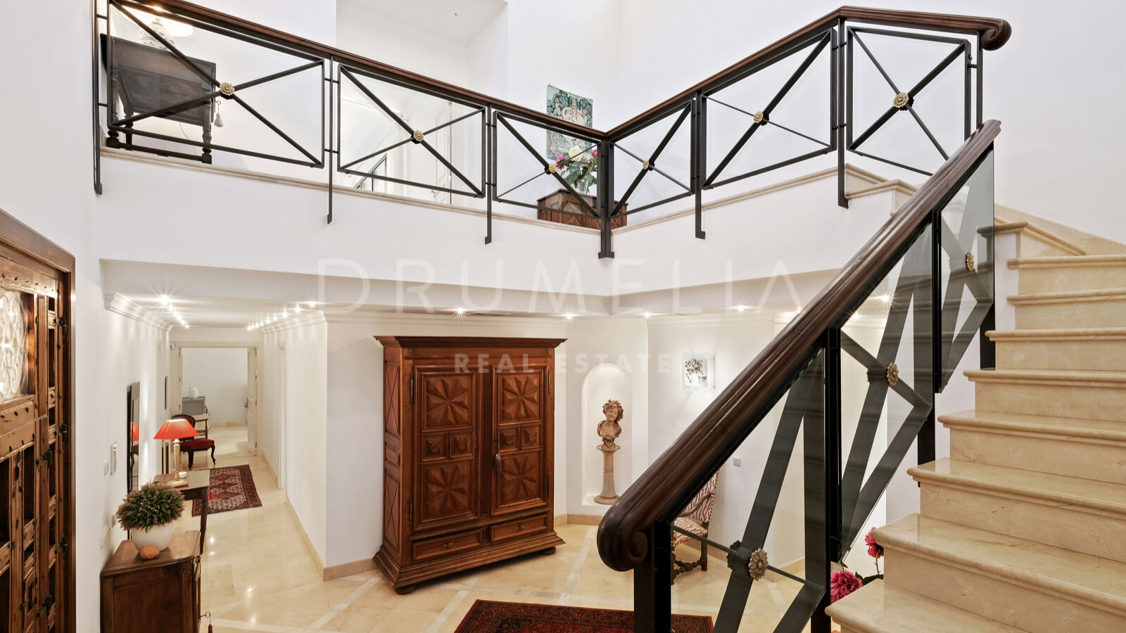 Rodeada de zonas verdes y propiedades de lujo de la Milla de Oro, la casa de 538 m² orientada al sur se asienta sobre una pintoresca parcela de 1.500 m² con impresionantes vistas a la montaña de La Concha, el mar y un entorno de ensueño. La impresionante entrada de la villa está dividida en 2 zonas distintas. A un lado, las suites de 3 dormitorios ofrecen intimidad y comodidad para la familia o los invitados. Al otro lado, encontrarás una luminosa sala de estar con una cautivadora chimenea, que se transforma a la perfección en una elegante zona de comedor. Una moderna cocina totalmente equipada y una acogedora sala de TV completan esta planta.