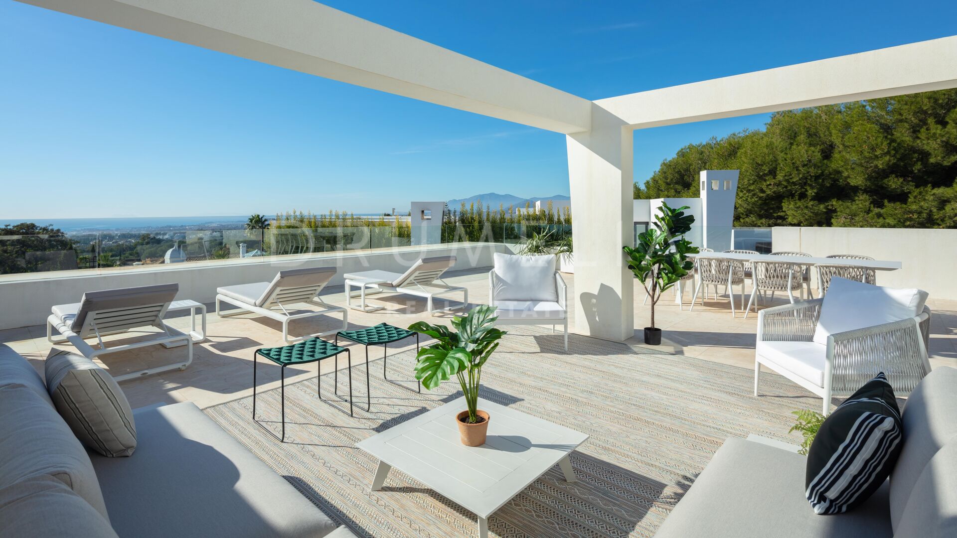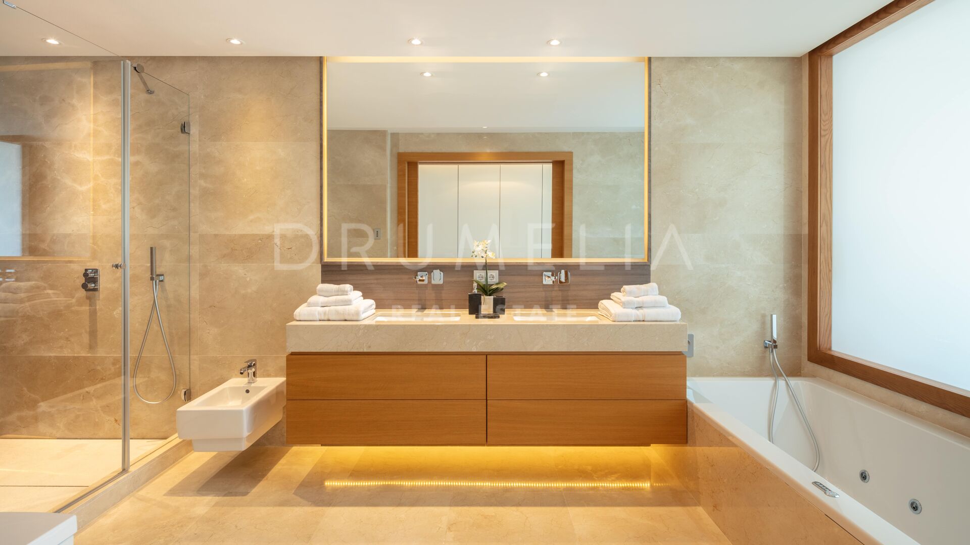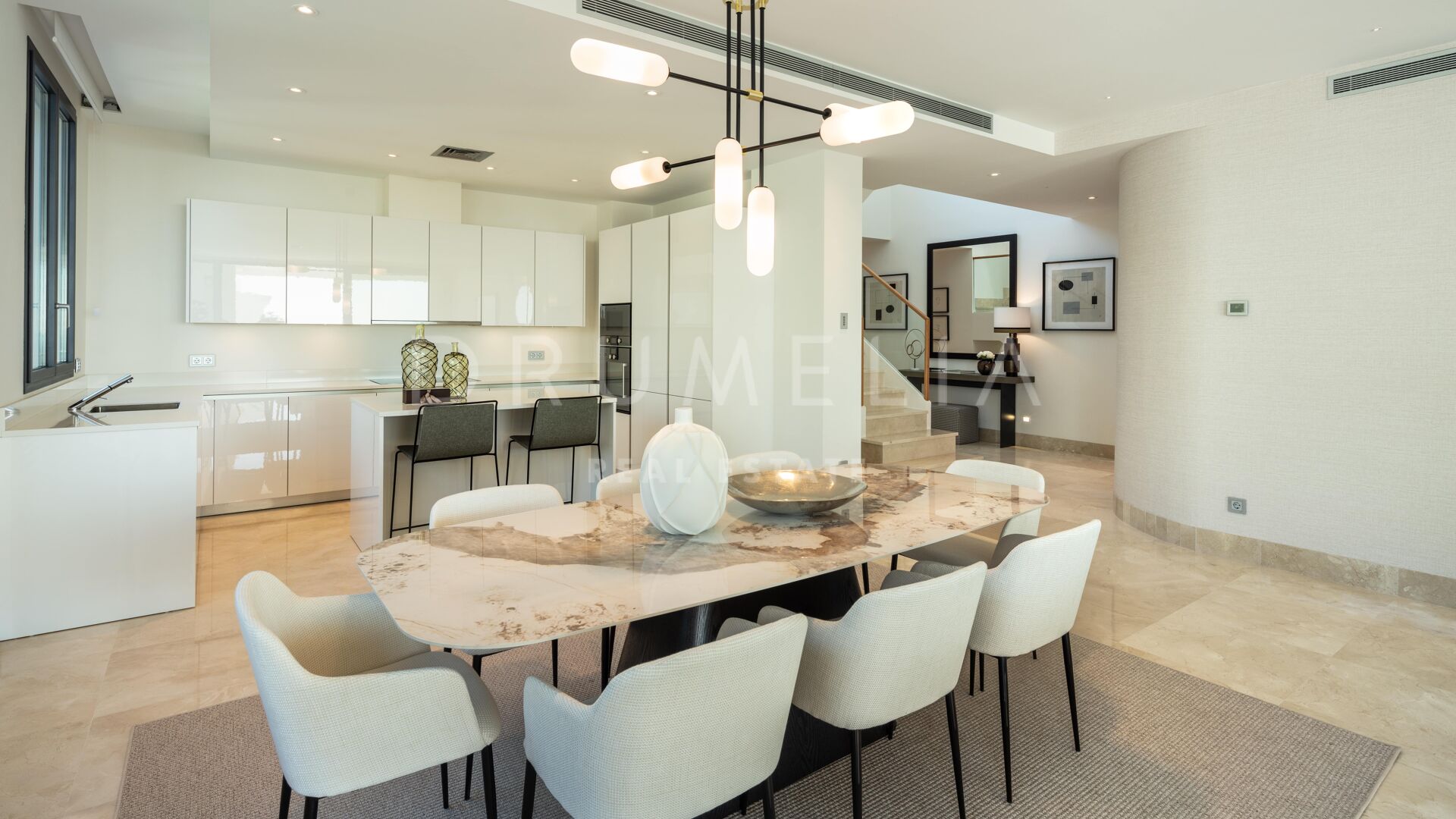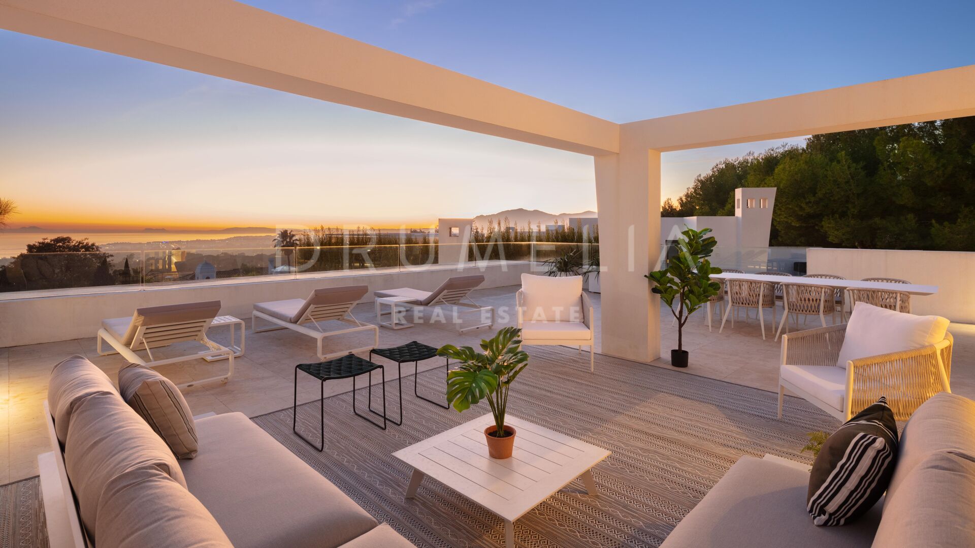 Este ático dúplex bellamente presentado se ofrece a la venta en la prestigiosa comunidad residencial de Sierra Blanca, a poca distancia de todos los servicios de la Milla de Oro, del legendario hotel Marbella Club y Puente Romano y de la playa. El moderno apartamento de lujo de 528 m² está situado en la comunidad cerrada ecológica de Reserva de Sierra Blanca, conocida por sus apartamentos dúplex extragrandes, su alto nivel de seguridad (cámaras de vigilancia, servicio de seguridad 24 h), sus cuidadas zonas comunes y sus vistas panorámicas al mar. Situada en una privilegiada posición elevada, esta urbanización contemporánea perfectamente elaborada presume de refinamiento estético, confort y espectaculares vistas de la emblemática montaña de La Concha, la costa, el puerto y el mar Mediterráneo hasta África.