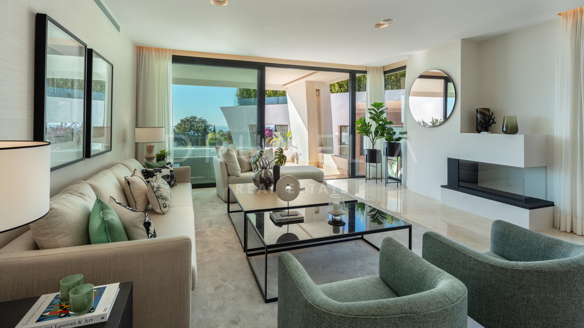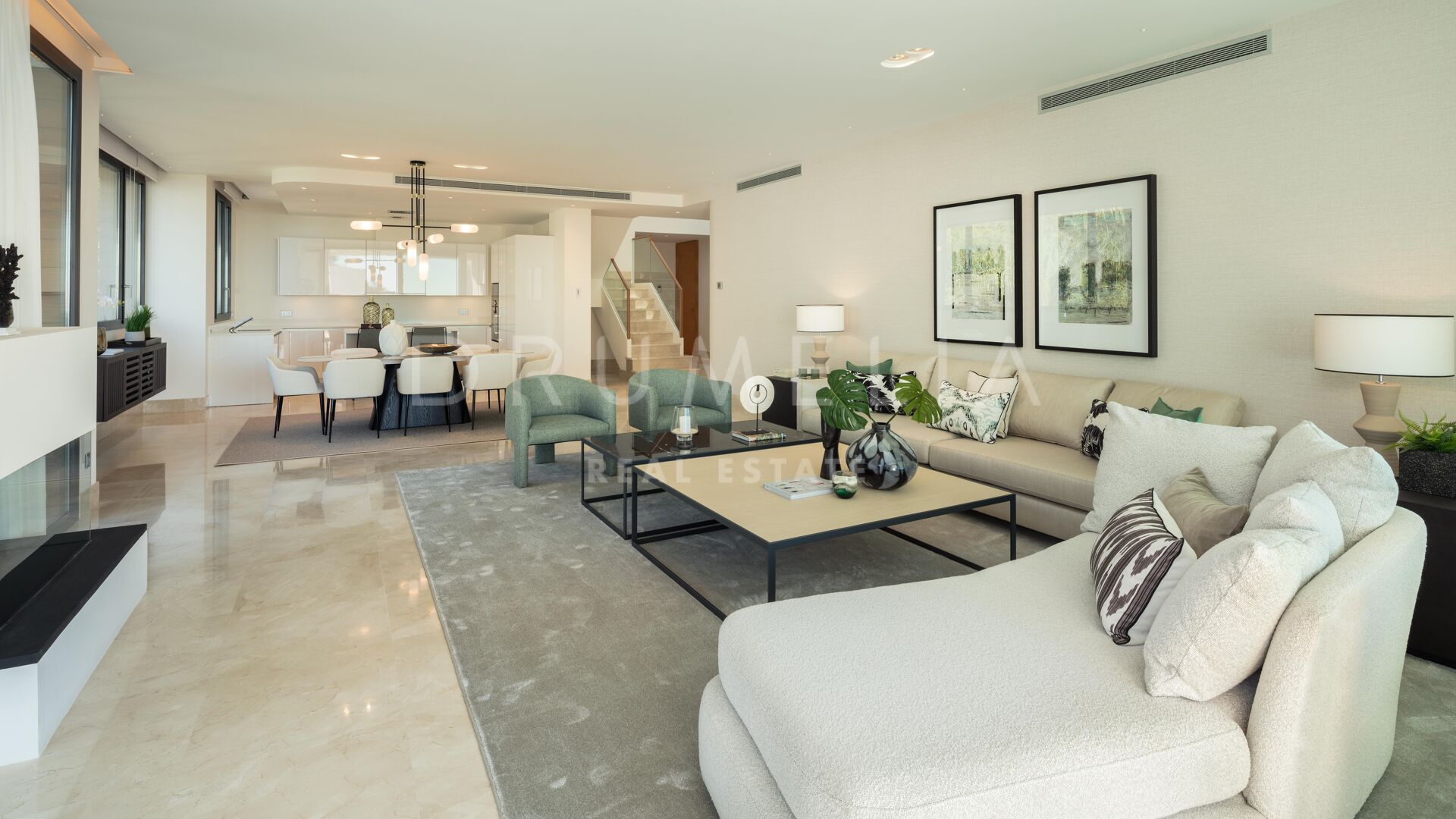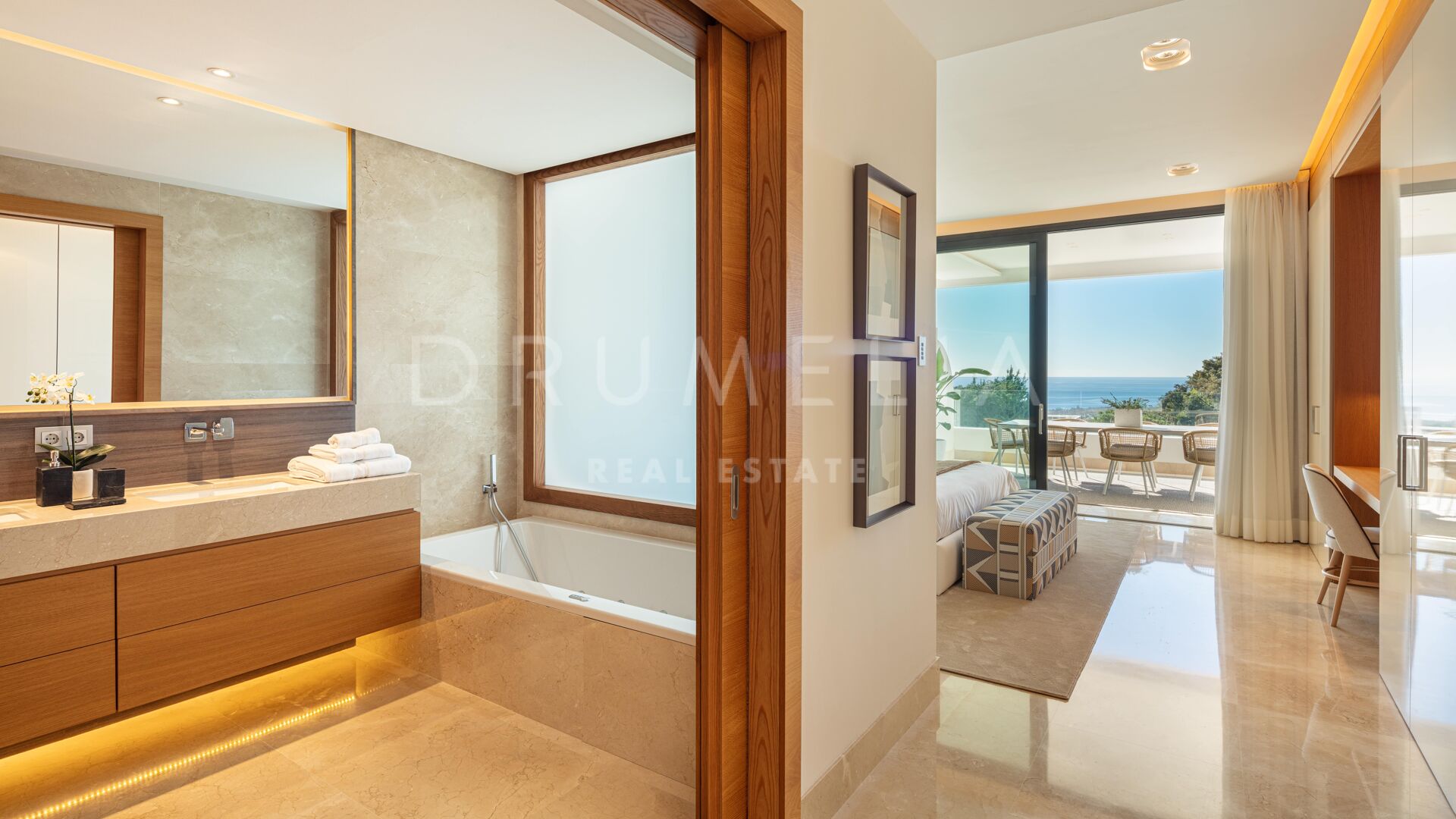 Este ático dúplex bellamente presentado se ofrece a la venta en la prestigiosa comunidad residencial de Sierra Blanca, a poca distancia de todos los servicios de la Milla de Oro, del legendario hotel Marbella Club y Puente Romano y de la playa. El moderno apartamento de lujo de 528 m² está situado en la comunidad cerrada ecológica de Reserva de Sierra Blanca, conocida por sus apartamentos dúplex extragrandes, su alto nivel de seguridad (cámaras de vigilancia, servicio de seguridad 24 h), sus cuidadas zonas comunes y sus vistas panorámicas al mar. Situada en una privilegiada posición elevada, esta urbanización contemporánea perfectamente elaborada presume de refinamiento estético, confort y espectaculares vistas de la emblemática montaña de La Concha, la costa, el puerto y el mar Mediterráneo hasta África.
