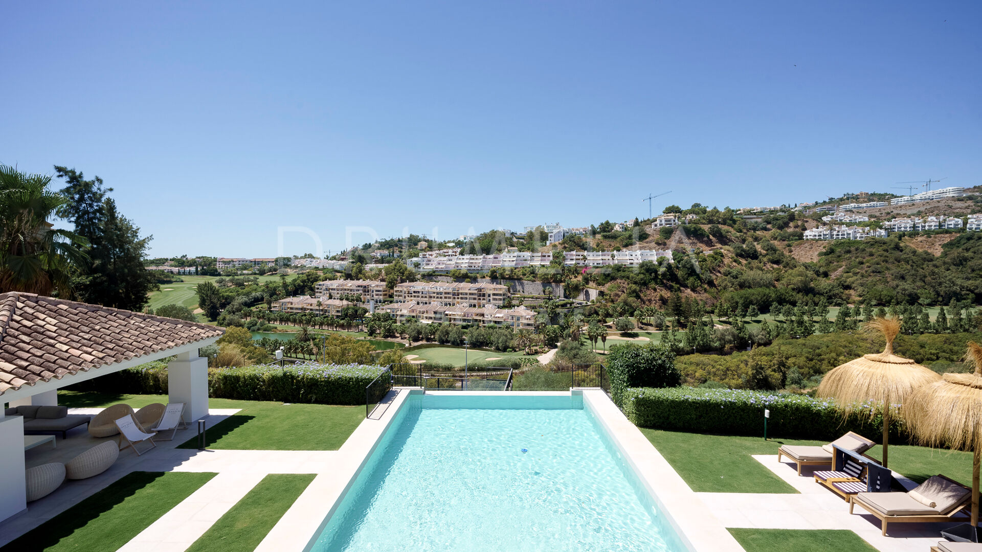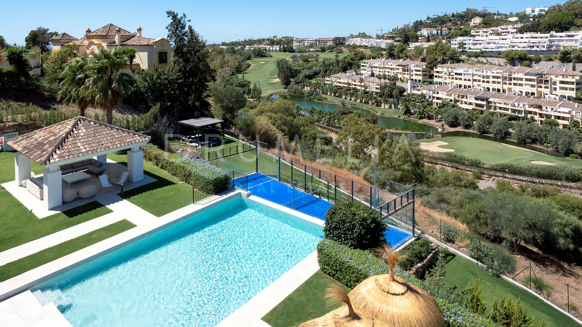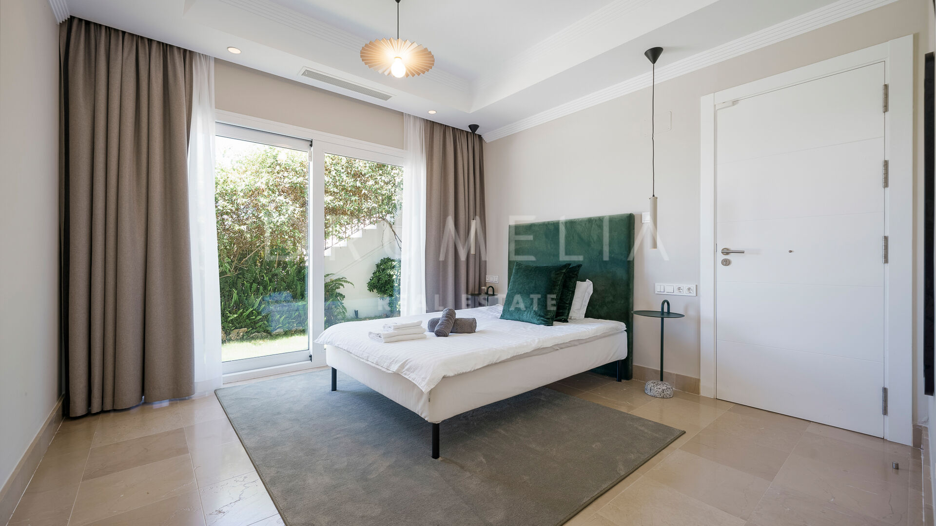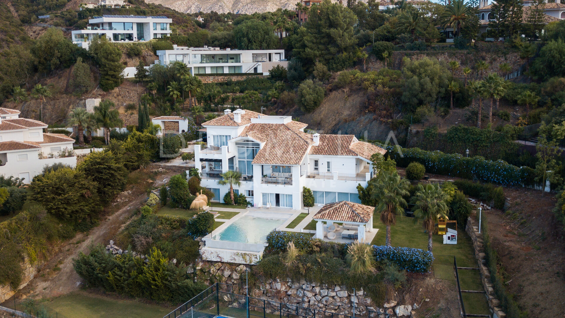 Rodeada de propiedades de lujo similares y hermosa naturaleza, la casa de 920 m² con una gran parcela pintoresca de 3.500 m² ofrece una abundante vida interior y exterior con un toque de moderno chic mediterráneo. Ha sido recientemente reformada, renovada con gusto y estilo, manteniendo el encantador estilo andaluz en el exterior e introduciendo un toque de lujo contemporáneo y especificaciones de alta calidad en el interior. La espectacular propiedad de alto standing tiene orientación oeste y goza de encantadoras vistas al golf. Promete a sus propietarios y a sus invitados lo último en sofisticada relajación y confort. Consta de amplios y lujosos salones y comedores, una cocina totalmente equipada con electrodomésticos de gama alta y una isla de moda, 7 amplios dormitorios y 5 cuartos de baño más un aseo de invitados. Está muy bien equipada y dispone de muchos espacios para el entretenimiento, la relajación y el bienestar, con cine en casa, sauna, bodega, mesa de tenis, piscinas cubierta y descubierta, gimnasio al aire libre, parque infantil, pista de pádel/tenis propia, garaje doble y amplias terrazas por toda la propiedad.