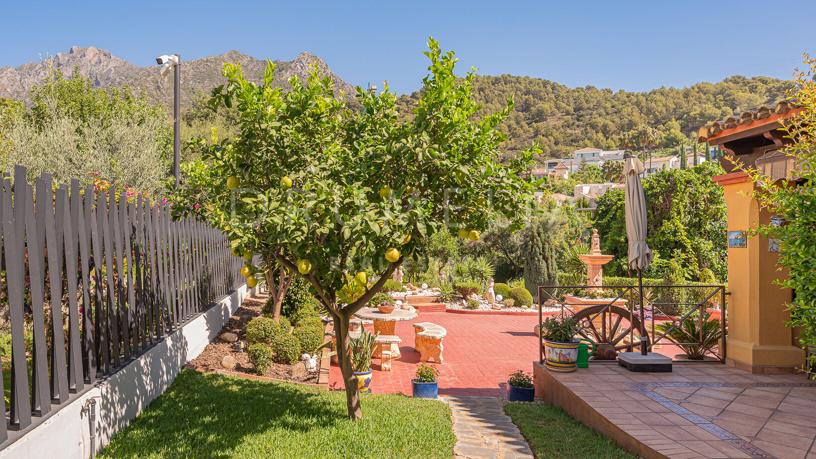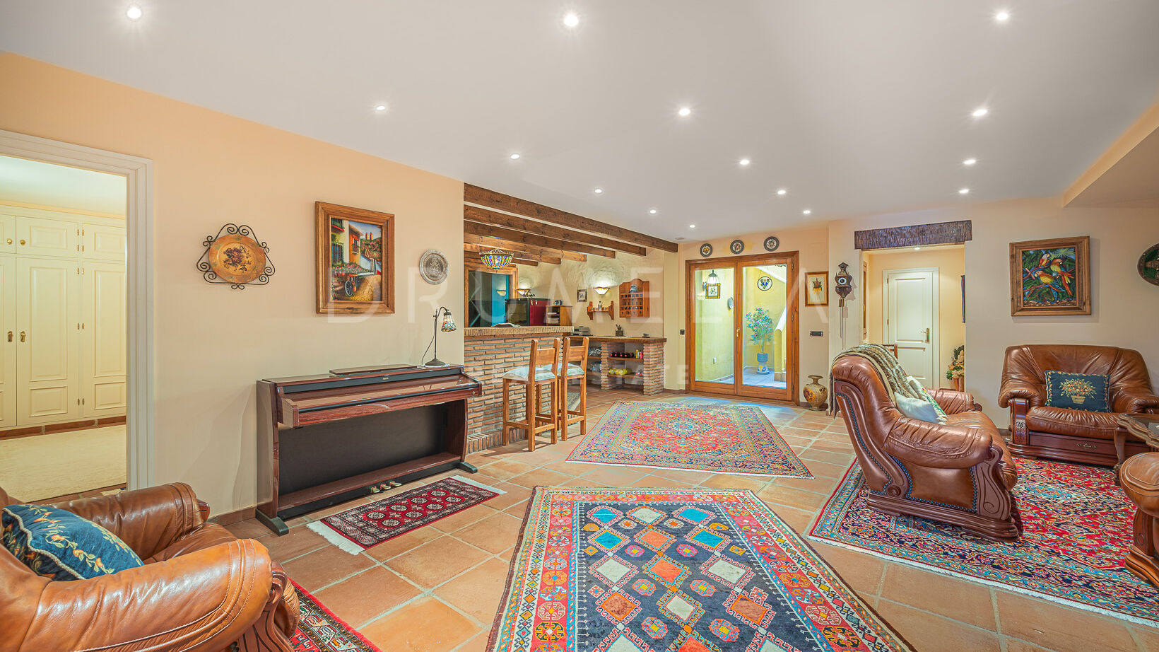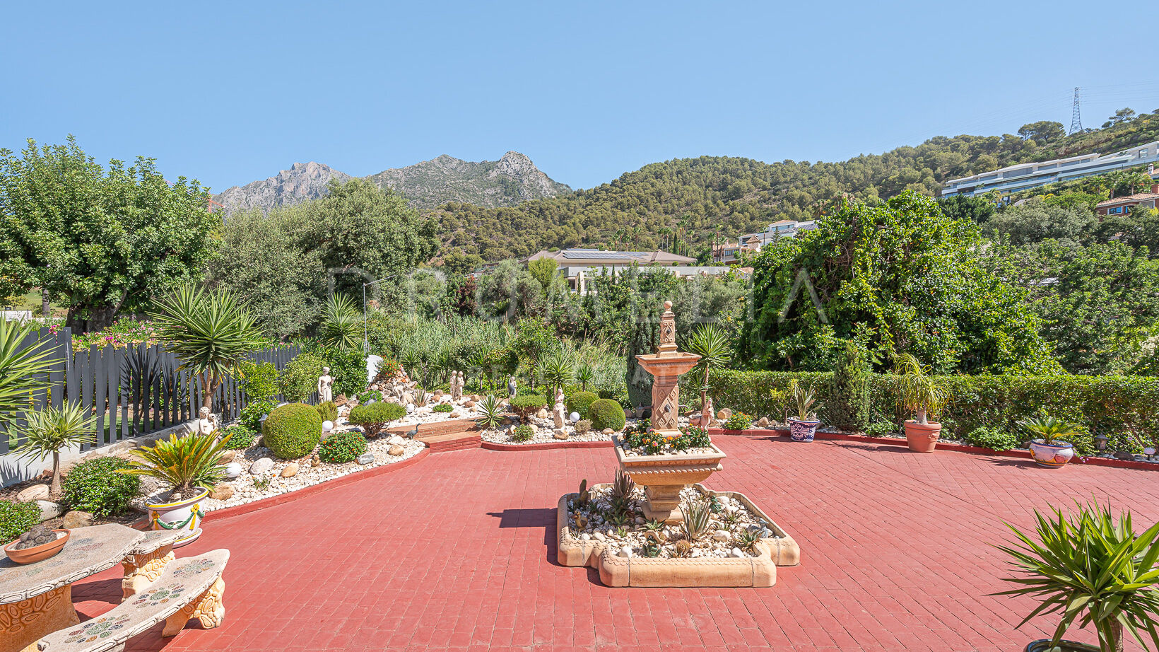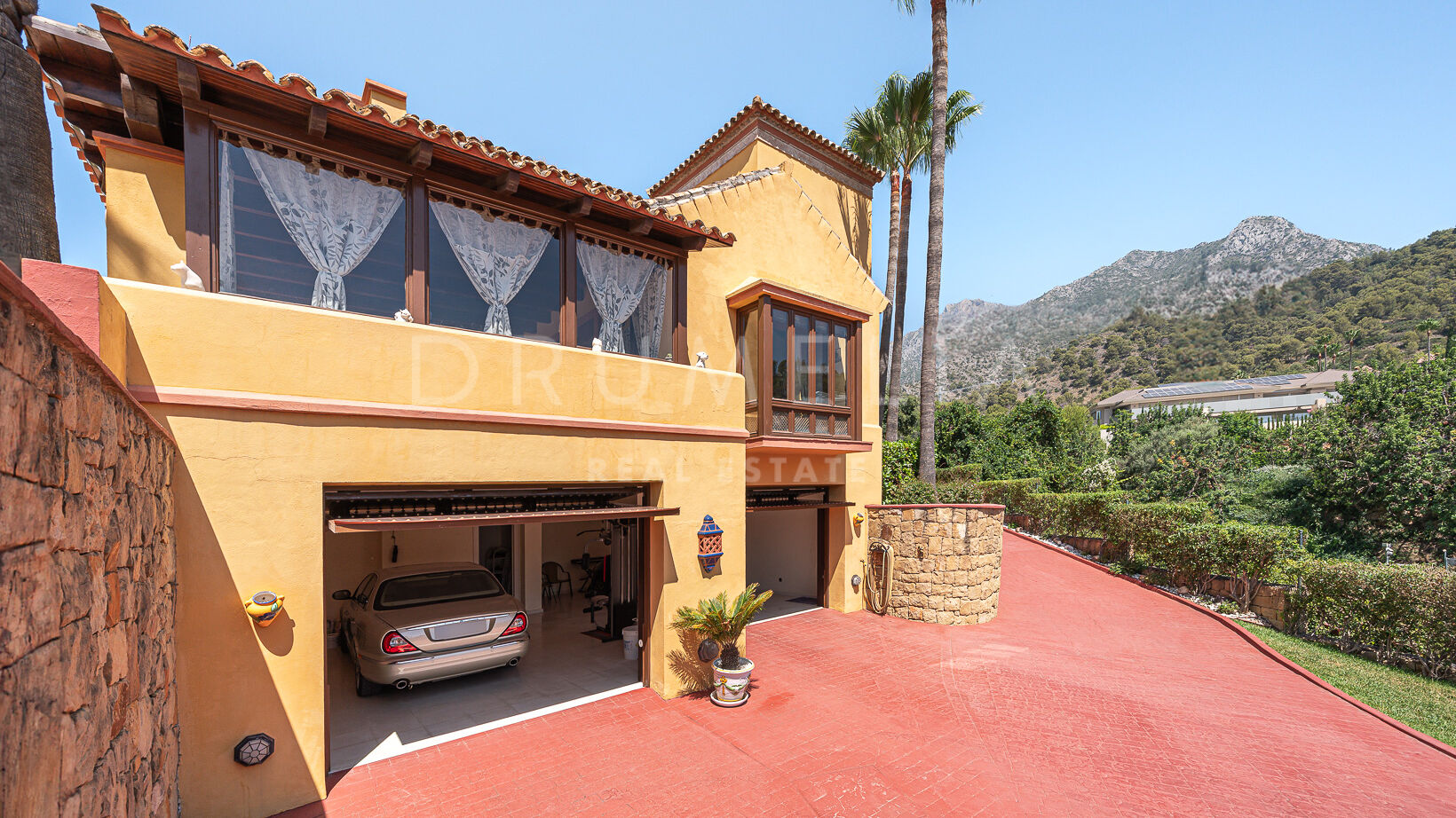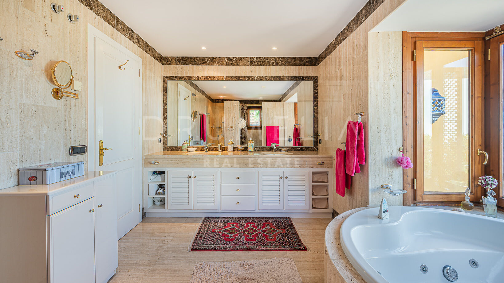 Entourée d’une nature luxuriante et des propriétés haut de gamme du Golden Mile, cette extraordinaire maison de 726 m² avec 40 m² de terrasses et un terrain pittoresque de 1 480 m² illustre l’élégance et le style méditerranéens. Exposée au sud, elle bénéficie d’une lumière naturelle abondante et d’une vue imprenable sur la mer et la légendaire montagne de La Concha, parfaitement complétée par une vue agréable sur le jardin avec une piscine à débordement. Impeccablement conçue sur 3 niveaux, la villa dégage une grâce intemporelle avec son marbre blanc immaculé et ses finitions en bois de qualité supérieure. Dès l’entrée, un grand hall avec double hauteur de plafond vous invite à pénétrer dans l’aile centrale de la salle de séjour, qui a pour point d’ancrage une cheminée et qui dégage un véritable chic classique. Le salon mène à la magnifique terrasse principale et aux jardins subtropicaux magnifiquement aménagés avec des pelouses vertes et de grands palmiers. Cette maison offre plusieurs espaces extérieurs et terrasses, couvertes ou ensoleillées, ainsi qu’un charmant patio avec une fontaine de style traditionnel. Idéal pour profiter de la vie méditerranéenne la plus agréable, organiser des soirées sous les étoiles, des barbecues entre amis et d’inoubliables dîners en famille à la belle étoile ! Sur la gauche, un charmant gazebo vous attend, et la terrasse couverte avec ses plafonds en bois marie harmonieusement l’intérieur et l’extérieur. L’espace de vie spacieux fusionne avec la salle à manger, qui s’étend jusqu’à un charmant espace barbecue. La cuisine rustique à la mode, avec un coin repas intégré, des appareils Siemens et Gaggenau, et une buanderie adjacente, est également reliée à une terrasse extérieure. Cet étage comprend une suite de chambre à coucher.