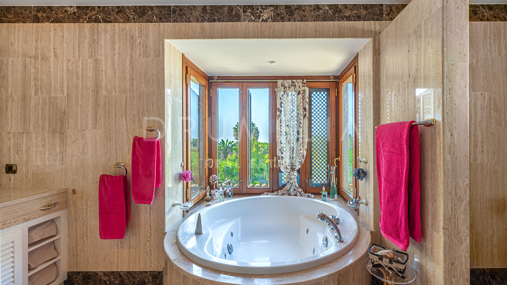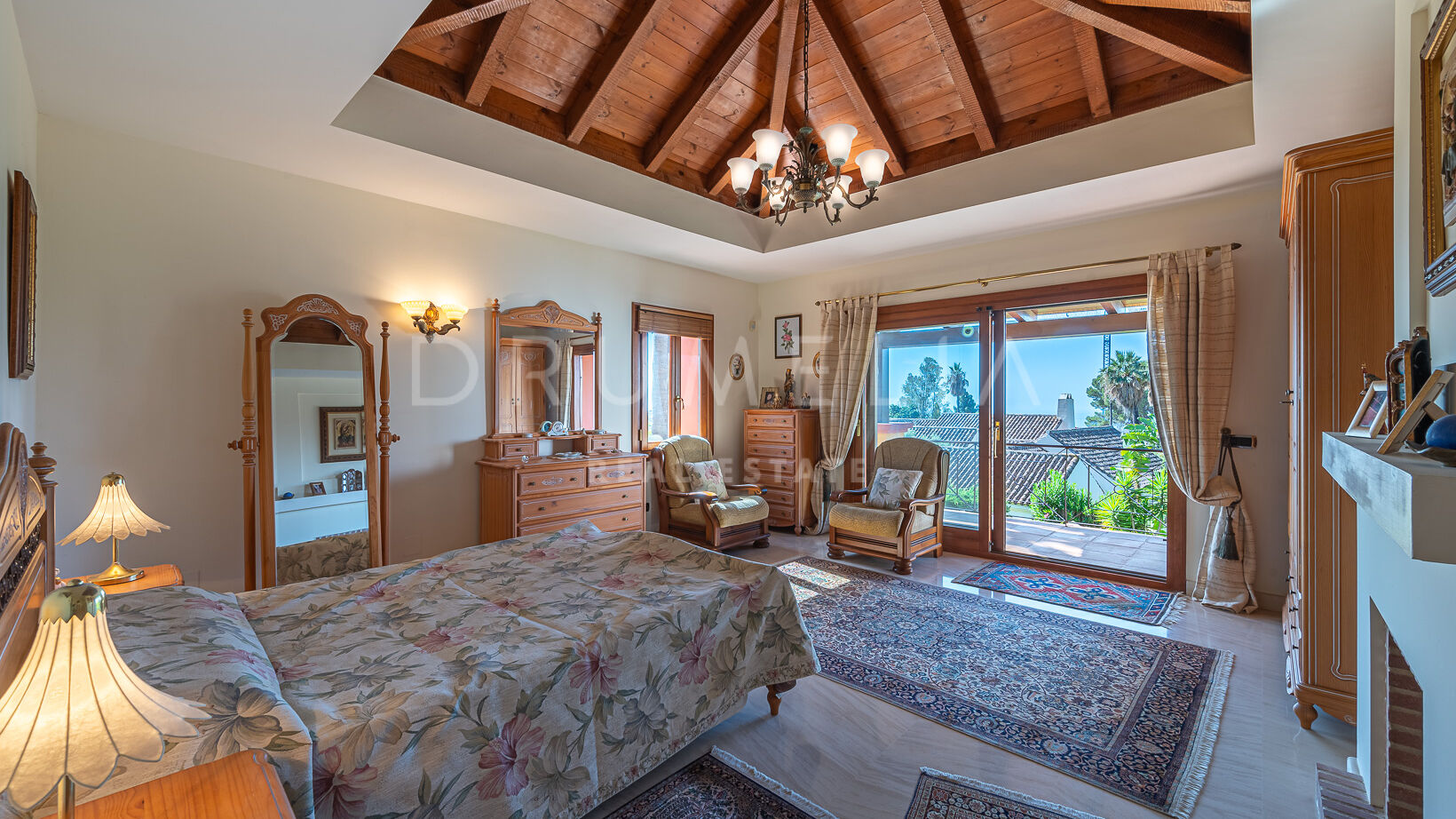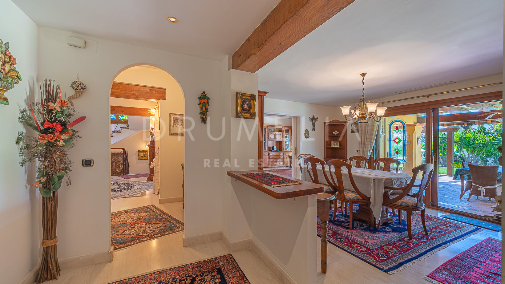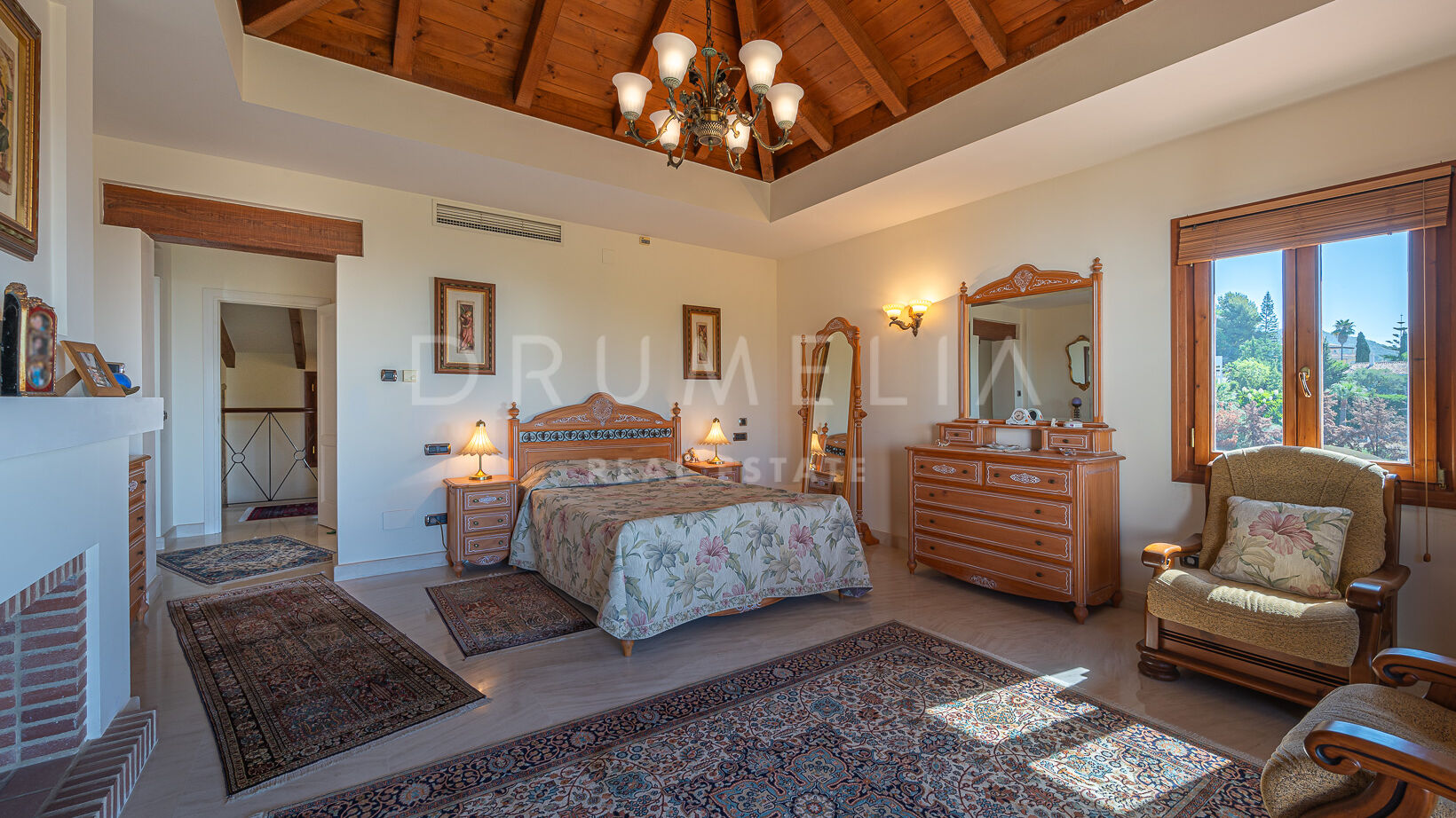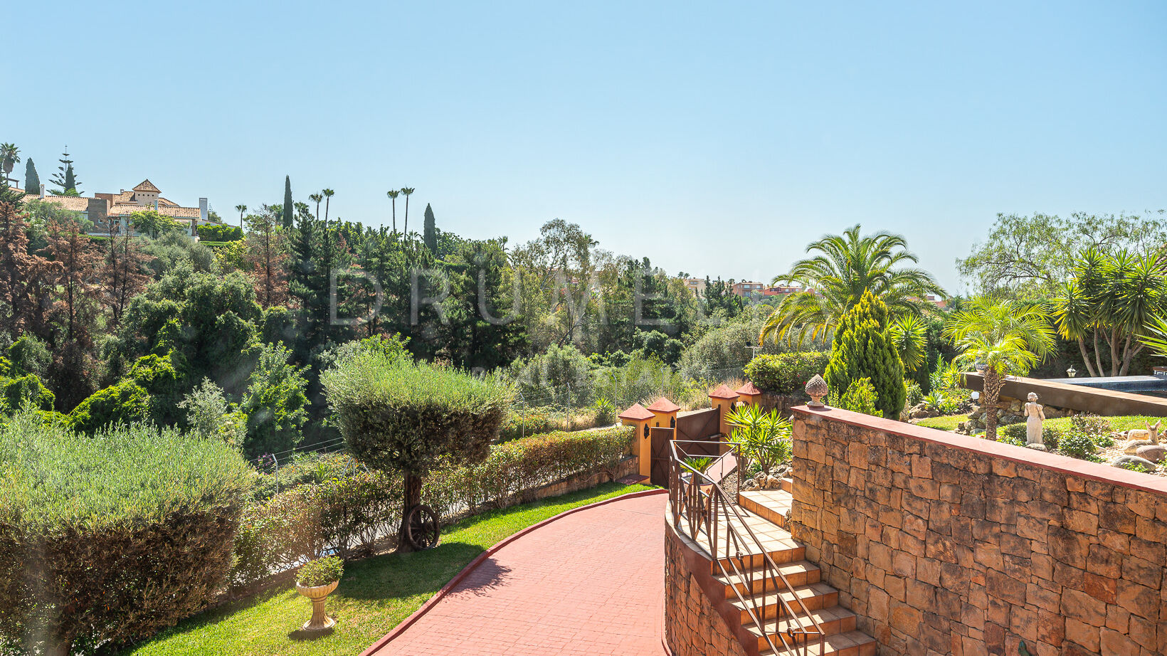 Entourée d’une nature luxuriante et des propriétés haut de gamme du Golden Mile, cette extraordinaire maison de 726 m² avec 40 m² de terrasses et un terrain pittoresque de 1 480 m² illustre l’élégance et le style méditerranéens. Exposée au sud, elle bénéficie d’une lumière naturelle abondante et d’une vue imprenable sur la mer et la légendaire montagne de La Concha, parfaitement complétée par une vue agréable sur le jardin avec une piscine à débordement. Impeccablement conçue sur 3 niveaux, la villa dégage une grâce intemporelle avec son marbre blanc immaculé et ses finitions en bois de qualité supérieure. Dès l’entrée, un grand hall avec double hauteur de plafond vous invite à pénétrer dans l’aile centrale de la salle de séjour, qui a pour point d’ancrage une cheminée et qui dégage un véritable chic classique. Le salon mène à la magnifique terrasse principale et aux jardins subtropicaux magnifiquement aménagés avec des pelouses vertes et de grands palmiers. Cette maison offre plusieurs espaces extérieurs et terrasses, couvertes ou ensoleillées, ainsi qu’un charmant patio avec une fontaine de style traditionnel. Idéal pour profiter de la vie méditerranéenne la plus agréable, organiser des soirées sous les étoiles, des barbecues entre amis et d’inoubliables dîners en famille à la belle étoile ! Sur la gauche, un charmant gazebo vous attend, et la terrasse couverte avec ses plafonds en bois marie harmonieusement l’intérieur et l’extérieur. L’espace de vie spacieux fusionne avec la salle à manger, qui s’étend jusqu’à un charmant espace barbecue. La cuisine rustique à la mode, avec un coin repas intégré, des appareils Siemens et Gaggenau, et une buanderie adjacente, est également reliée à une terrasse extérieure. Cet étage comprend une suite de chambre à coucher.