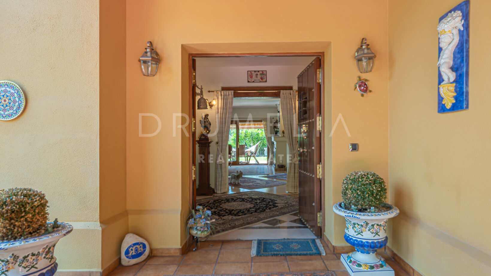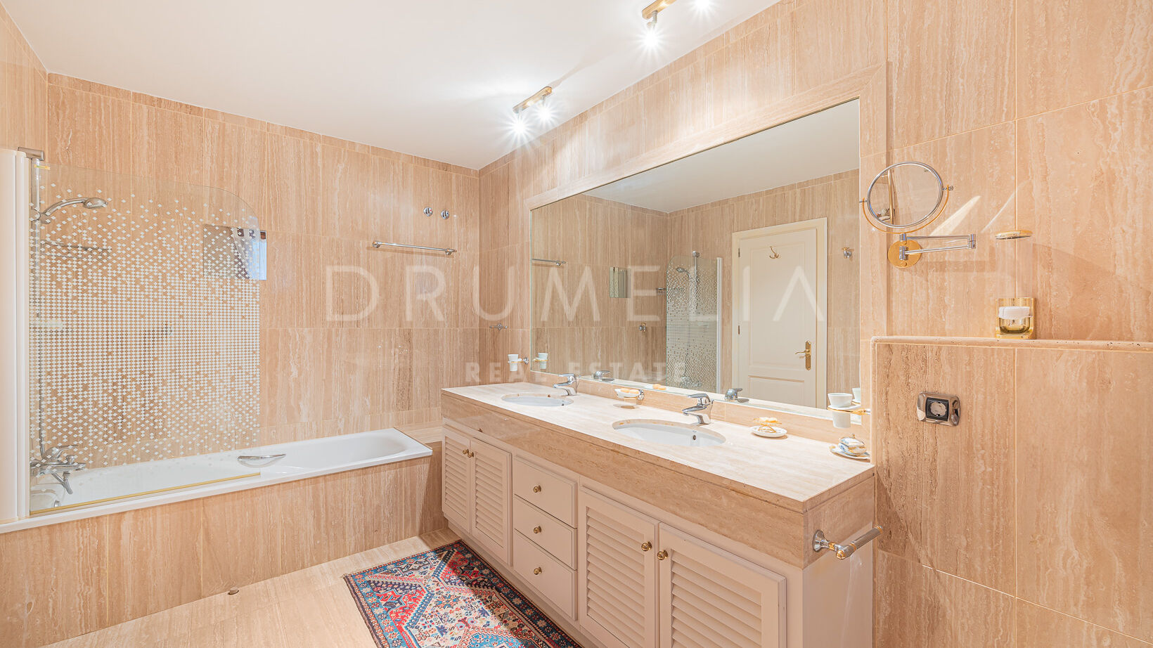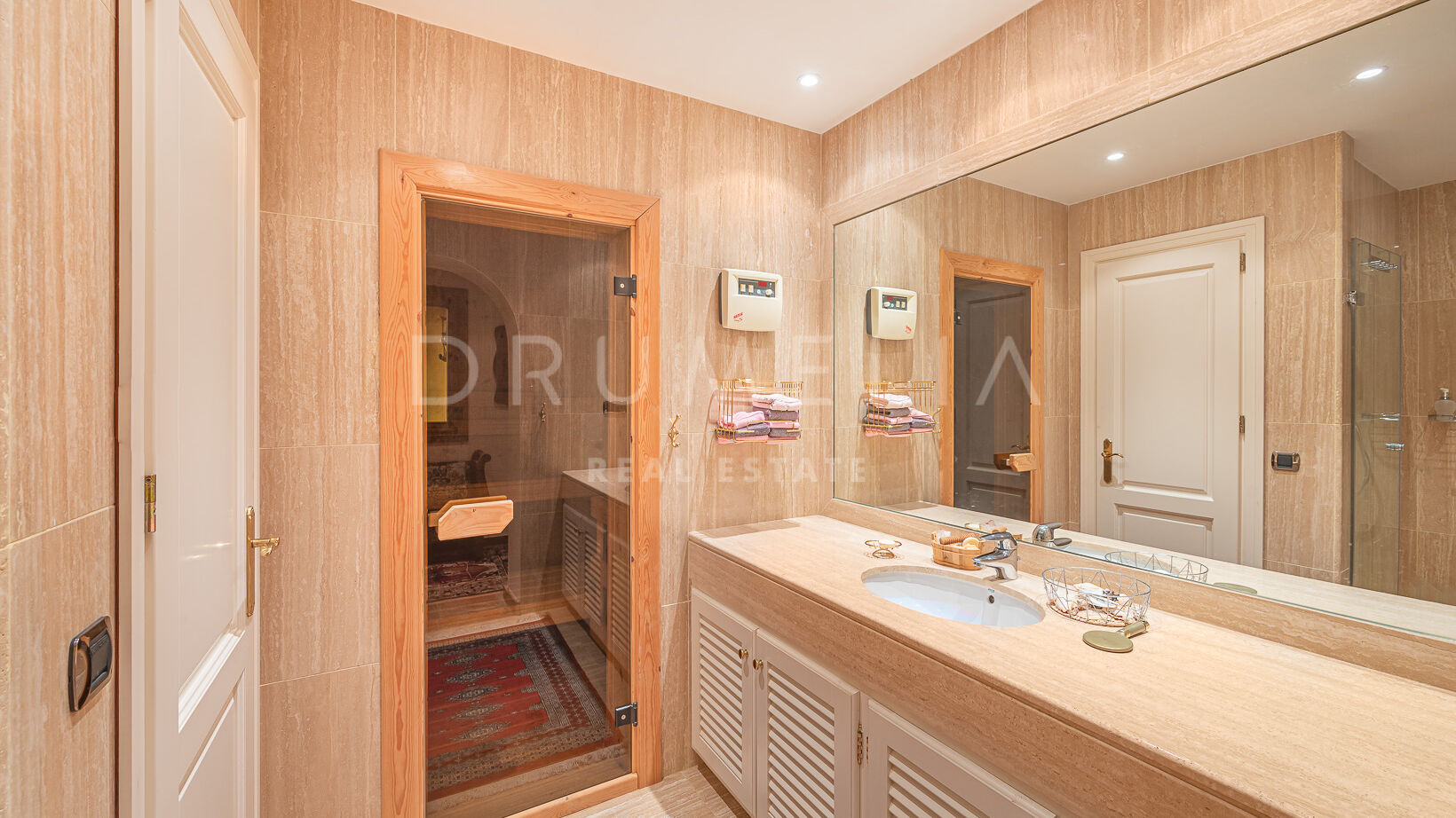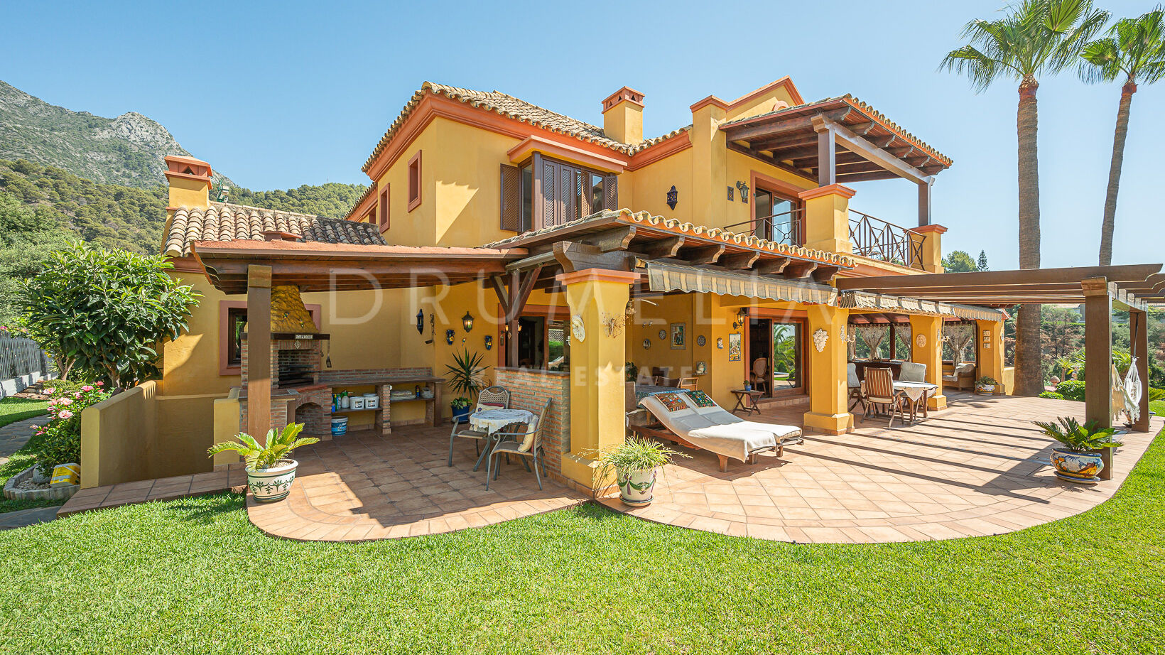 Entourée d’une nature luxuriante et des propriétés haut de gamme du Golden Mile, cette extraordinaire maison de 726 m² avec 40 m² de terrasses et un terrain pittoresque de 1 480 m² illustre l’élégance et le style méditerranéens. Exposée au sud, elle bénéficie d’une lumière naturelle abondante et d’une vue imprenable sur la mer et la légendaire montagne de La Concha, parfaitement complétée par une vue agréable sur le jardin avec une piscine à débordement. Impeccablement conçue sur 3 niveaux, la villa dégage une grâce intemporelle avec son marbre blanc immaculé et ses finitions en bois de qualité supérieure. Dès l’entrée, un grand hall avec double hauteur de plafond vous invite à pénétrer dans l’aile centrale de la salle de séjour, qui a pour point d’ancrage une cheminée et qui dégage un véritable chic classique. Le salon mène à la magnifique terrasse principale et aux jardins subtropicaux magnifiquement aménagés avec des pelouses vertes et de grands palmiers. Cette maison offre plusieurs espaces extérieurs et terrasses, couvertes ou ensoleillées, ainsi qu’un charmant patio avec une fontaine de style traditionnel. Idéal pour profiter de la vie méditerranéenne la plus agréable, organiser des soirées sous les étoiles, des barbecues entre amis et d’inoubliables dîners en famille à la belle étoile ! Sur la gauche, un charmant gazebo vous attend, et la terrasse couverte avec ses plafonds en bois marie harmonieusement l’intérieur et l’extérieur. L’espace de vie spacieux fusionne avec la salle à manger, qui s’étend jusqu’à un charmant espace barbecue. La cuisine rustique à la mode, avec un coin repas intégré, des appareils Siemens et Gaggenau, et une buanderie adjacente, est également reliée à une terrasse extérieure. Cet étage comprend une suite de chambre à coucher.