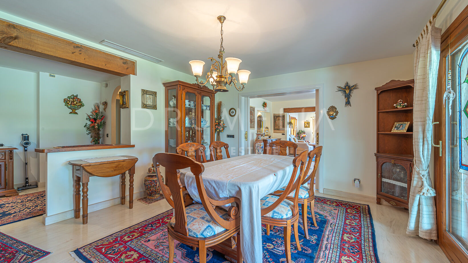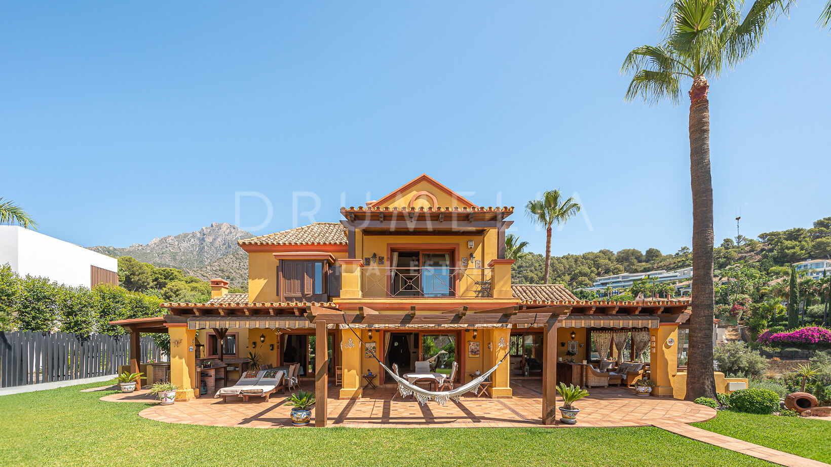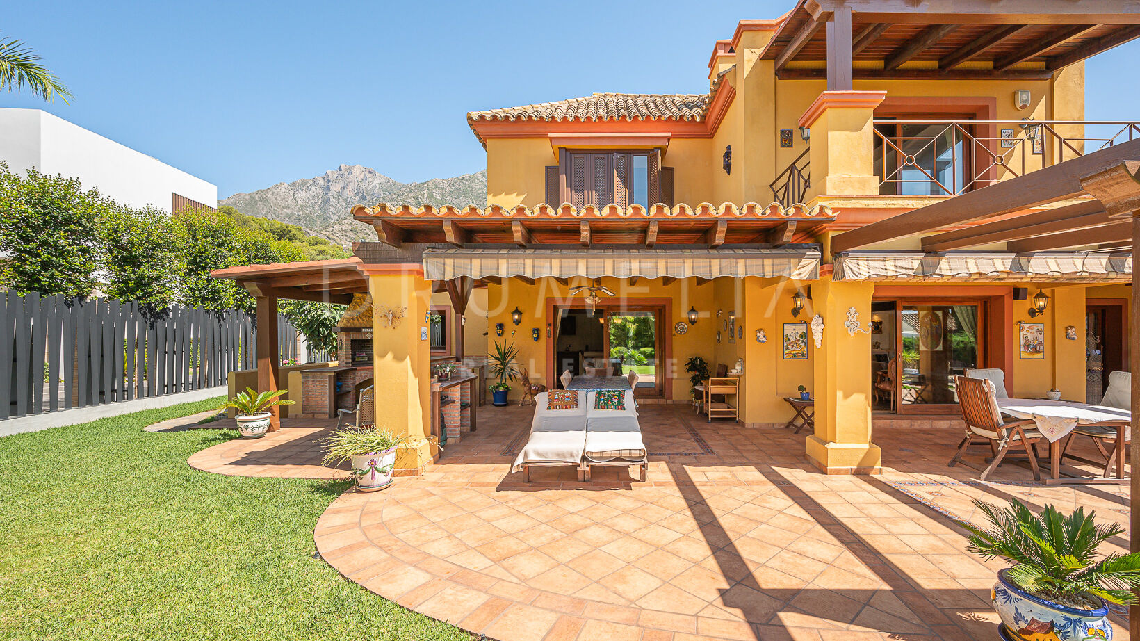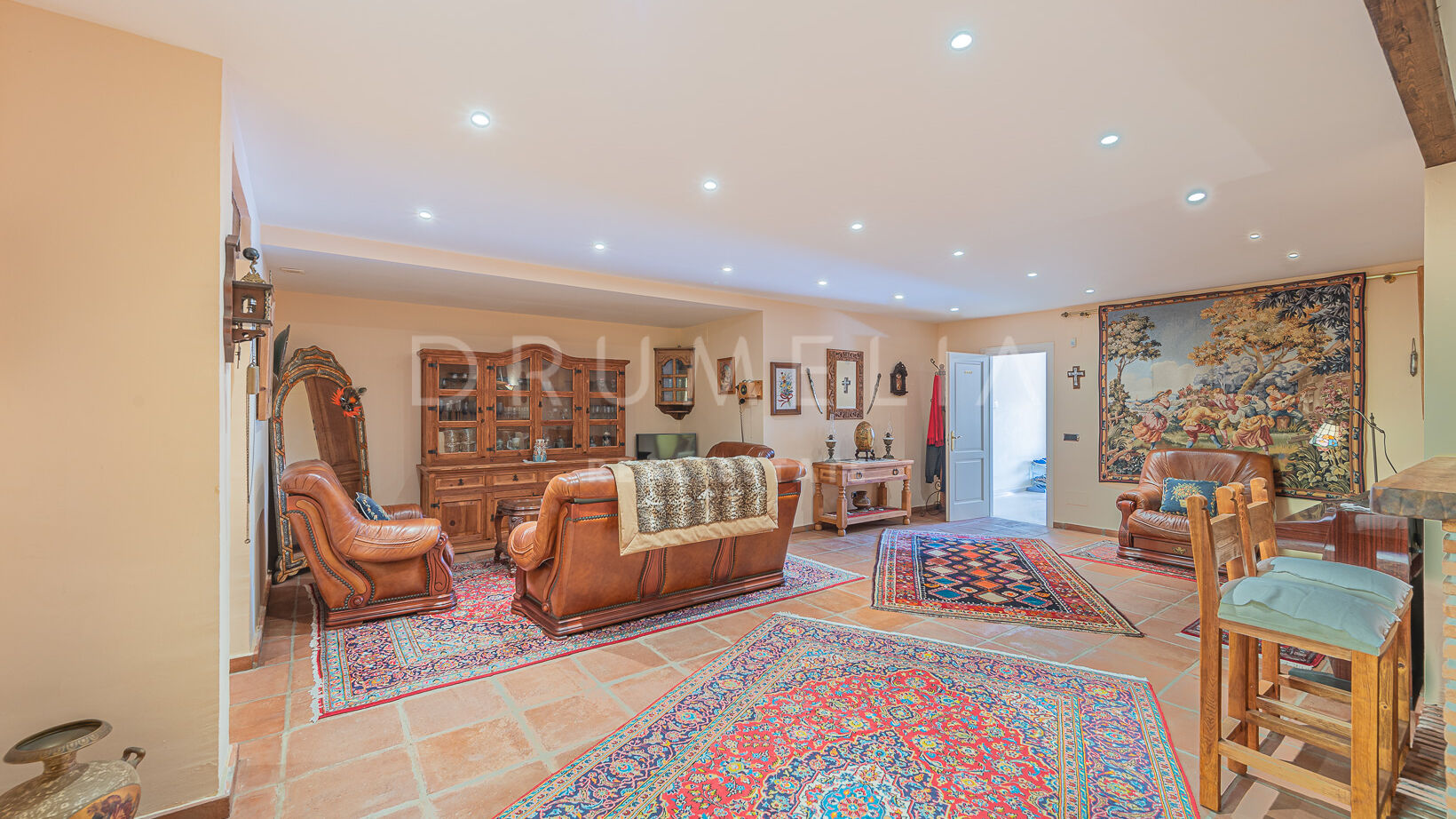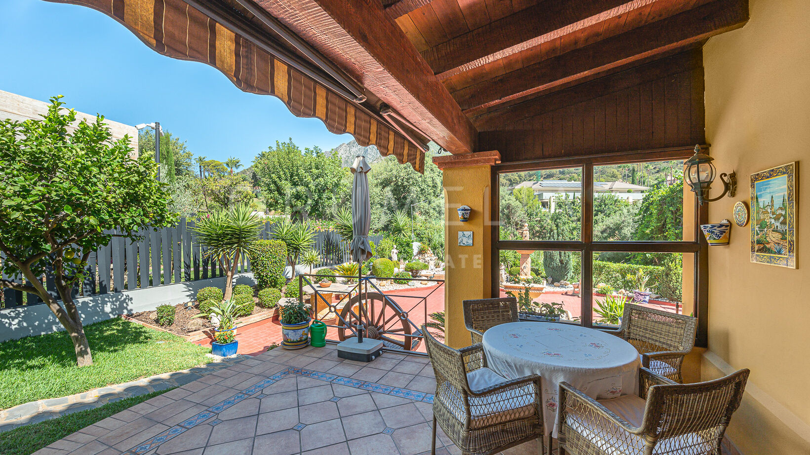 Entourée d’une nature luxuriante et des propriétés haut de gamme du Golden Mile, cette extraordinaire maison de 726 m² avec 40 m² de terrasses et un terrain pittoresque de 1 480 m² illustre l’élégance et le style méditerranéens. Exposée au sud, elle bénéficie d’une lumière naturelle abondante et d’une vue imprenable sur la mer et la légendaire montagne de La Concha, parfaitement complétée par une vue agréable sur le jardin avec une piscine à débordement. Impeccablement conçue sur 3 niveaux, la villa dégage une grâce intemporelle avec son marbre blanc immaculé et ses finitions en bois de qualité supérieure. Dès l’entrée, un grand hall avec double hauteur de plafond vous invite à pénétrer dans l’aile centrale de la salle de séjour, qui a pour point d’ancrage une cheminée et qui dégage un véritable chic classique. Le salon mène à la magnifique terrasse principale et aux jardins subtropicaux magnifiquement aménagés avec des pelouses vertes et de grands palmiers. Cette maison offre plusieurs espaces extérieurs et terrasses, couvertes ou ensoleillées, ainsi qu’un charmant patio avec une fontaine de style traditionnel. Idéal pour profiter de la vie méditerranéenne la plus agréable, organiser des soirées sous les étoiles, des barbecues entre amis et d’inoubliables dîners en famille à la belle étoile ! Sur la gauche, un charmant gazebo vous attend, et la terrasse couverte avec ses plafonds en bois marie harmonieusement l’intérieur et l’extérieur. L’espace de vie spacieux fusionne avec la salle à manger, qui s’étend jusqu’à un charmant espace barbecue. La cuisine rustique à la mode, avec un coin repas intégré, des appareils Siemens et Gaggenau, et une buanderie adjacente, est également reliée à une terrasse extérieure. Cet étage comprend une suite de chambre à coucher.